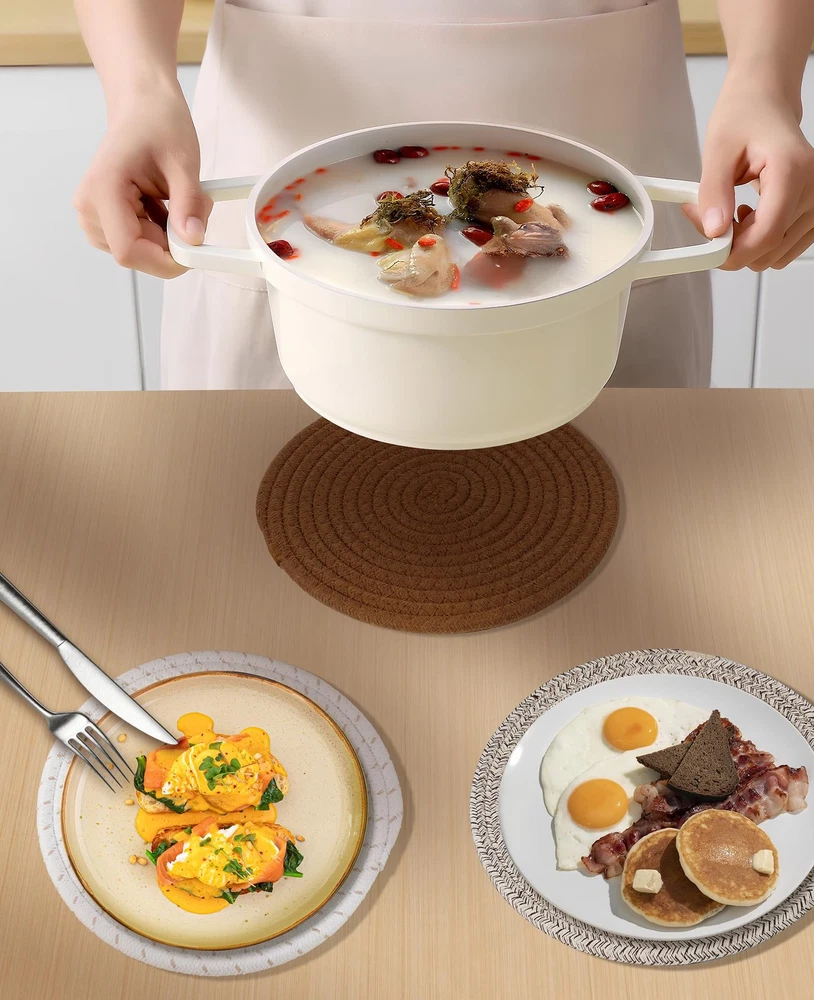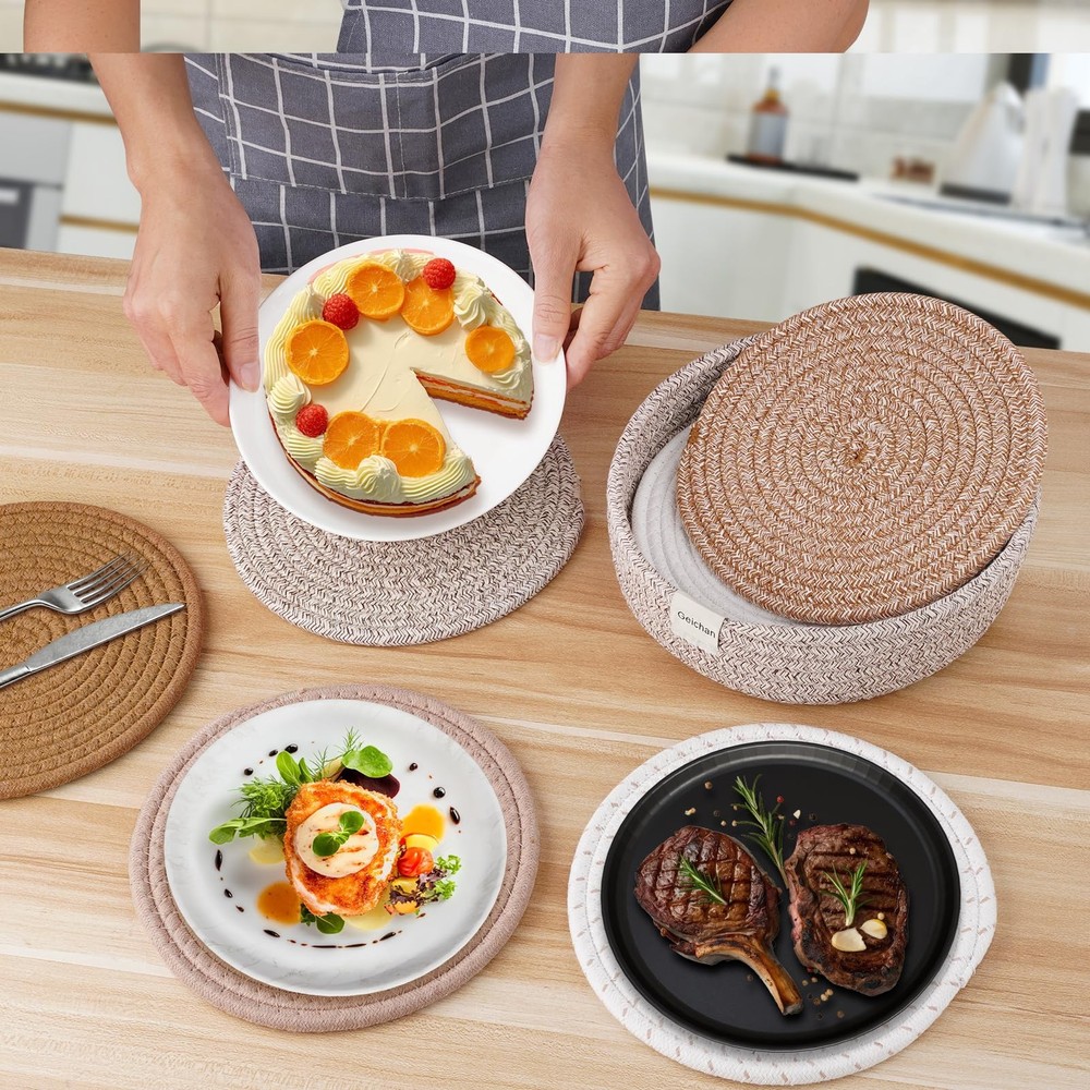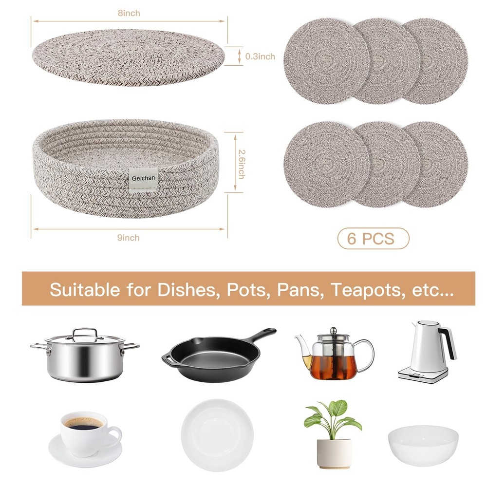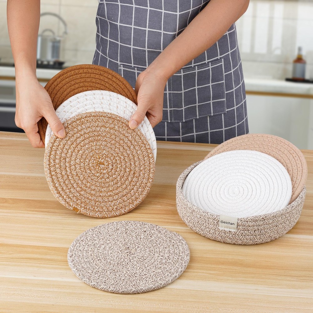 large thickened trivets are made from cotton ropes, which are composed of premium hot-air cotton and Non-Woven fabric inner, heat-resistant, soft touch, water absorbent, good resilience, and slightly flame-retardant. Premium Matiral: large thickened trivets are woven from 100% natural cotton ropes, which are composed of premium hot-air cotton and Non-Woven fabric inner, it has stronger heat resistance than silicone pads,water absorbent,soft touch, good resilience, and slightly flame-retardant and better protection of the wood surface from water rings, stains and potential damageIt is ideal for use with hot or cold containers. These trivets are built to last and can be used repeatedly, ensuring you get great value for your cost Ideal Product: All sewn by sewing machine handmade, with a thickness of 0.35 inches (0.76 cm), trivets offer effective heat insulation and Water absorption. The 8 inch (20.32cm) diameter is perfect for placing dishes, pans,pots, and even plants. Come with a 11 inch (28 cm) diameter kitchen storage basket, which easily stores trivets, put door key or other small objects,places various bobs, or be used as a fruit basket Protect Your Tabletop: Water absorption, our placemats are designed to protect your table or countertop from damage caused by hot dishes, pans or pots. They also help prevent scratches and stains, keeping your surfaces stay looking as good as new.Upgrade your kitchen decor now! Easy Care: For normal cleaning, simply wipe with a damp cloth to remove surface stains. Hand wash and or wash it in the washing machine, don't worry, it's sturdy and easy to dry.A must-have kitchen essentials you will need Versatile Use: They are a mix of boho and rustic farmhouse styles. You can use the pads as wall decoration or under potted plants, the mats can be incorporated into a variety of scenes.Double sided available.kitchen trivets can be used as a drying mat, trivet, utensil rest, placemat, coaster, beer cushions, farmhouse lace mats,remote controls, pens, stationary They’re the perfect Bridal Shower gift, Hostess gift, Holiday Gift, Birthday gift, Mother's Day Gift,Christmas Gift, Housewarming Gift for your Wife, Sister, Daughter, Mother, Grandma,Friend and more