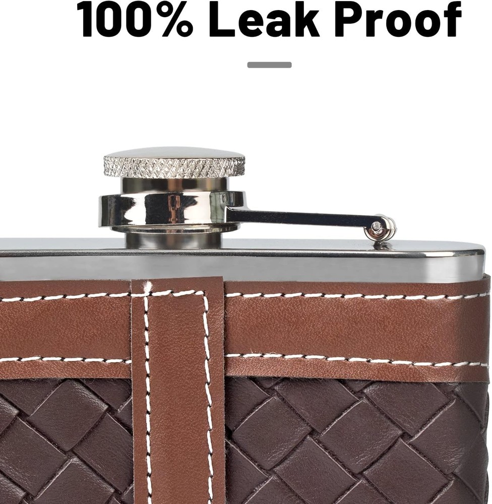 This hip flask is a fantastic gift! The dark brown leather stripe gives it a classic, stylish look, and the stainless steel interior keeps drinks fresh. The included funnel and shot glasses make it super convenient, and the polished finish feels premium. Perfect size for carrying, and the packaging makes it ready to gift. Sturdy, well-designed, and practical—definitely worth it!