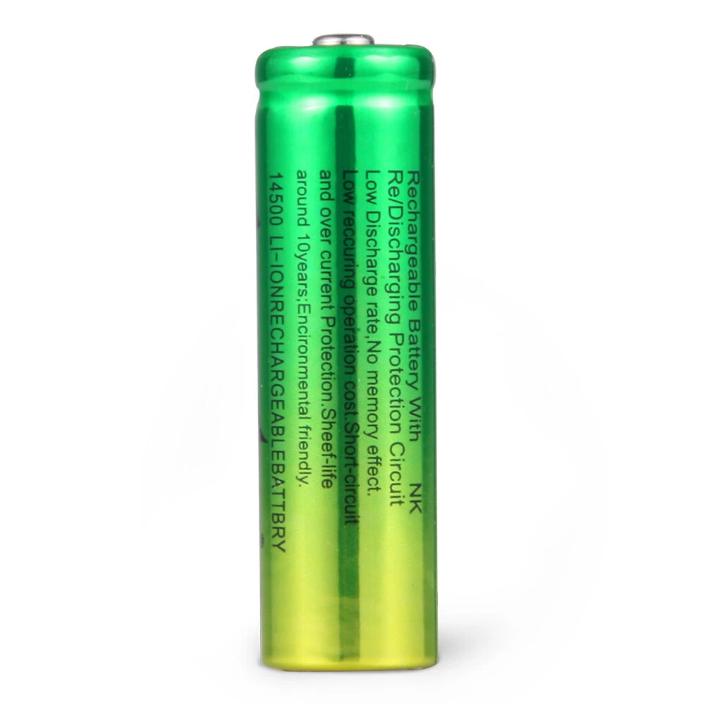 Introductions: Do you want the economical and greener lifestyles. Maybe you should start from minor matter, and just like use the rechargeable batteries. Rechargeable batteries adopt universal standards, most of them suitable for cameras, toys and many other electronic devices. Except that, it features extensively long working life and high efficiency, great for use. And it is compact and rechargeable, so you can carry it anywhere anytime, convenient to use. The number of charge cycles is about 1000 times, durable and reliable! Features: 1. New battery 2. High quality and durable 3. Provides excellent continuous power sources to your device 4. High energy density, long life battery 5. This battery has an extra long life for all your battery powered devices 6. Fit for camera, MP3/MP4 Player, electronic toys and other electronic devices Specifications: 1. Battery Type: 14500 Rechargeable Lithium battery 2. Rechargeable Time: about 3 hours 3. Battery capacity: 1200mAH 4. Battery voltage: 3.7V 5. Battery color: Green 6. Brand:SkyWolfEye 7. each Weight: 17 g / 0.6 oz 8. Per Dimensions: 5x1.4 cm / 1.97x0.55 inch (H x Dia.) 828M Four-slot lithium battery charger Description: * LED indicator shows current charging status. * Connect power indicator light: Red light * Charging indicator light: Red light * Full charge indicator light: Green light * Plug type: US plug * Suitable for: 186'50 16340 14500 26650 Lithium rechargeable battery * Automatically stops when charging is complete. * Can charge four batteries at the same time. * Color: Black Package Included: 8pcs 14500 battery 1pc 4 Slot Charger