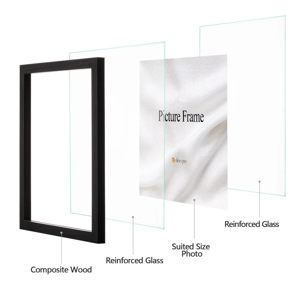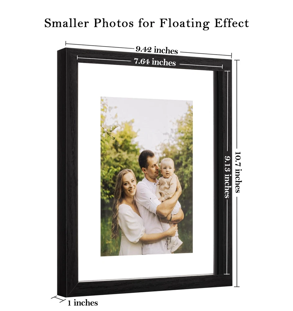 Floating picture frame Size: 8 x 10 inch Color: Black Multi Size: 8x10 floating picture frame has two pieces of reinforced glass, allowing you to float display 3.5x5, 4x4, 4x6 and 5x7 photos for the see-through floating effect. Or display 8x10 photo without the floating effect Design: These floating frames have two pieces of glass, which can perfectly display and protect your photos, and can insert 2 photos back to back at the same time Multi-Function: Our floating photo frames are great for displaying pressed flowers or plants, pictures, artworks, certificates, diplomas, documents, prints, postcards, and more Easy to Install: Floating picture frames are a breeze to set up - simply clamp your photos, flowers, certificates, artworks or other mementos between the two pieces of glass and insert them into the frame Thoughtful Accessories: Glasses cloth used to wipe the glass to avoid dirty glass, foam pad used to prevent the glass from slipping