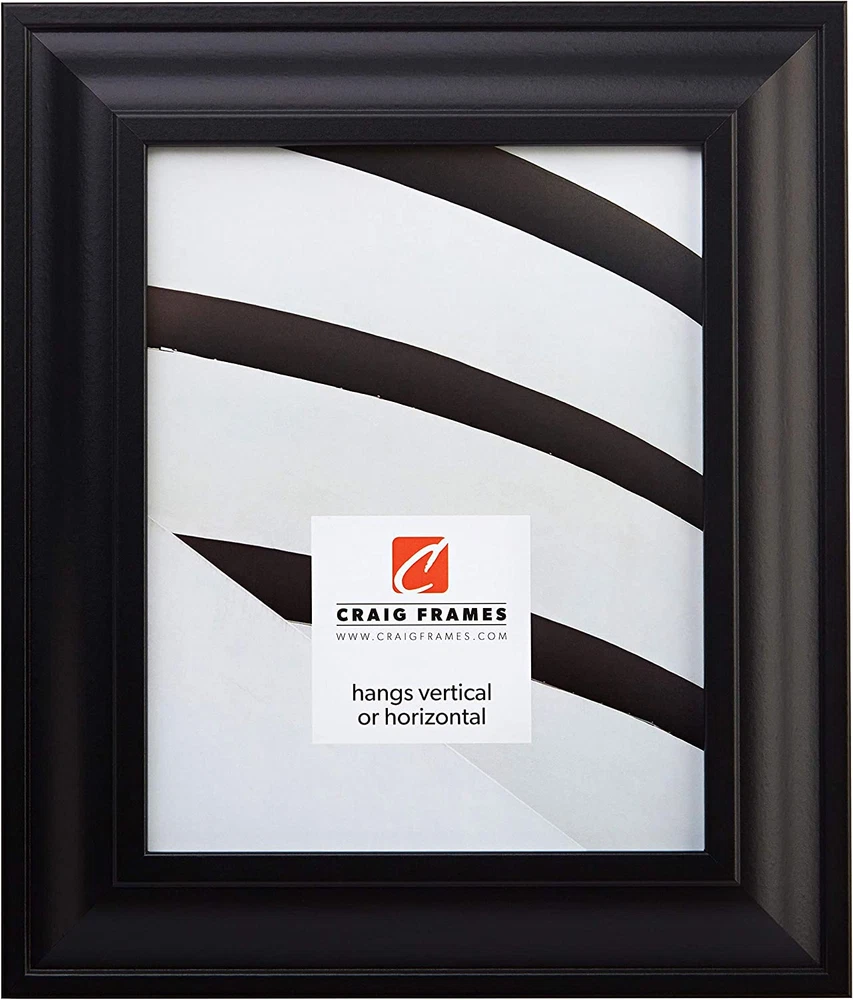 Contemporary style; black with smooth finish Frame includes: glass, rigid black backing and pre-attached stamped hanging hardware Frame holds a 8 inch by 10 inch photo/print (viewable area is slightly smaller) Frame moulding is 2 inches wide; wood composite material Made in the U.S.A. Product Description Craig Frames American-made & Trusted for Over 30 years Craig Frames offers hundreds of styles and sizes. Our products include picture frames, poster frames, photo frames, collage frames, document frames, framed maps, matting, bulletin boards, & more. A Trusted Brand & US Manufacturer Offering a Vast Selection of High Quality Home Décor Products Enjoy a vast selection of highly rated, affordable, professional quality picture frames and poster frames for wall hanging or table top use. Craig Frames also offers 2-Packs & 4-Packs for gallery wall sets, large art projects, or wholesale purchases. Styles include Modern, Rustic, Farmhouse, Boho (Bohemian), Ornate, Metallic, Weathered & Distressed, and more. Most frames are available in 30+ popular sizes, and many are available in 500+ custom frame sizes. With more than 45,000 Seller Ratings, thousands of customers continue to enjoy our American-made picture frames for their home décor projects. Living room, bathroom, kitchen, bedroom, nursery, or office; we're confident you'll find the perfect style and size for your decorative project or business needs. Visiting our Brand Store provides a simple, well organized, way to discover framing solutions for every project or occasion. (Click 'Visit the Craig Frames Store' above) Exceptional Value, Selection, Quality, and Service Styles Available Modern, Farmhouse, Contemporary, Rustic, Boho, Antique, Ornate, Weathered, Distressed, Metallic, Natural, & More Sizes Available Most frames are available in 30 or more popular picture frame sizes. 500+ custom frame sizes available in some styles.. Occasions Birthday, Mother's Day, Father's Day, Christmas, Graduation, Baby Shower, Home Renovation, Off to School, & More. Quality American-made in Michigan by professional framers with materials sourced primarily in the USA. Reputation More than 45,000 seller reviews supporting our quality craftmanship and service. Service US based support team providing real-time service & solutions What Customers are Saying "Excellent service, safe packaging." "Actually arrived ahead of estimated delivery date" "Perfect frames for my antique posters! Very nice." "Amazing, better than I had envisioned." "Well packaged and arrived on time in perfect condition" "Sturdy, very well made frames." "Thank you for sending this so fast! It is just what I wanted."