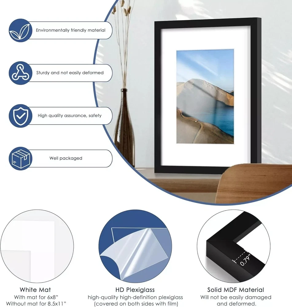 Item Height: Does Not Apply Photo Capacity: 1 Theme: Photo Frame Item Width: 8 in Brand: Branded Type: Photo Frame Color: Black Material: Engineered Wood Mounting: Wall Mounted Occasion: Graduation Item Length: 12 in Frame Type: Poster Frame Pattern: Solid Color Finish: Matte Shape: Rectangle Size: 8 x 12 in Orientation: Horizontal Glass Type: Premium Plexiglass Suitable for Photo Size: 6 x 8 in or 8 x 12 in (without mat)