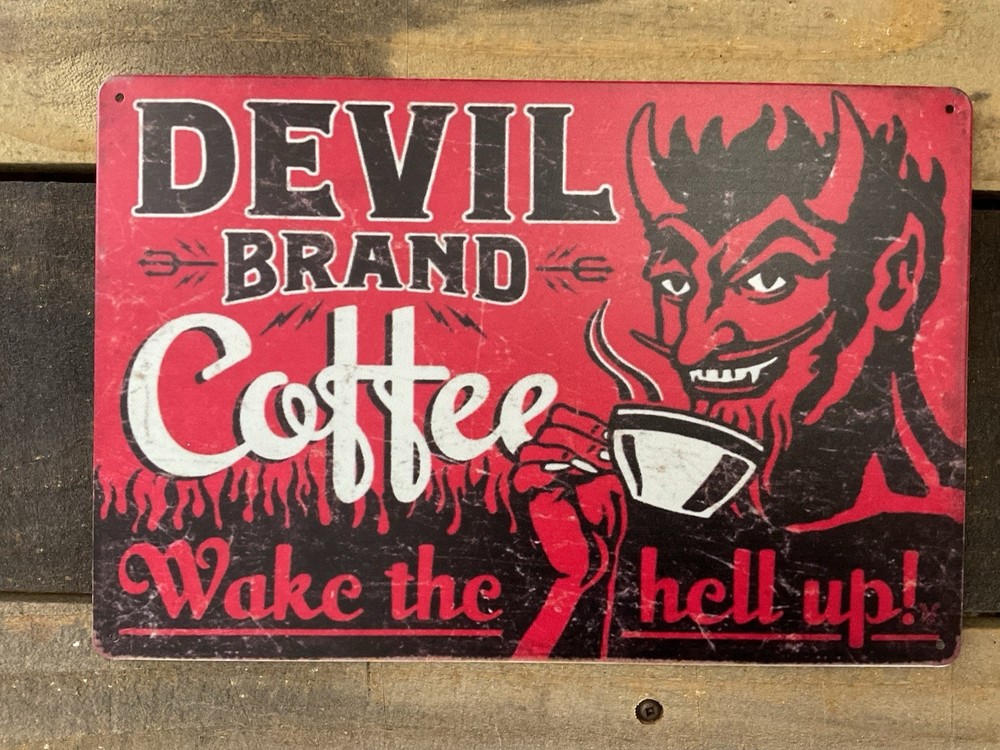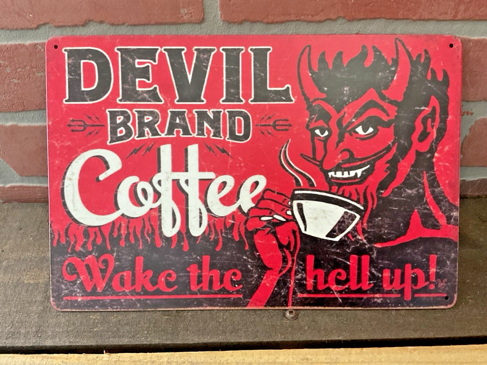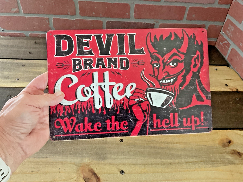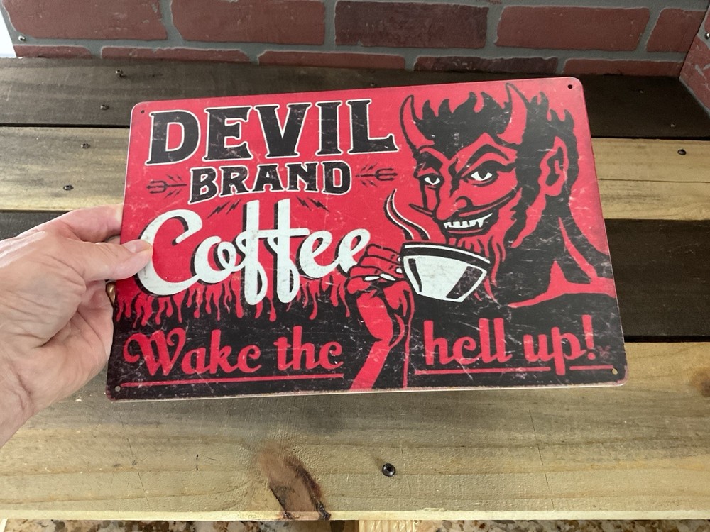 Welcome to Hammering Hanks Garage where everything makes sense... Crafted for the coffee aficionado with a taste for vintage flair, this 8"x12" sign is a playful, yet alarming nod to the classic café aesthetic. Featuring the bold text "Wake the Hell Up" accompanied by a whimsical devil brand logo, it serves as an eye-catching piece that's perfect for any space that celebrates the joy of a well-brewed cup. The sign boasts a retro style, evoking the charm of an earlier era, while remaining an ideal addition to modern-themed rooms. With its durable construction, rolled edges for stability, and 4 predrilled holes for easy mounting, this sign is designed to bring a touch of personality and warmth to your home, office, or kitchen! It's also a unique gift or personal keepsake for anyone with a passion for coffee and vintage decor. We offer free same day shipping. Grab yours today!
