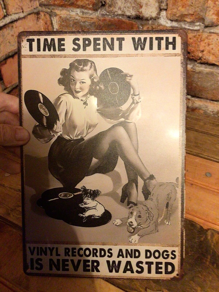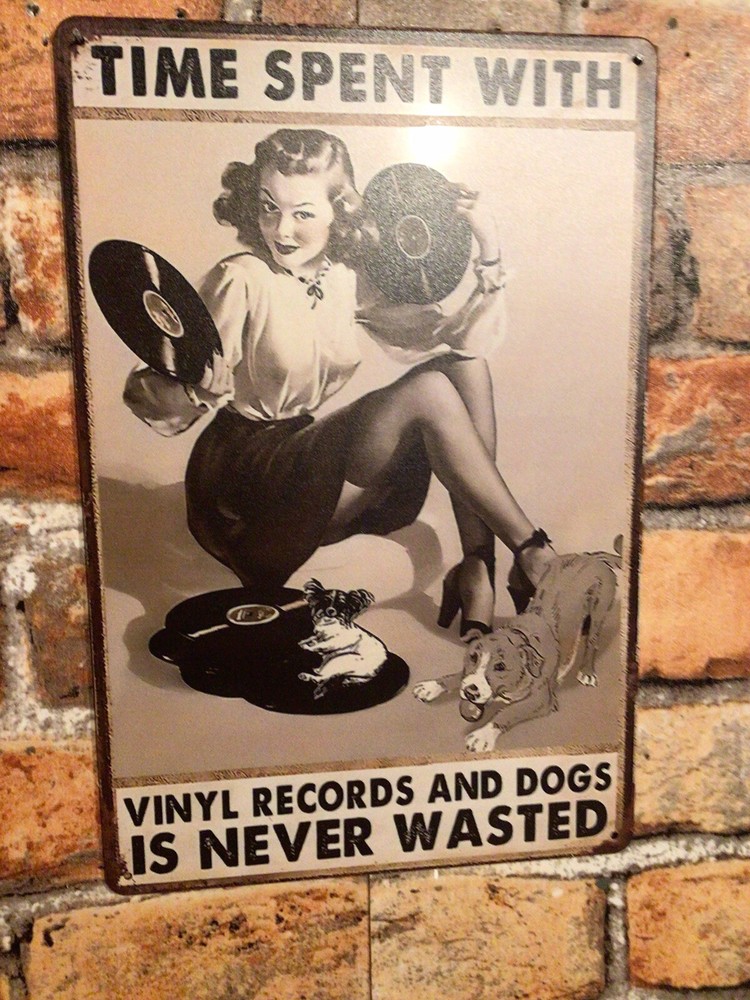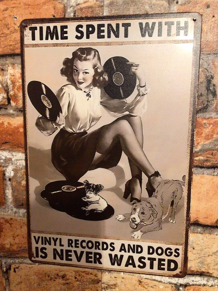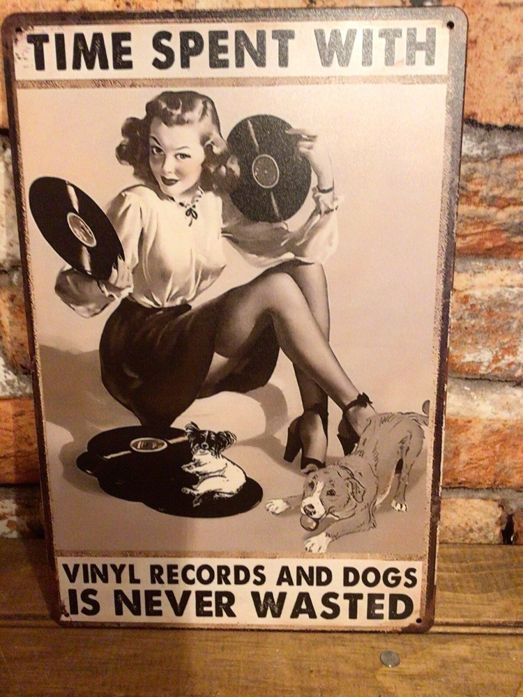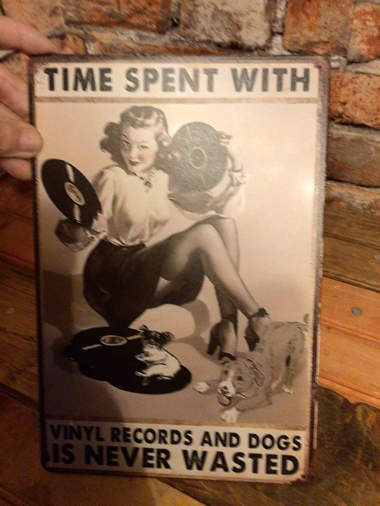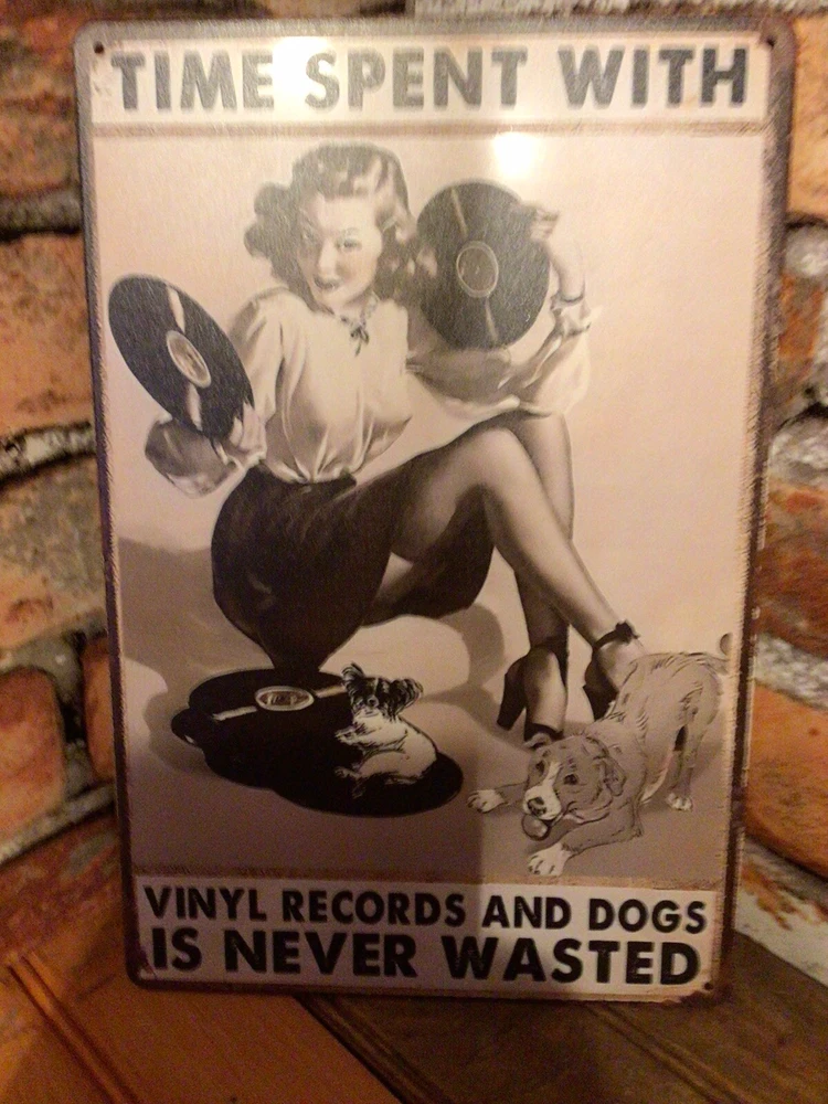 Crafted for fans of vinyl records and canines alike, this 8"x12" sign exudes a retro vibe that effortlessly complements any space. The charming phrase "Time Spent with Vinyl Records and Dogs is Never Wasted" encapsulates the joy of the long ago beauty of listening to vinyl records with the family dog, making it a delightful addition to your home or office. With timeless design and roller edges for stability, this sign seamlessly blends with various decors while celebrating your love for music and furry friends. Whether it's a statement piece for your entertainment area or a thoughtful gift for a fellow aficionado, this sign is sure to be treasured.