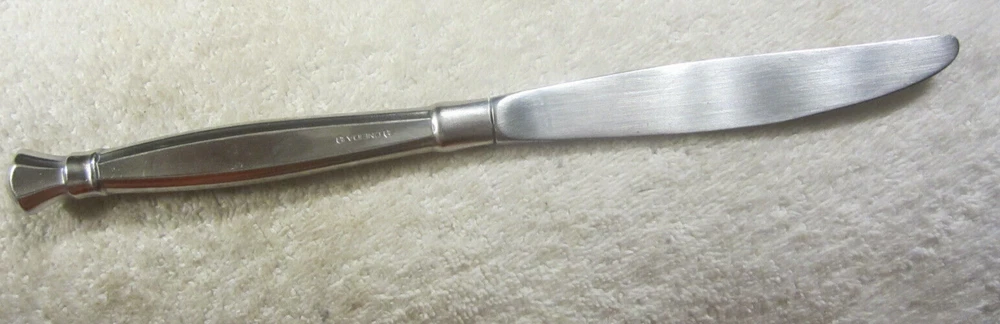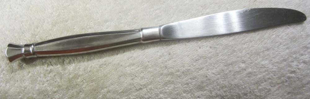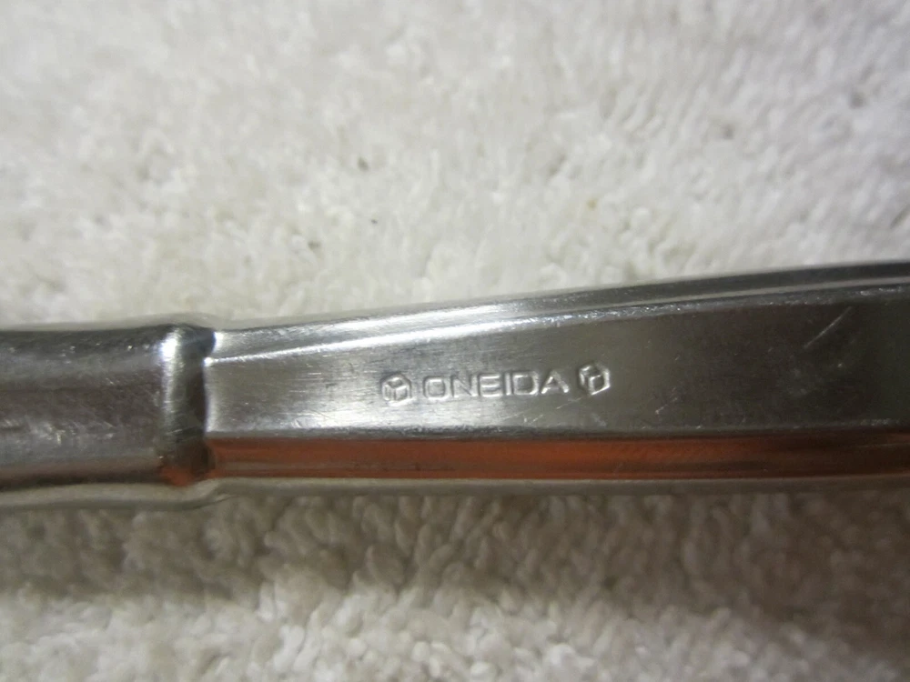 Brand: ONEIDA Handle Material: Stainless Steel Handle Pattern: Bands and Flat Edges Non-Domestic Product: No Color: Silver Model: Heirloom Item Weight: 2 oz UPC: does not apply Type: Dinner Knife Manufacturer Warranty: na Country/Region of Manufacture: Unknown Style: Mid-Century Modern Material: Stainless Steel Seller Notes: “Normal use wear and light scratching in good usable shape.” Item Length: 9 1/4" Character: na Occasion: all Pattern: Act I MPN: na Finish: Glossy Character Family: na Care Instructions: Machine Washable up to 140°F Modified Item: No Wood Tone: na gtin13: does not apply Custom Bundle: No Features: Reusable Set Includes: Knife Department: Adults