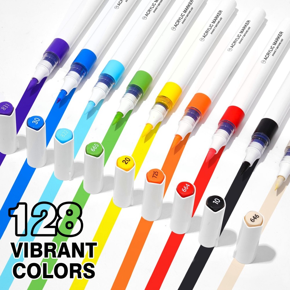 ROSYMENG acrylic paint pens set offer a selection of 9/126 rich and colorful options. Each paint markers are designed with unique and vibrant colors that cater to all your creative need. A variety of colors allows you to let your imagination run wild and have unlimited creative possibilities. Ideal for both beginners and professional artists looking to enhance their designs. These paint pens with soft brush tip feature a smooth application and strong coverage and water-resistant once dry which can make you enjoy uninterrupted creativity. Our 9-color acrylic paint markers feature long-lasting, fast-drying ink that won’t smudge or fade over time and this acrylic markers are made from non-toxic, eco-friendly materials, making them meet safety standards and are easy to handle for all skill levels. Our paint pens and paint markers are perfect for various surfaces, including paper, rocks, wood, glass, canvas, and more. Whether you’re working on a DIY home decor project or creating custom gifts, these paint markers for wood deliver bright, bold color on every surface which can let your imagination run wildly Each acrylic markers paint pens caps matches the ink color, with corresponding numbers for easy identification. The included color chart making it easy for you to choose exactly the right color every time. Looking for a thoughtful holiday presents? Whether it's Birthdays, Easter, Christmas, Halloween, Valentine's Day, Thanksgiving, or any other special occasion worth celebrating, our acrylic paint pens and acrylic paint markers with exquisite packaging making them ideal for parents and grandparents of children.