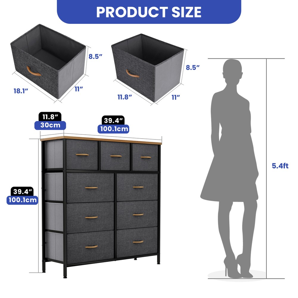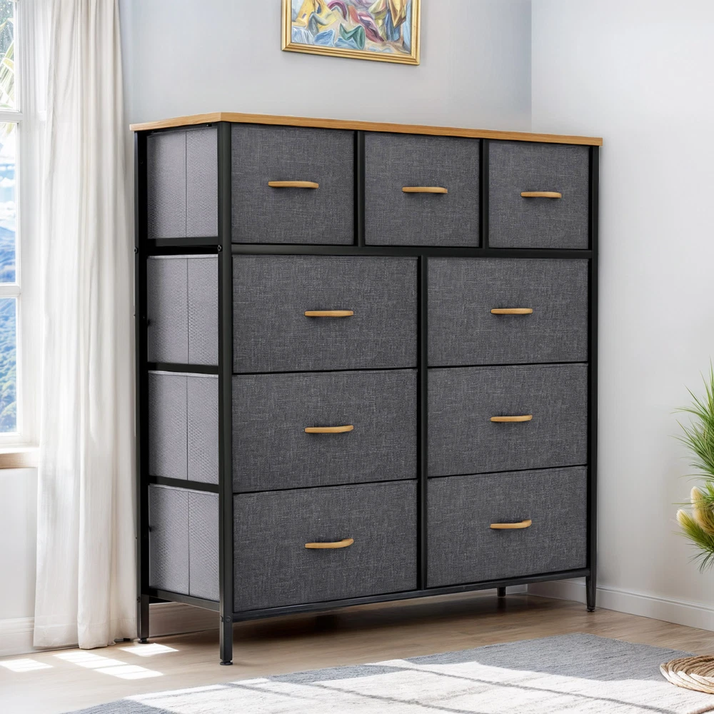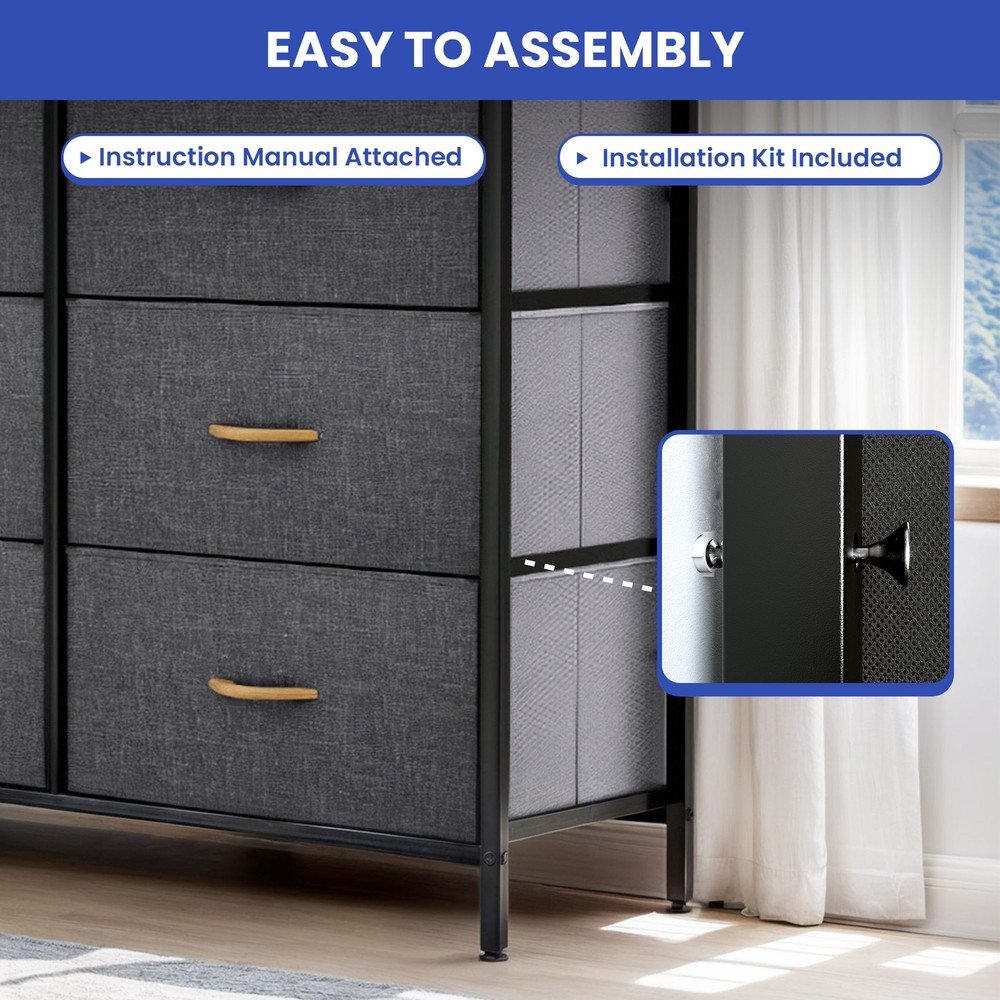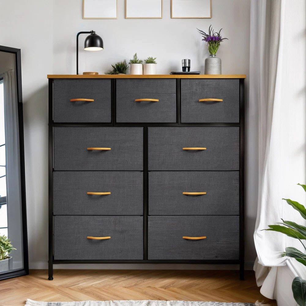 9 Drawers Dresser Gray Fabric Chest of Organizer Waterproof Desktop Bedroom Unit Product Description NOTE: Professional Installation would be Highly Recommended. Description: 1. Color: Gray 2. Material: Fabric, MDF, Steel, Plastic 3. Frame Material: Metal 4. Room Type: Bedroom, Living Room and Hallway Features: Robust Construction: - Crafted with a sturdy metal frame and a robust MDF wooden top for lasting durability. - Features 9 removable drawers with convenient wooden handles for easy access. - Supported by 4 adjustable plastic legs to safeguard your floors from scratches. - Augmented stability through an innovative crossbar design at the rear. - Choice to secure the dresser to a wall using screws for extra safety. High Quality Fabric: - Front side of drawers made with premium cationic polyester fabric. - Surrounding sides covered with breathable, non-woven synthetic fabric. - Easy to clean - simply wipe with a damp cloth and air dry. Ease of Use: - Comprehensive guidance for a simple setup process. - All essential components and add-ons are encompassed within the bundle. - Putting it together entails securing just a handful of screws. Adaptability: - Showcasing an elegant and contemporary style, adorned with high-quality dark gray fabric drawers, a robust black metal structure, and a waterproof wooden surface. - Applicable to a multitude of environments such as lounges, sleeping quarters, corridors, entrances, storage spaces, and infant rooms. Ample Storage : - Efficiently organizes clothes, accessories, books, and more. - Overall dimensions: 39.4" L x 11.8" W x 39.4" H. - Large drawer dimensions: 18.1" L x 11" W x 8.5" H. - Small drawer dimensions: 11.8" L x 11" W x 8.5" H. Dimensions: 1. Product Dimensions: 39.4"L x 11.8"W x 39.4"H 2. Capacity: 9 Drawer Package Included: 1. 9 Dresser Storage Chest 2. Assembling Hardware Kits 3. Instruction Manual Book Shipping 1. Normally the item will be dipatched within 1 business day if payment is cleared before 12pm PST. 2. Please verify the correct shipping address in your PayPal account before making the payment. We only dispatch the item to the address that is sent to us at the time of checkout. 3. We don't ship to Hawaii, Alaska, Puerto Rico, APO/FPO/PO Boxes. 4. We don't provide local pick-up service. 5. Normally we will use USPS, UPS, FedEx & LTL to dispatch items. Payment 1. We accept PayPal and credit card. 2. We will ship to the confirmed Paypal shipping address that is provided with the payment only. Return 1. 30 days Money Back Guarantee. 2. Please contact our customer service to receive a RMA form first if want to return the item. 3. All returned items MUST in new condition with the original package. Contact If has any problem, please contact us by sending an ebay message. Our customer service will resolve the problem as soon as possible. On Aug 29, 2024 at 23:07:39 PDT, seller added the following information: On Mar 14, 2025 at 04:45:19 PDT, seller added the following information: