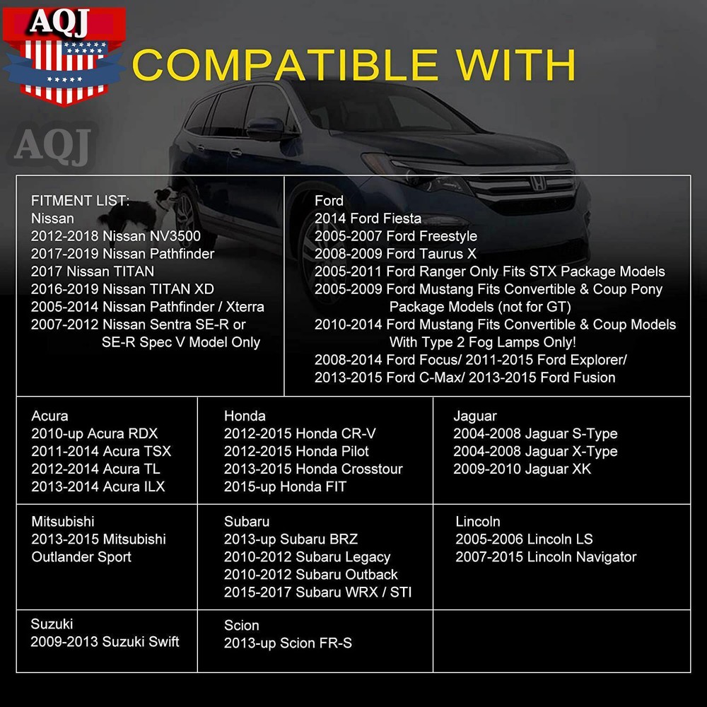 Home Payment Shipping About us Contact us Details 2pcs Fog Light Driving Lamp H11 Bulbs 55W Right Left Side car Accessories Please note the bulb size before purchasing How to Choose and Install the LED DRL for my car? CHOOSE RIGHT MODEL – This is really important, you need to double check the picture and make sure that your car’s factory fog lamp shape is 100% identical to our pictures. DO NOT buy if they are different shapes or there is no place to put in the DRLs. HOW TO INSTALL – All of our DRL products are after-market products so they DO NOT come with any instruction manual, professional installation is highly recommended. You can also contact us if you have any problem installing the DRLs. Condition: 100% Brand new. Appearance: Black Housing+Clear Lens Working Voltage: DC 12V Light Color: White Color Temperature: 6000K Light Source: White LED Placement on Vehicle: Front,Left,Right Features: 100% Brand New in the box with manufacturer packaging, never been installed before. Factory bolt-on OE fitment, no vehicle modifications are required; or replacement for the stock unit. No installation guide or instruction included, professional installation recommended. A pair light high power LED fog light included Package Includes: A Pair of LED Fog Light (Passenger Side & Driver Side) This listing is for one set (for both driver side & passenger side) aftermarket fog light lamp,, specially for vehicles listed below: New boxes and old boxes are sent randomly Fitment For Acura: Fit for 2013-2017 Acura ILX Fit for 2011-2014 Acura TSX (Sedan & Wagon) Fit for 2012-2014 Acura TL Fit for 2010-2017 Acura RDX For Ford: Fit for 2014-2015 Fiesta Fit for 2005-2007 Freestyle Fit for 2005-2011 Ranger Only Fits STX Package Models Fit for 2005-2009 Mustang Fits Convertible & Coup Pony Package Models (not for GT) Fit for 2010-2014 Mustang Fits Convertible & Coup Models With Type 2 Fog Lamps Only! Fit for 2008-2009 Taurus X Fit for 2008-2014 Focus Fit for 2011-2015 Explorer Fit for 2013-2016 C-Max Fit for 2013-2016 Fusion Fit for 2012-2014 Transit Connect Fit for 2015 2016 2017 Ford Mustang Fit for 2001-2015 Ford Fiesta Fit for 2004-2015 Ford Focus MK2 MK3 For Lincoln: Fit for 2005-2006 LS Fit for 2007-2015 Navigator For Jaguar: Fit for 2004-2008 S-Type Fit for 2004-2008 X-Type Fit for 2009-2010 XK For Honda: Fit for 2010-2014 Insight Fit for 2013-2015 Accord Coupe (2-Door) Fit for 2013-2015 Civic Si (Not suitable for EX Model, EX-L Model, HF Model, or LX Model;) Fit for 2016-2017 Civic Sedan (4-Door) Fit for 2015-2017 Fit Fit for 2013-2015 CRZ Fit for 2012-2015 CRV Fit for 2013-2015 Crosstour Fit for 2012-2017 Pilot For Nissan: Fit for 2005-2015 Nissan Xterra Fit for 2005-2017 Nissan Frontier Fit for 2008-2015 Nissan Armada Fit for 2005-2012 Nissan Pathfinder Fit for 2016-2017 Nissan Pathfinder Fit for 2016-2017 Nissan Titan Fit for 2012-2017 Nissan NV Van Fit for 2011-2015 Nissan Leaf Fit for 2005-2015 NISSAN Navara D40 Pickup Fit for 2005-2012 =Nissan Pathfinder R51 Fit for 2003-2008 Nissan Armada Fit for 2006-2013 Nissan Note E11 M Fit for 2005-2015 Nissan Frontier Fit for 2003-2008 Nissan Armada Fit for 2005-2015 Nissan Xterra N50 Fit for 2009-2013 Nissan Pixo UA0 Hatchback Fit for 2009-2013 Nissan Quest 2011 2012 2013 2014 For Subaru: Fit for 2011-2017 Subaru Impreza Fit for 2013-2017 Subaru XV Crosstrek 2.5i / Hybrid Fit for 2010-2014 Subaru Legacy 2.5i /3.6R / GT Fit for 2010-2012 Subaru Outback 2.5i / 3.6R Fit for 2015-2017 Subaru WRX / STi Fit for 2014-2017 Subaru Forester 2.5i / XT Fit for 2013-2016 Subaru BRZ Fit for Subaru WRX STI 2015 2016 Fit for Subaru BRZ 2013-2018 Fit for Subaru Outback 2010 2011 2012 Fit for Subaru Legacy 2013-2018 Fit for Subaru XV 2013 2014 2015 2016 Fit for 2013-2018 Subaru Forester Fit for Mitsubishi Fit for 2006-2012 Mitsubishi Outlander II CW_W Fit for 2007-2012 Mitsubishi Pajero IV Van V80 V90 Box Fit for 06-09 Mitsubishi Colt CZC Convertible (RG) Fit for 03-07 Mitsubishi Galant DJ_ ED_ EF_ Saloon Fit for Mitsubishi L200 KB_T KA_T Pickup 2005-2012 Fit for Mitsubishi Eclipse 2006-2012 Fit for Mitsubishi Endeavor 2006-2011 Fit for Mitsubishi Colt Hatchback 2004-2012 For Others Models with metal bumper & Fog light opening car Note: 1. Please allow 1-3cm (0.4-1.18") difference due to manual measurement and slight color variation for different display setting. 2. Please kindly confirm the fitment before ordering to make sure this item is perfectly fit. 3.Communication is the best way to solve the problem. If you have any problems after purchasing, please contact us in time, before opening return or case. 4.Installation instruction is NOT included, professional installation is highly recommended. 🚗 【About us】 We treat each buyer with a sincere heart, I believe our sincere service , excellent quality of goods will win your trust and support. Every week we have new items put on sale , if the items you don't need now ,you also caoften come to visit my store, maybe one day you can buy the items in our stores which you need. 🚗 【Contact us】 If you have any questions or concerns about your eBay order, please feel free to email us. We will try our best to reply all e-mails within 24 hours. However, no emails will be replied during weekends or holidays. Please allow up to 48 hours delay in receiving our response after long weekends or holidays(Except Chinese Holidays). Please contact us for resolutions before leaving negative feedback, we strive to providing the greatest service and bringing the highest satisfaction to all of our customers. Contact US Payment Return Contact US The buyer is responsible for all return shipping including a result of customer error or defective item. 1) If you received an incorrect, damaged, defective, or item not as described, contact us for a partial/full refund or replacement on our cost. 2) If you want to return the item, please contact us within 30 days after package received. Return products must also be in its original condit