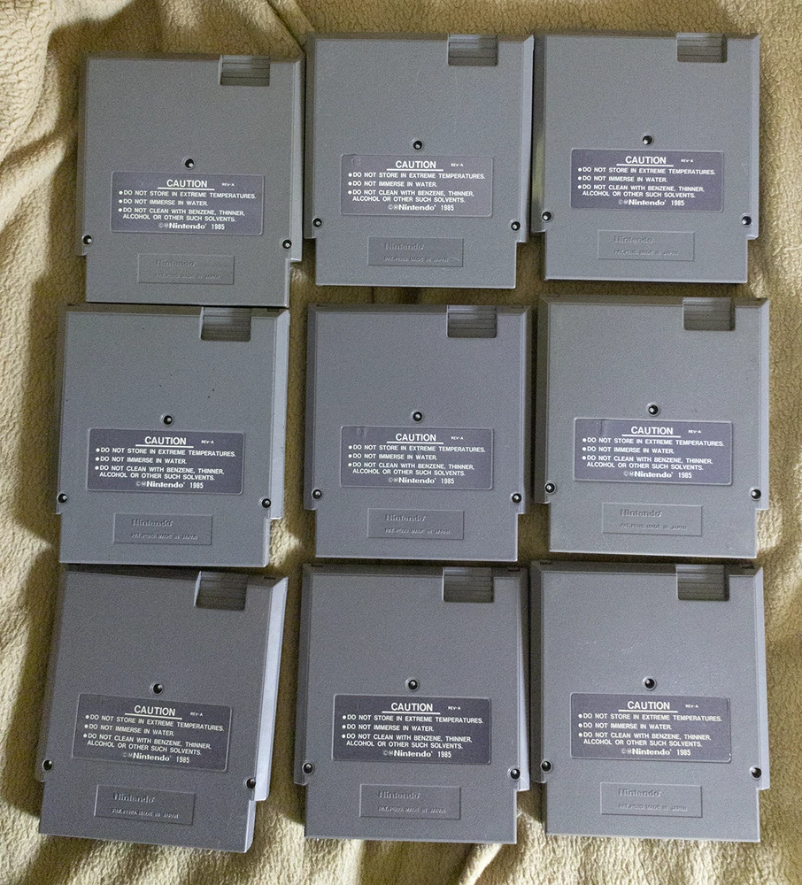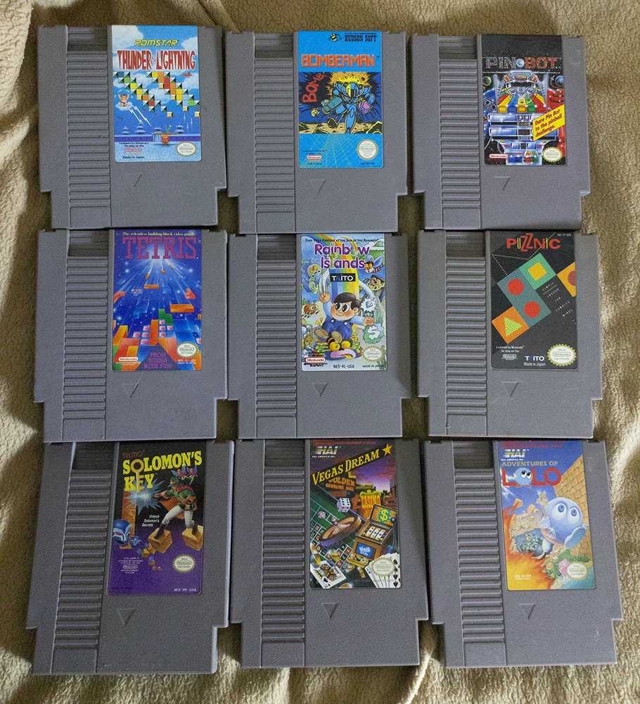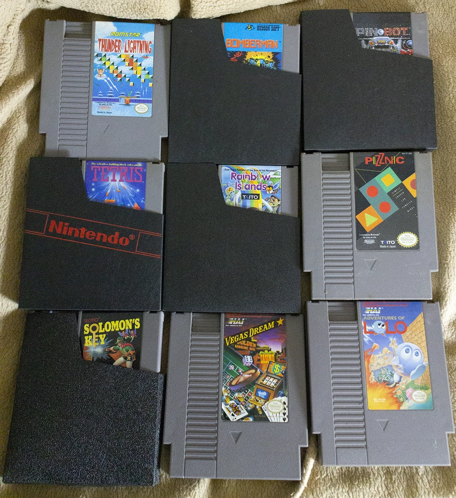 Thank you for checking out our auction. You are bidding on 9 Used NES Games with 6 Black Slip Covers . This is a Puzzle Bundle Pack . Thank you for your consideration. Here is a list of games included in this auction... COMBINE AND SAVE SHIPPING ON MULTIPLE AUCTIONS Adventures of Lolo Bomberman Pin-Bot Puzznic Rainbow Islands Solomon's Key Tetris Thunder & Lightning Vegas Dream