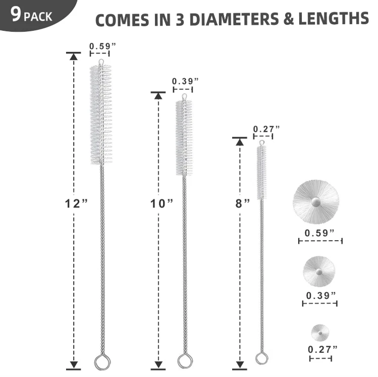 9 Pack (3-Size) Drinking Straw Cleaning Brushes Set Extra Long Pipe Tube Cleaner MULTIPLE SIZE – With this set of 9 straws you will get a straw with a diameter of 6 mm, 9 mm and 12 mm, and nylon bristle length of 8 inches, 10 inches and 12 inches. Great for clean your straws on Tumbler, Sippy Cup, Baby Bottles, Tervis, CamelBak, Hydroflasks, Yeti, Starbucks Cup and others. EASY TO USE – Simply insert it into the pipe, rotate it, remove and wash it. With the long, soft but durable bristles, it can be used to clean each size of pipe you have and does not scratch the inside of straws. Moreover, it doesn’t leave a lot of fuzz behind in the pipe like pipe cleaners do which you need to take the trouble to get rid of it. DURABILITY & MULTIFUNCTIONAL – Use our durable straw brush that is very flexible but will not break easily which is much stronger than some inferior and fragile straw brushes. Meanwhile, this brush also can be used to clean Pipe, Narrow Tube, Hookah, Coffee Pot, Sink Drain, Hummingbird Feeder, Weed Smoking Bong and other hard to access corners. HOW IT’S MADE – These straw cleaning brushes are made of food grade stainless steel, while bringing you durability and versatility. The bristles are made of nylon which is both resistant, and easy to clean. Get around any surface or maneuver any depth. DISHWASHER SAFE – These pipe cleaners are easy to clean after use since they can easily throw it in the top rack of the dishwasher, and this won't affect the brushes' effectiveness and functionality. SHIPPING: We offer FREE shipping on all orders! We ship within Three business days of payment, usually sooner. We use a selection of shipping services such as UPS, FedEx, USPS etc. We only ship to the lower 48 states, no APO/FPO addresses or PO Boxes allowed. Local pickups and combined shipping options are not provided at this time. PAYMENT: We accept payment by any of the following methods: PayPal Please pay as soon as possible after winning an auction, as that will allow us to post your item to you sooner! FEEDBACK: Customer satisfaction is very important to us. If you have any problem with your order, please contact us and we will do our best to make you satisfied. Thank you for shopping with us!