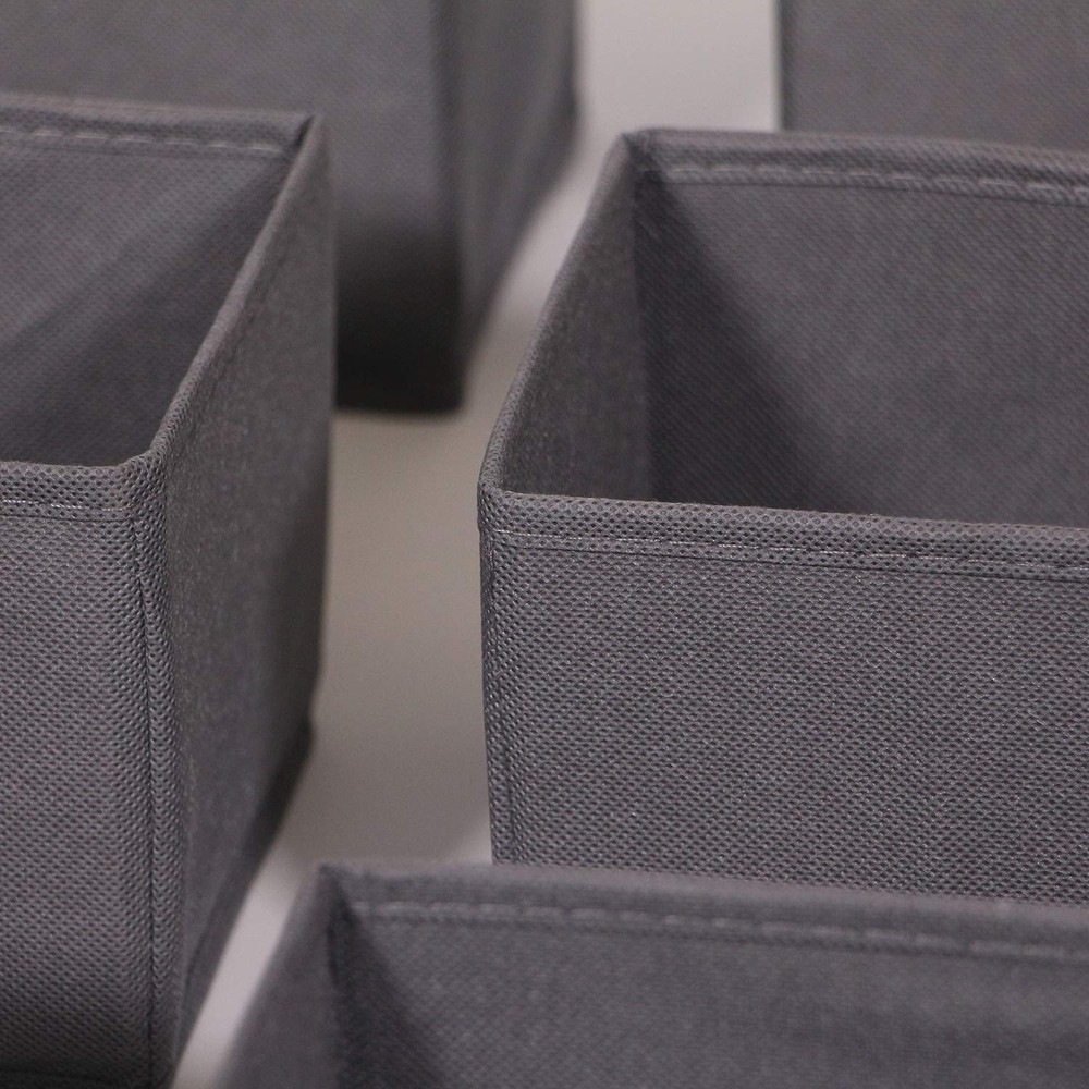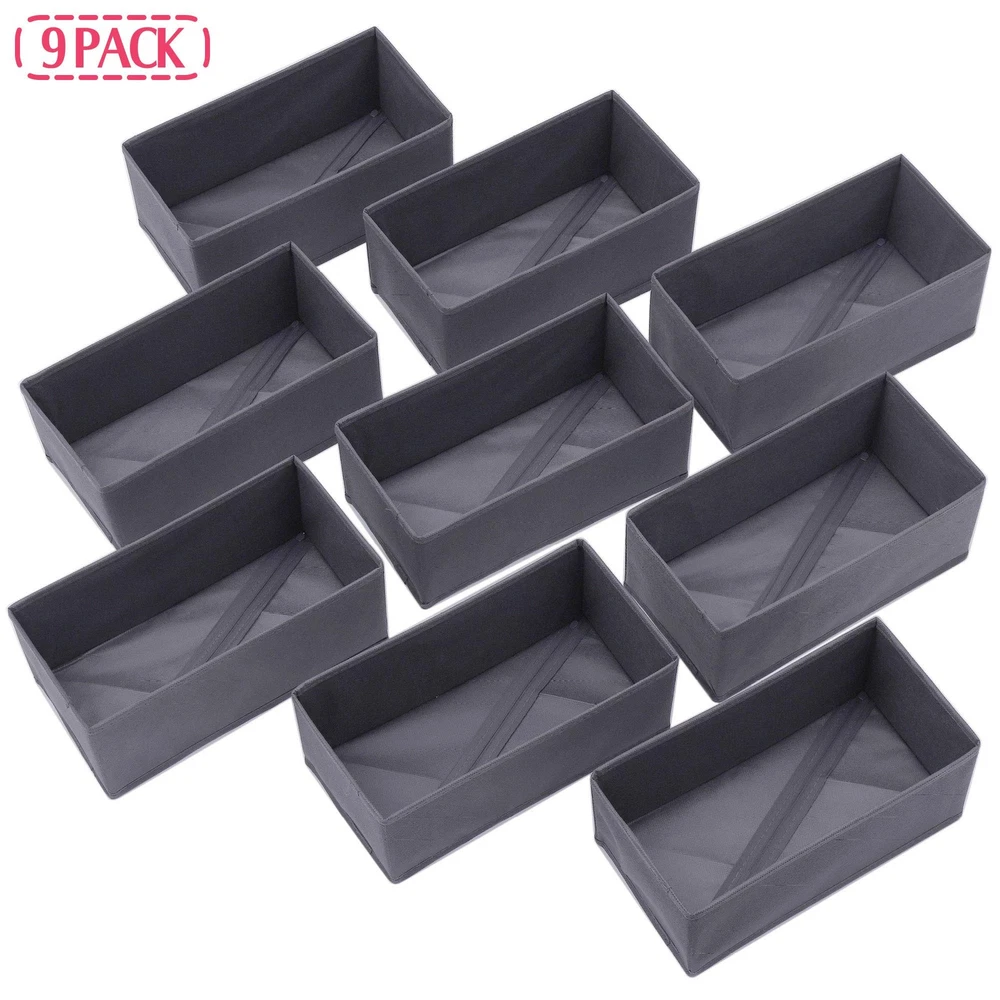 1, Classify Underwear, Bras, Socks, Ties, Scarves, Underpants, Undergarment, accessories etc. Easy to find which one you want to wear and never need to ransack all of your clothes. 2, These storage containers drawers Includes 9 medium rectangular organizer bins that can hold a variety of personal items. These stackable baskets dividers fit for men women male baby children kids girls boys. 3, The large collapsible cloths Storage Boxes Dresser Drawer organization provides lightweight solution and easy carrying to many personal storage needs. These soft adjustable compartments can be used for closet, bedroom, shelf, bathroom, wardrobe, chest of drawers, under bed storage, desk, bookshelf, nursery, office. 4, Made from non-woven fabric and Cardboard. Dresser drawer organizer measurements are: 11" X 5.5" X 4.7". Color: Dark Grey. Set of 9. 5, SPACE SAVING YOUR CABINET: Can be folded flat to save space when not in use. Multi-Purpose, suitable for baby clothes, underwear, bras, socks, makeup, belt, lingerie, panty, clothing, diapers, toys, crafts. Classify Underwear, Bras, Socks, Ties, Scarves, Underpants, Undergarment, accessories etc. Easy to find which one you want to wear and never need to ransack all of your clothes. These storage containers drawers Includes 9 medium rectangular organizer bins that can hold a variety of personal items. These stackable baskets dividers fit for men women male baby children kids girls boys. The large collapsible cloths Storage Boxes Dresser Drawer organization provides lightweight solution and easy carrying to many personal storage needs. These soft adjustable compartments can be used for closet, bedroom, shelf, bathroom, wardrobe, chest of drawers, under bed storage, desk, bookshelf, nursery, office. Made from non-woven fabric and Cardboard. Dresser drawer organizer measurements are: 11" X 5.5" X 4.7". Color: Dark Grey. Set of 9. SPACE SAVING YOUR CABINET: Can be folded flat to save space when not in use. Multi-Purpose, suitable for baby clothes, underwear, bras, socks, makeup, belt, lingerie, panty, clothing, diapers, toys, crafts.