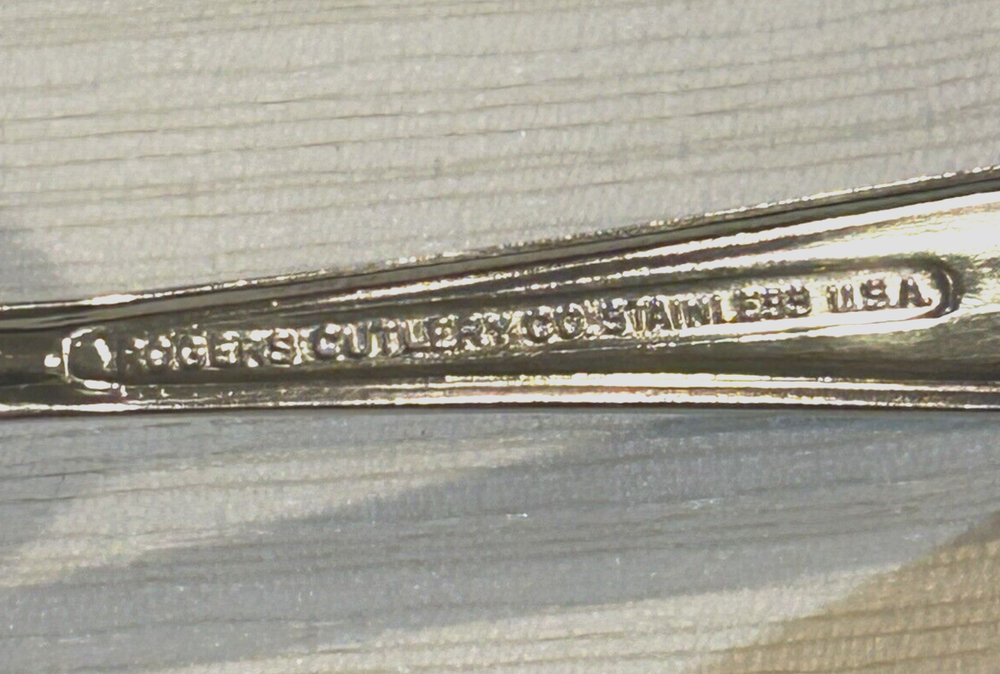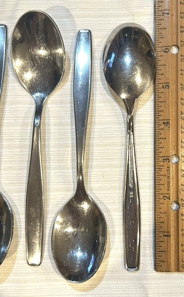 This 9-piece spoon set by International Silver in the pattern Creation is a must-have for any mid-century modern-inspired kitchen. Crafted from high-quality stainless steel, these spoons are durable and dishwasher safe for easy cleaning. The glossy finish adds a touch of elegance to any table setting, while the unique handle pattern makes them stand out from other flatware pieces. These spoons are perfect for all occasions, whether you're hosting a dinner party or simply having a family meal. The set includes both forks and spoons, and each piece is 6.75 inches in length. Made in the United States, these spoons are a great addition to any collection.