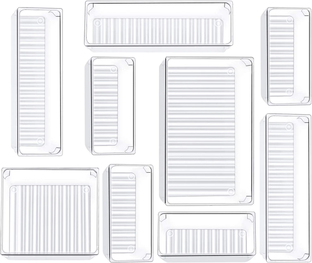 Product Description Space-Saving Storage Solution: Our drawer organizers are designed to fit different drawers and maximize storage efficiency. Whether you need to organize jewelry, cosmetics, makeup tools, hair accessories, nail polish, toothpaste, hairbrushes, medicine, silverware, office supplies, or toiletries, these vanity organizers have got you covered. Versatile and Customizable: The drawer organizer bins are ideal for various spaces in your home, including bathroom, vanity, dresser, bedroom, kitchen, cabinet, and office. The 9-piece set includes 4 sizes: 9 x 6 x 1.9 inches (1pc), 6 x 6 x 1.9 inches (1pc), 9 x 3 x 1.9 inches (3pcs), 6 x 3 x 1.9 inches (4pcs). Mix and match to create a customized combination that meets your needs. Stackable Design: When not in use, these bathroom drawer organizers can be stacked neatly, saving valuable space in your room. Their uniform design allows for easy stacking, making them perfect for storage when you need to free up drawer space. Ideal for Home Organization: If you are looking to declutter and keep your home tidy, these storage bins can help you keep everything from makeup to bathroom essentials neatly arranged. The clear design makes it easy to see your stuff and access what you want quickly. Easy to Clean: Made from durable plastic, these desk drawer organizers are easy to clean. Simply wipe them down with a damp cloth to keep them looking new. A great storage option for your drawers, makes things look neat and organized. Organize Like a Pro Kootek 9 Pcs Drawer Organizer for Bathroom, Desk, Office, and more Multipurpose and versatile drawer organization option for your home and office. Set of 9 drawer dividers in 4 different sizes provides several combinations to fit vary drawers. If a drawer cannot fit all of them, you can make use of them elsewhere. Ideal for bathroom vanity drawers, kitchen, medicine cabinet, office, and more! Hold different size objects and lots of things. You can store your jewelry, skincare products, makeup brushes, office supplies, etc. Turn jumbled into organized. Wavy Bottom The wavy bottom design increases the friction of the bottom of the drawer organizer, so that the items placed in it will not slide around. Smooth Edges The edge of the drawer organizer is smooth and flat, so that it will not scratch the desktop when in use. Support Point The bottom of the drawer organizer has 4 support points, so that it can be stably placed on the desktop, it is a ideal choice for storing items. Stackable The arc design of the corners allows the drawer organizer to be stacked to save storage space. Stack them up when not in use. Office Drawer Use the drawer organizers to classify and store office supplies, such as pens, staplers, etc. Dresser Drawer Allows you to quickly find the cosmetics without having to struggle in a messy drawer. Tools Drawer Put tools in the storage box to keep the junk drawer away from chaos. Snack Storage The assortment of sizes drawer organizers to hold your snacks separately. Suitable for Various Scenes 1 Office Drawer 2 Dresser Drawer 3 Tools Drawer 4 Snack Storage Kootek Storage Organizers Add to Cart Add to Cart Add to Cart Add to Cart Add to Cart Add to Cart Customer Reviews 4.7 out of 5 stars 22,587 4.6 out of 5 stars 2,782 4.5 out of 5 stars 438 4.7 out of 5 stars 749 4.6 out of 5 stars 526 4.7 out of 5 stars 978 Price $16.99 $ 16 . 99 $26.99 $ 26 . 99 $22.99 $ 22 . 99 $32.99 $ 32 . 99 $29.94 $ 29 . 94 $29.99 $ 29 . 99 Package Quantity 9 Pcs 16 Pack 4 Pack 8 Pcs 6 Pcs 6 Pcs Number of different sizes 4-Size 3-Size 1-Size 4-Size 3-Size 6-Size Color Clear Grey Clear Natural Natural Natural Bottom Design Wavy Bottom Flat Bottom Flat Bottom Flat Bottom Flat Bottom Flat Bottom Has Dividers? ✘ ✘ ✔ ✘ ✔ ✔ What is the height of the trays? All the drawer organizers are about 1.9" tall. Is the inside bottom of the tray flat? The bottom is wavy, but the space is not wide nor deep. Bottles stand without issue. Are these stackable? Yes, the drawer organizers are stackable, not recommended to stack when holding many things.