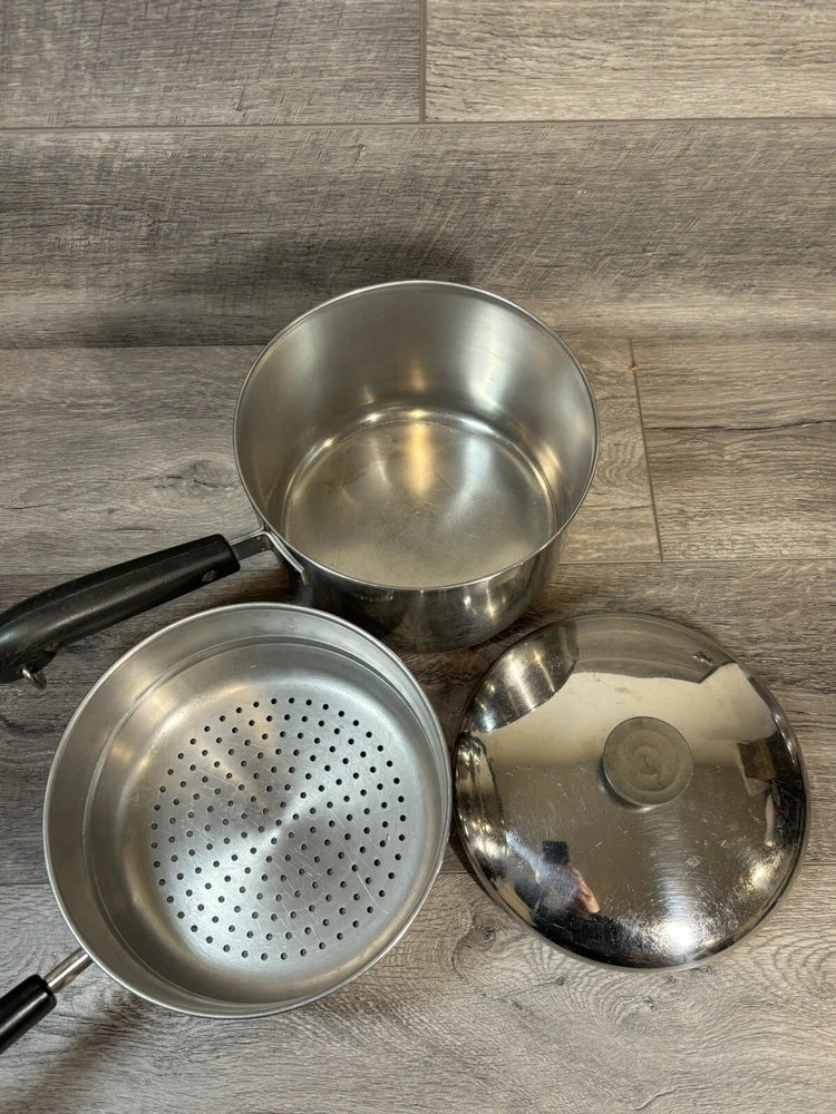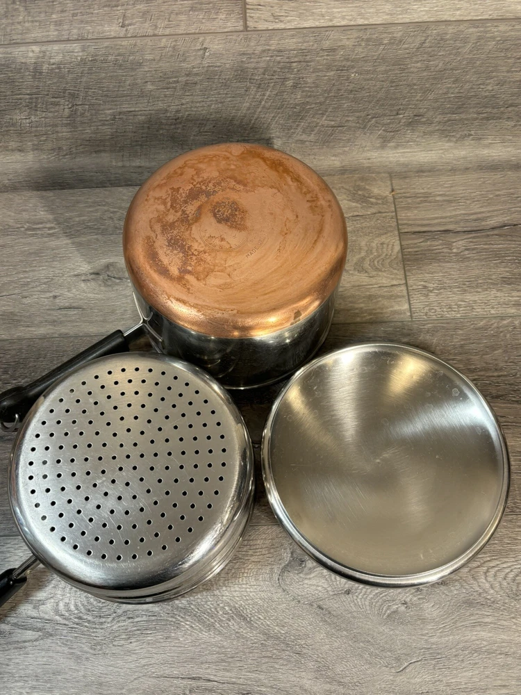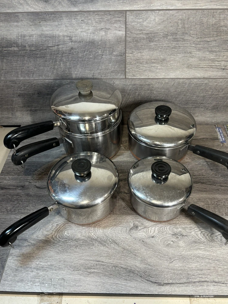 9 Piece Revere Ware 1801 Copper Bottom Cookware Set Sauce Pots Lids Steamer 3 Quart Sauce Pot with Lid 2 Quart Sauce Pot with Lid and Steamer 1.5 Quart Sauce Pot with Lid 1 Quart Sauce Pot with Lid
