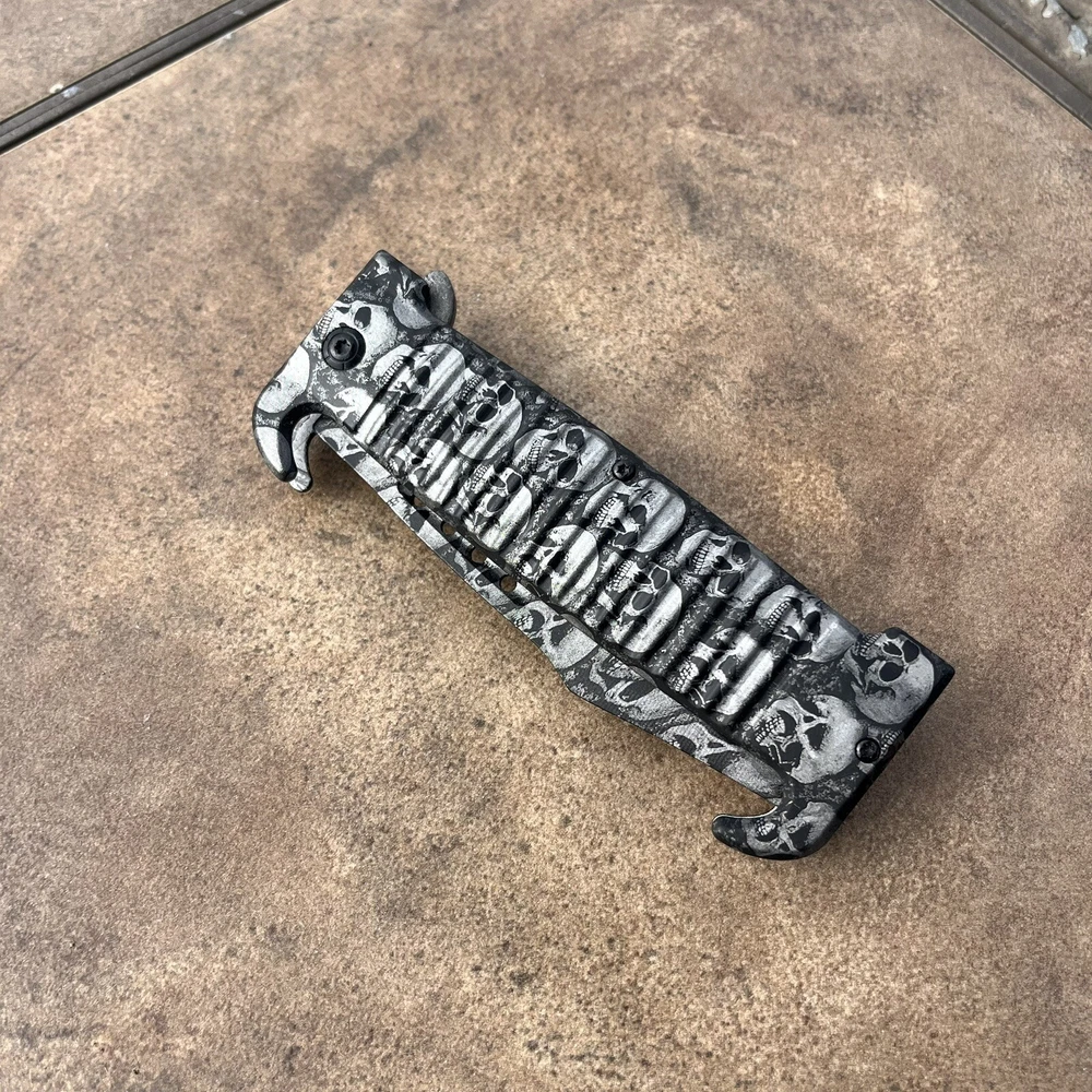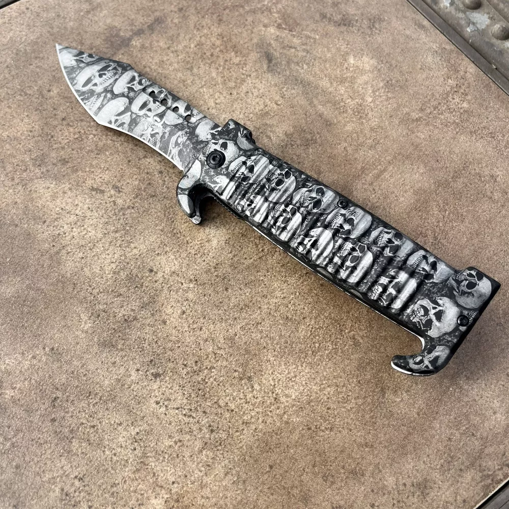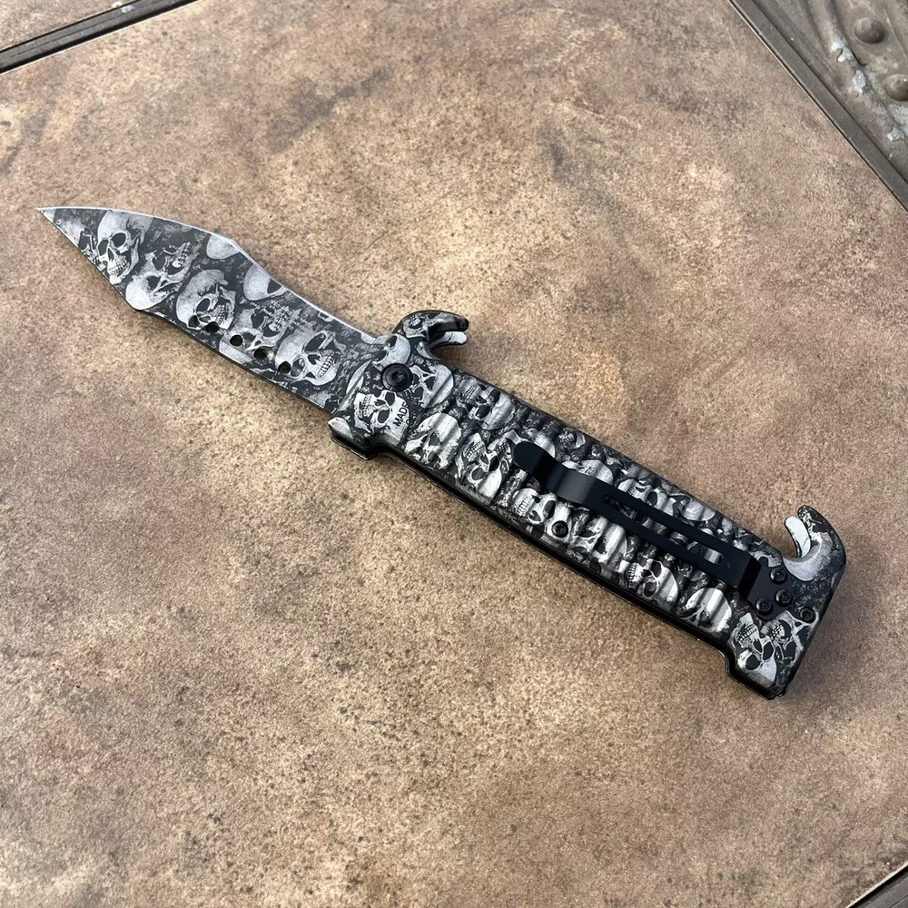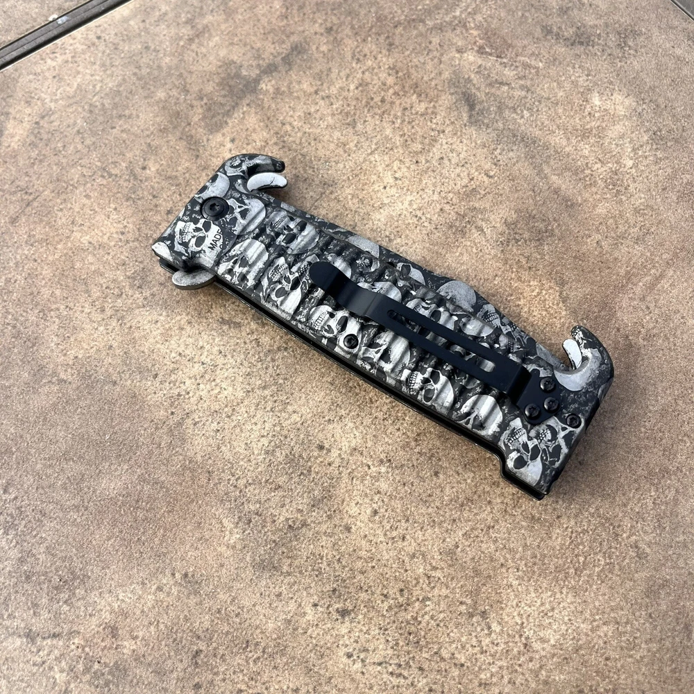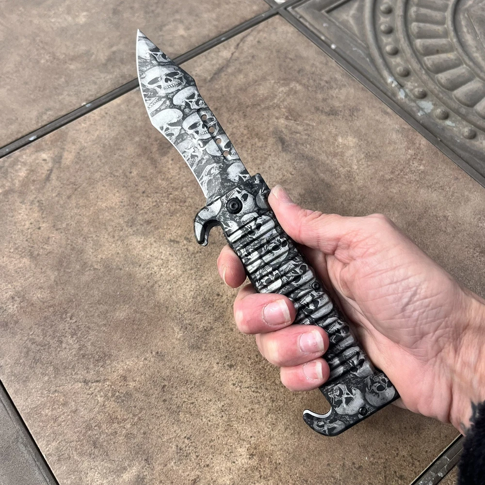 Command attention with this 9" Spring Assisted Tactical Folding Knife! Featuring a sleek silver skull handle and a razor-sharp 4" stainless steel blade, this knife is designed for both style and performance. The spring-assisted opening mechanism allows for quick and easy one-handed deployment, making it ideal for everyday carry (EDC) and tactical situations. Features: Fast Action: Spring-assisted opening for rapid deployment. Durable Blade: 4" stainless steel blade for reliable cutting performance. Secure Grip: Ergonomic silver handle with a skull design for a comfortable and non-slip hold. Compact Design: 9" overall length, folds easily for convenient carry. Tactical Style: Eye-catching silver skull handle with a tactical aesthetic. Specifications: Overall Length: 9 inches Blade Length: 4 inches Blade Material: Stainless Steel Handle Material: Silver with Skull Design Opening Mechanism: Spring Assisted Ideal for: Everyday Carry (EDC) Tactical Use Self-Defense Outdoor Activities Collections We strive for positive Feedback on all transactions. Your satisfaction is very important to us, if you experience a problem of any kind with your purchase please contact us first before leaving any feedback or opening any claims, any issues will be resolved more efficiently if you contact us first and deal directly with us. We do stand behind our products and will do anything in our power to make sure that you feel satisfied with your purchase. If you are not happy with your purchase, quality, DOA items. PLEASE email us , We would be more than happy to replace the item. Thank you for the cooperation.