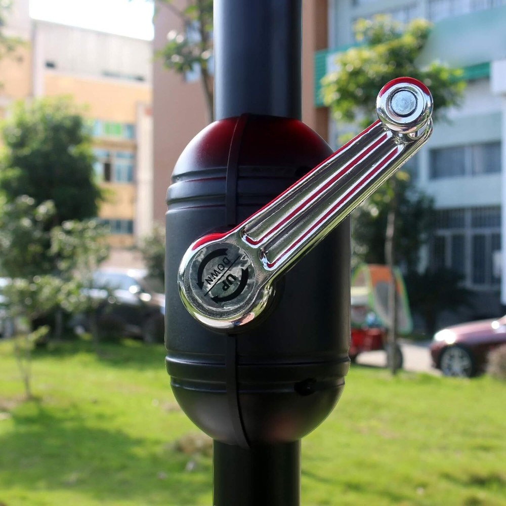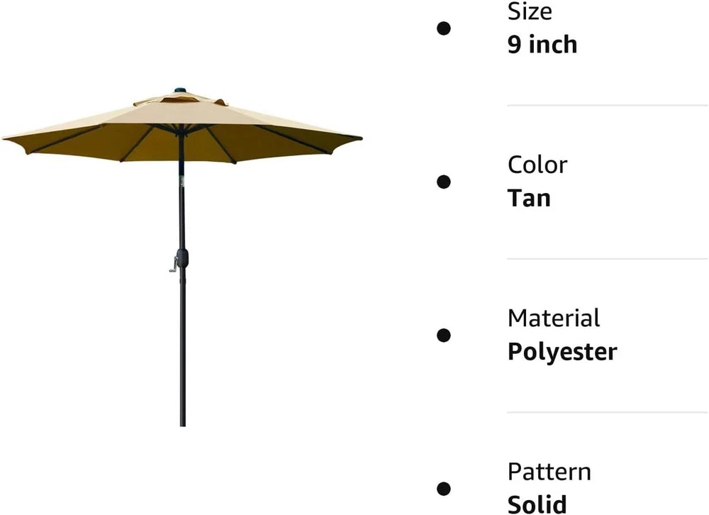 Made of polyester that can be waterproof, long lasting, easy to clean. Powder Coated Aluminum Pole(40mm Diameter aluminum pole) and 8 sturdy ribs provides stronger support. Includes single wind vent for stability. 9 feet diameter- Wide enough to your 42" to 54" round, square or rectangle table with 4 to 6 chairs. Easy crank open function with push button tilt, keeping cool and comfortable form the sun.