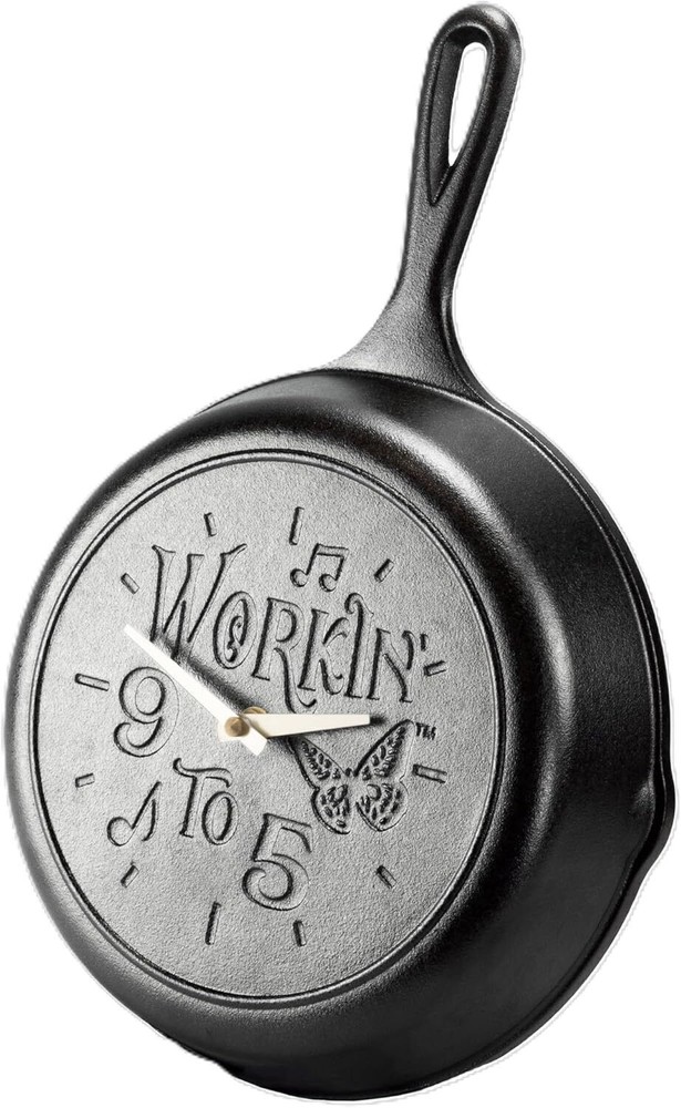 This skillet clock is a nod to Dolly Parton’s hit song “9 to 5.” Proudly display this piece that needs a big dose of Dolly fun—from kitchen to office! The collectible clock features a Lodge cast iron skillet with a special Dolly-inspired design that’s made to be passed down for generations to come. Our skillet clock has a cast iron body with aluminum clock hands that uses 1 AA battery (not included) and requires some assembly. Note: clock kit includes an extra washer (just in case). Made for Dolly Fans, the "9 to 5" skillet clock is for decorative use only, not for cooking. Color Black Display Type does not apply Style Country Special Feature Made without PFOA or PTFE Product Dimensions 9.88"W x 15.31"H Power Source Battery Powered Age Range (Description) Adult Room Type Kitchen Shape Rectangular Indoor/Outdoor Usage Indoor Material Cast Iron Theme Dolly Parton; 9 to 5 Frame Material Cast Iron Are Batteries Included No Mounting Type Tabletop Item Weight 4.17 Pounds Number of Batteries 1 AA batteries required. Watch Movement Quartz Number of Items 1 Operation Mode Electrical Dial Color Black Clock Form Multi Display Size 9 Inch