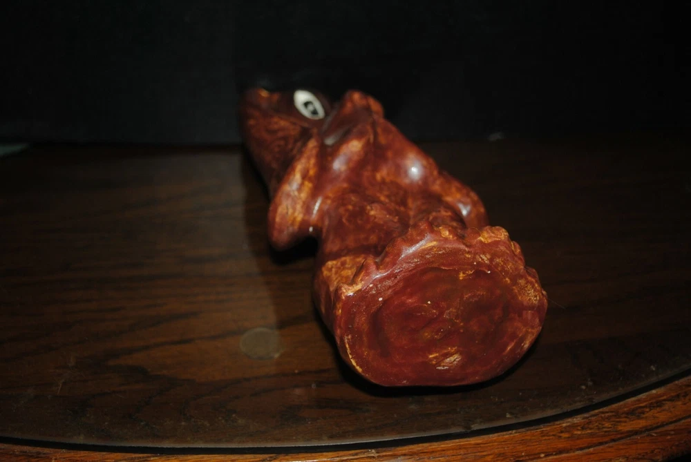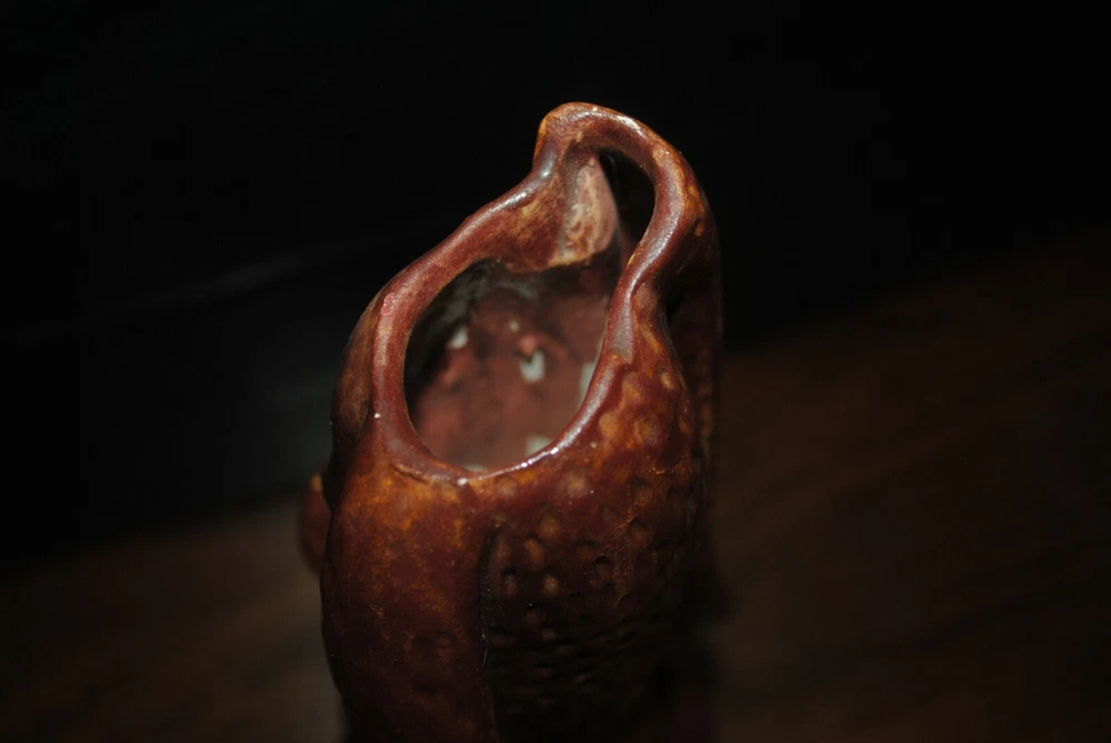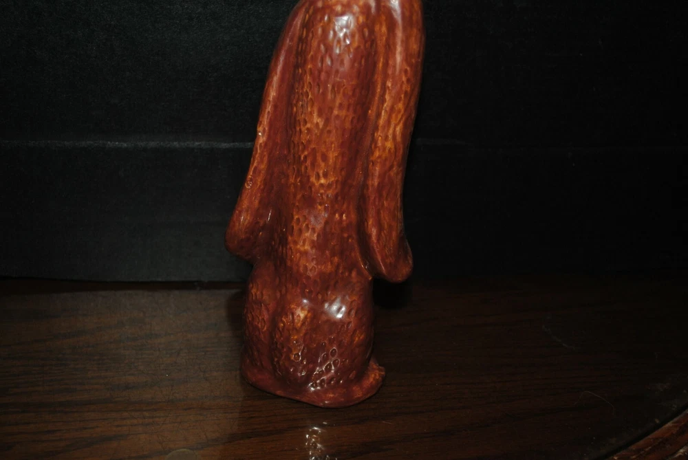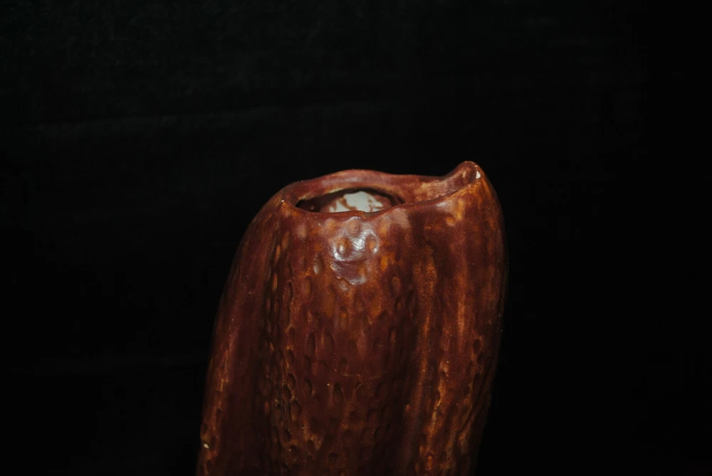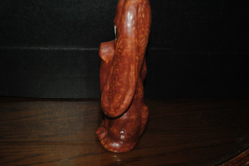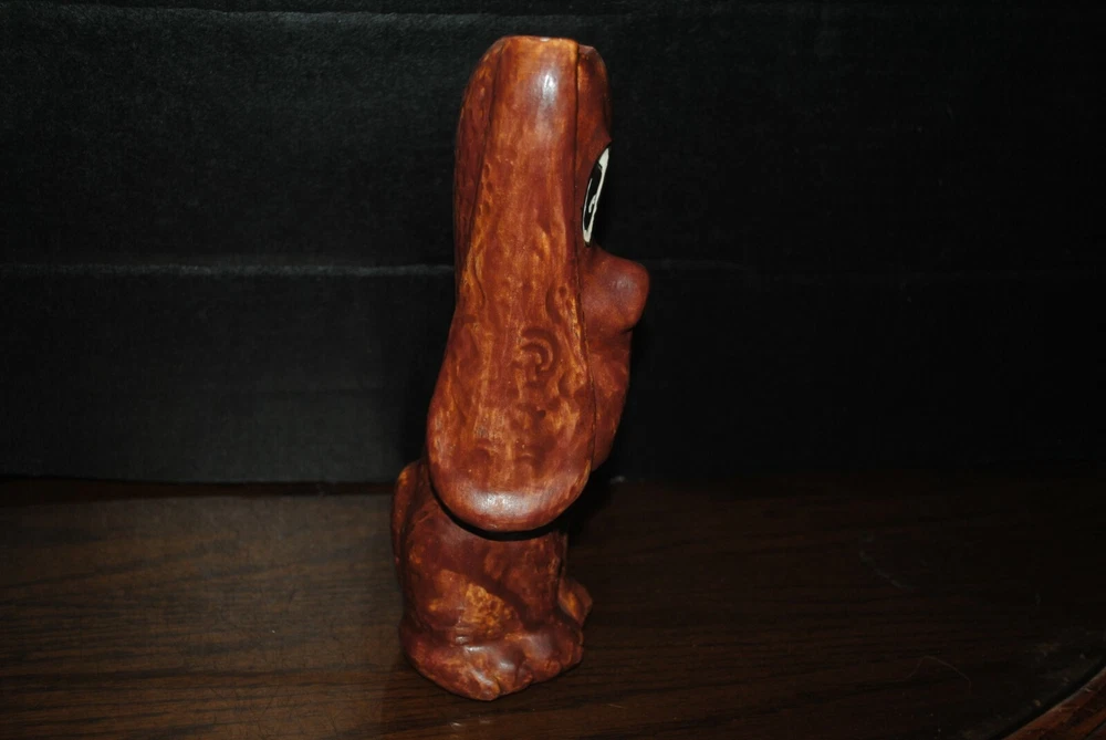This is a very nice vase for dried floral arrangements. He is in the shape of a sad droopy type brown basset hound with sad eyes. The artisan was very good.