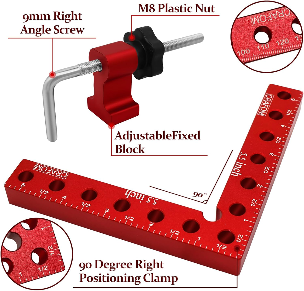90 Degree Corner Clamping Squares 4 Set 3" 5.5" Wood Working Tools Aluminum Box High Quality : Crafom 90 Degree Corner Clamping Squares is made of high-quality aluminum alloy material, Anodized red surface, resistant to corrosion, wood working tools durable and long service life Multiple uses : For woodworking, right-angle clamps are used to create and fix wooden corners perfectly. Aluminum corner clamps help in framing, making cabinets, and installing furniture, especially making sure to install them at a 90-degree angle Two Different Sizes: Corner Clamps Including 3-inch and 5.5-inch sizes, Excellent for wood working of various sizes and different needs Easy to Use: With Crafom 90 Degree Positioning Squares Installing a wooden frame at a 90 degree angle has become easy, It is enough to place the Corner Clamping Squares next to the two pieces to be combined, then insert the Right Angle Screws into one of the corner clamp holes, then secure it with an M8 plastic nut Great choice as a Gift : 90 degree carpentry clamps will be the best gift for woodworkers or any Handyman, because they have two sizes (3" 5.5") which makes working on small or large frames easy. In addition to their high quality, they come in a colorful paper box package, which gives them beauty and elegance compared to others Product Description 90 Degree Angle Clamps Multifunctional and High Quality Very solid little set of Right Angle clamp that will give you years of use. Clamps for woodworking are suitable for woodwork, and for all works that require clamping at a 90 degree angle. Right angle clamp is available in two different sizes (3'', 5.5'') making it suitable for large and small parts. Corner clamps for woodworking, suitable for cabinet and furniture repair,boxes, as well as picture frames, and other wood projects that need to be clamped at a 90 degree angle. Complete your woodworking toolkit with our wood working clamps sets, providing you with a versatile and comprehensive solution for all your clamping needs. Achieve flawless 90 degree angles with our 90 degree positioning squares. Perfectly align and secure your woodworking projects with our CRAFOM 90 Degree Corner Clamping Squares, ensuring precise and professional results every time. Increase your productivity and efficiency with our woodworking clamps, allowing you to work faster and with greater accuracy. Item model number 4P-CR0123EC Style 2PCS 5.5'' + 2PCS 3'' Color Red Material Aluminum Country of Origin China Batteries Required? No Item Weight 1.17 Kilograms Package Dimensions 7.6 x 6.93 x 2.44 inches Included Components 2 pcs 90 Degree Positioning Squares ( 80mm x 50mm), 4 pcs Adjustable Fixed Blocks, 4 pcs M8 Plastic Nut, 4 pcs Right Angle Screws, 2 pcs 90 Degree Positioning Squares (140mm x 140mm) Complimentary Shipping and Easy Returns Need to return something? Enjoy our 30-day hassle-free return policy! Take advantage of free shipping across all 48 contiguous states! Your order will be dispatched within 1-2 business days once payment is confirmed. Your Opinion Matters! Your happiness is our main goal! We welcome your feedback! If you encounter any problems, reach out to us right away, and we’ll be here to help. Explore the Extraordinary! Our collection showcases fascinating products that are sure to capture your attention. What surprises await you? Delve in and discover unique items that enrich your daily life. Don't miss the amazing things we have in store for you!