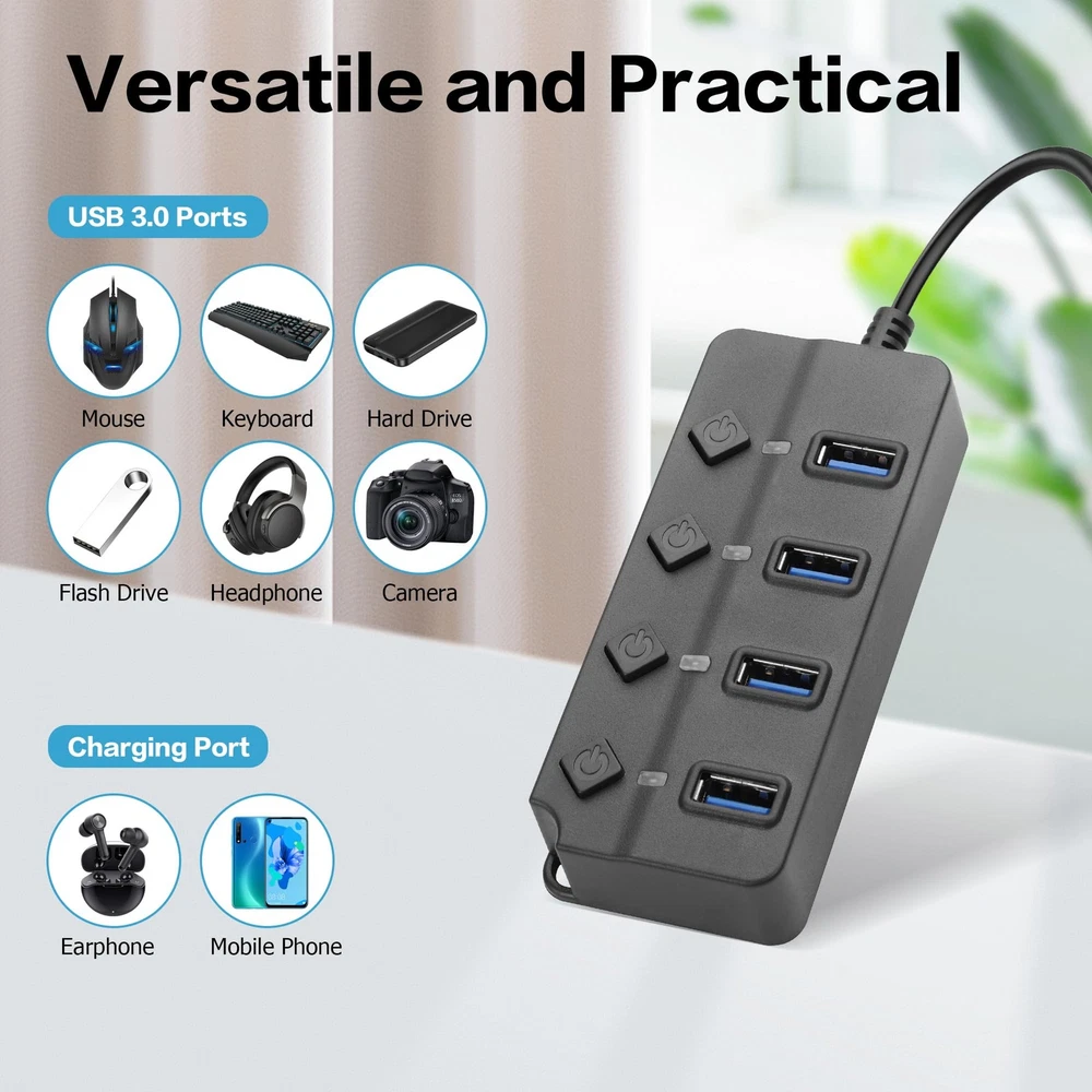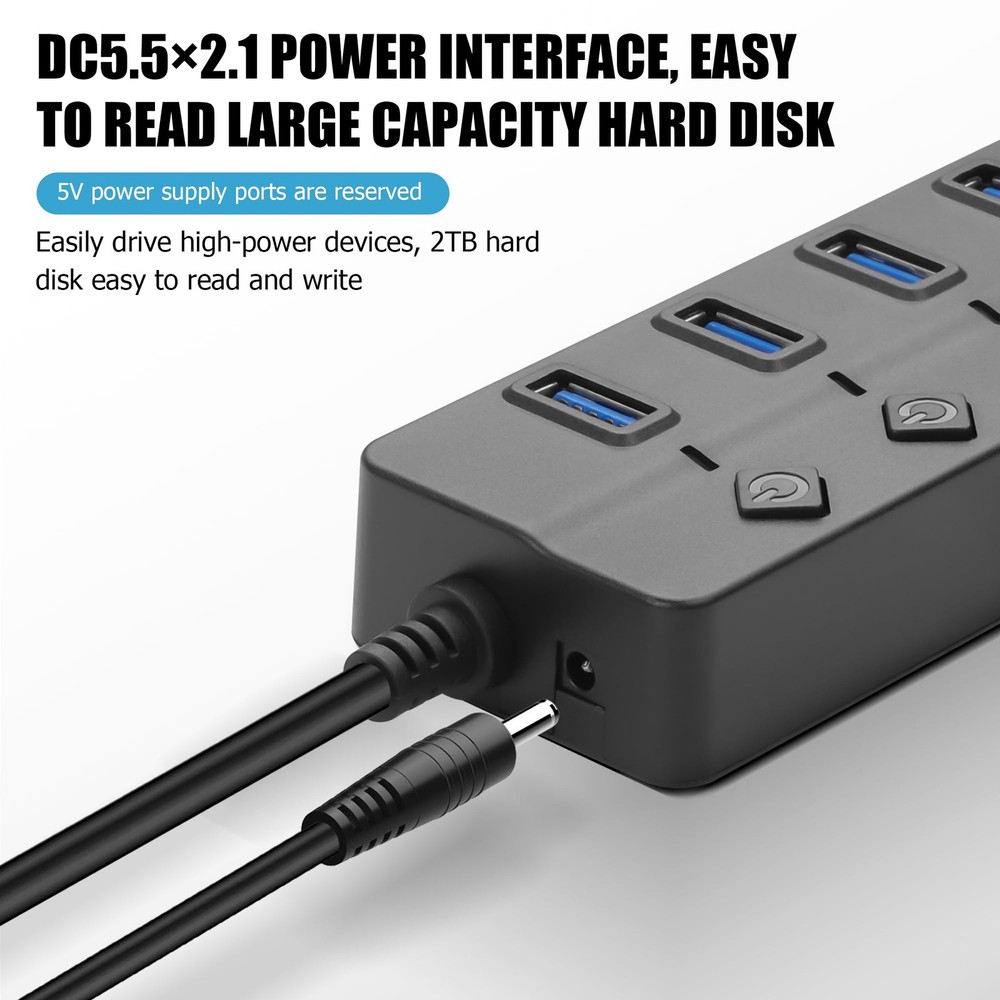 YACSEJAO 1FT/3.3FT 4/7-Port USB 2.0 Right Angle Hub with Switch * Solve the problem of insufficient USB interface of your device. * This can simultaneously connect the mouse, keyboard, U disk, hard disk, etc., office more convenient. ●Extra Durable Reinforced built-in cable, sturdy exterior casing and heat-resistant connectors ensure incredible durability. ●Extra Freedom With an extended 3.3 ft cable, organizing your workspace just the way you like has gotten much easier. ●Transmission The theoretical transfer speed of data via USB using a USB hub can reach 480MB/s, and the actual speed is about 15MB/s to 25MB/s, which is sufficient for daily supply and demand. ●Supported Systems Windows 10, 8, 7, Vista, XP, Mac OSx 10.6-10.12 or later, Linux 2.6.14 or Later ●Compatibility Compatible with most operating systems as Windows11/10/8, Mac OS, Linux 2.6.14 or later. Applies to various laptop, pc, flash drive, keyboard, mouse, HDD, cellphone OTG adapter, printer, camera, USB fan and USB cables. 【90 Degree USB Hub with Switch】Converts 1 USB port to 4/7 with individual switches for each port, saving you the hassle of plugging and unplugging devices. The unique 90-degree cable design saves space and keeps your desk tidy. 【Easy to Use】This USB port hub has a built-in high-performance chip to keep your devices and data safe. No need to install any software, drivers, plug and play. 【Individual Switch with LED Indicator】This USB hubs feature Individual LED Power Switches for each port, allowing you to easily turn power on and off without having to unplug your device. In addition, You can also know the working status of each port through the LED indicators. 【Wide Compatibility】Compatible with most operating systems as Windows11/10/8, Mac OS, Linux 2.6.14 or later. Applies to various laptop, pc, flash drive, keyboard, mouse, HDD, cellphone OTG adapter, printer, camera, USB fan and USB cables. 【Note】This USB Hub Splitter comes with a DC5.5*2.1 external power socket, when connecting power hungry devices (no need to connect for normal use), you can connect your own additional 5V 4A power supply (external power supply not included).
