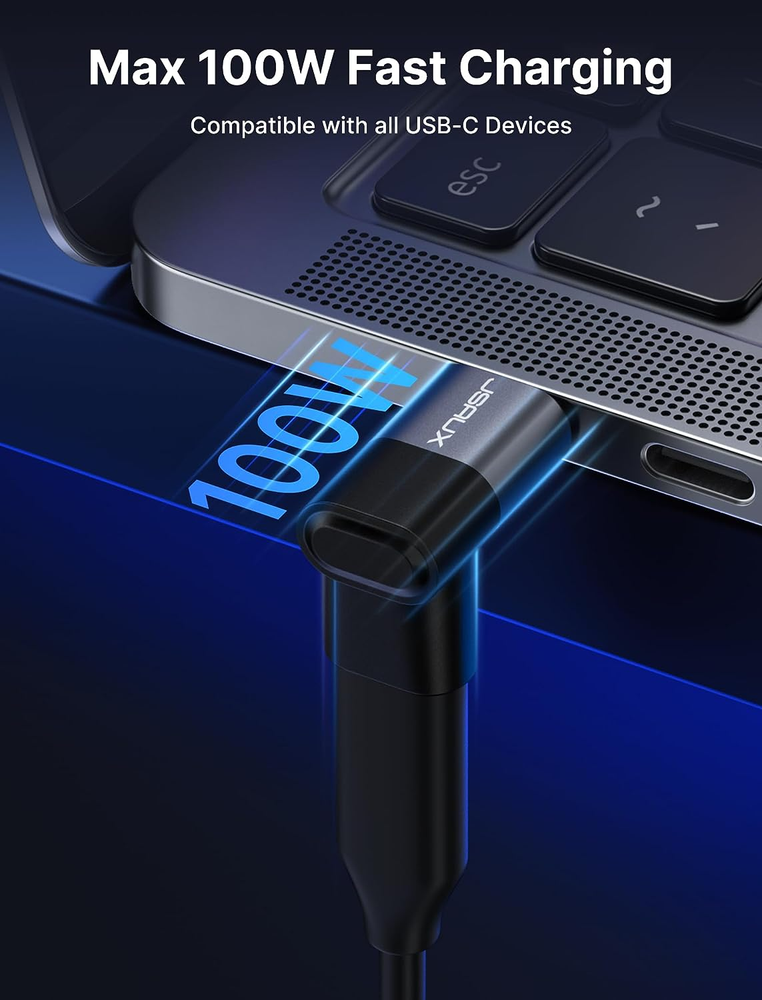 90 Degree Full Function Data Transmission: This Up & Down 90 degree adapter allow the cable to have a suitable extension direction, which can avoid wear and tear on your cables and devices' input ports and save space. Support charging & data transmission. 100W Fast Charging & 40Gbps Transfer Speed: JSAUX right angle USB C adapter up to 5 Amp of output current, providing the fastest possible charging for your devices. Offers data transfer speed of 40Gbps. Note: You need a Thunderbolt 3 or higher cable paired with a Thunderbolt hard drive case to achieve 40Gbps data transfer speeds. 4K@60Hz Video Output: The USB-C 90 degree extender supports up to 8K video signal and audio transferring for the connection between your USB-C devices to another monitor or display with USB C interface. Note: Please make sure both your input device and output monitor have usb type c port and support video input and output. High Quality Assurance: Compared with other right angle adapter, we use premium Aluminum shell add better durability, preventing internal chips and circuits from breaking. Non-Slip Design for easier insertion and removal. Compatibility: Widely work with most Type C devices. For ROG Ally, Steam Deck, Switch, MacBook Pro, Surface Book 2, iPhone 16/16 Plus/16 Pro/16 Pro Max, iPhone 15/15 Plus/15 Pro/15 Pro Max, Samsung Galaxy S24/S23/S22/S21/S20/S10, Note 20/10, LG G7/V20; Google Pixel, ChromeBook, etc. Product Description 90° Right Angle USB C to USB C Adapter Compatible with iPhone 16 & iPhone 15 1 4K@60Hz Video Output 2 Max 100W Fast Charging 3 40Gbps Data Transfer Impove Your Gaming Experience Better L Shape Design Compatile for All Your USB-C Devices Compatible Devices (Incomplete List) USB C Male Port Gaming Devices / Smartphones / Tablets / Laptops Gaming Devices ASUS ROG Ally, Steam Deck, Steam Deck OLED, Nintendo Switch, Switch Lite, VR Smartphones iPhone 16/16 Plus/16 Pro/16 Pro Max, iPhone 15/15 Plus/15 Pro/15 Pro Max, Samsung Galaxy S24/S24 Ultra/S23/S23 Ultra/S22/S22 Ultra/S21/S21+/S10, Samsung Galaxy Note 20/10, Samsung Galaxy A71/A51/A12, Google Pixel 5/4/3a/3a XL/3/3XL/2, Huawei P40/Mate30,LG G5/G6, Sony Xperia XZ, etc. Tablets iPad Pro 2024/2022/2021/2020/2018, iPad Air 6/5/4, iPad Mini 6, Samsung Galaxy Tab, Surface Pro, Surface Go, Kindle Fire HD 10/8 Laptops MacBook Pro after 2016, MacBook after 2015, MackBook Air after 2018, Samsung Galaxy Book, HUAWEI Matebook, Chromebook Pixel Dell XPS 17/15/13, Surface Book 3/2, etc. Others iMac, Mac mini, car charger, usb-c power adapter, etc. USB C Female Port USB-C Cable, docking station, USB-C flash drive, ect.