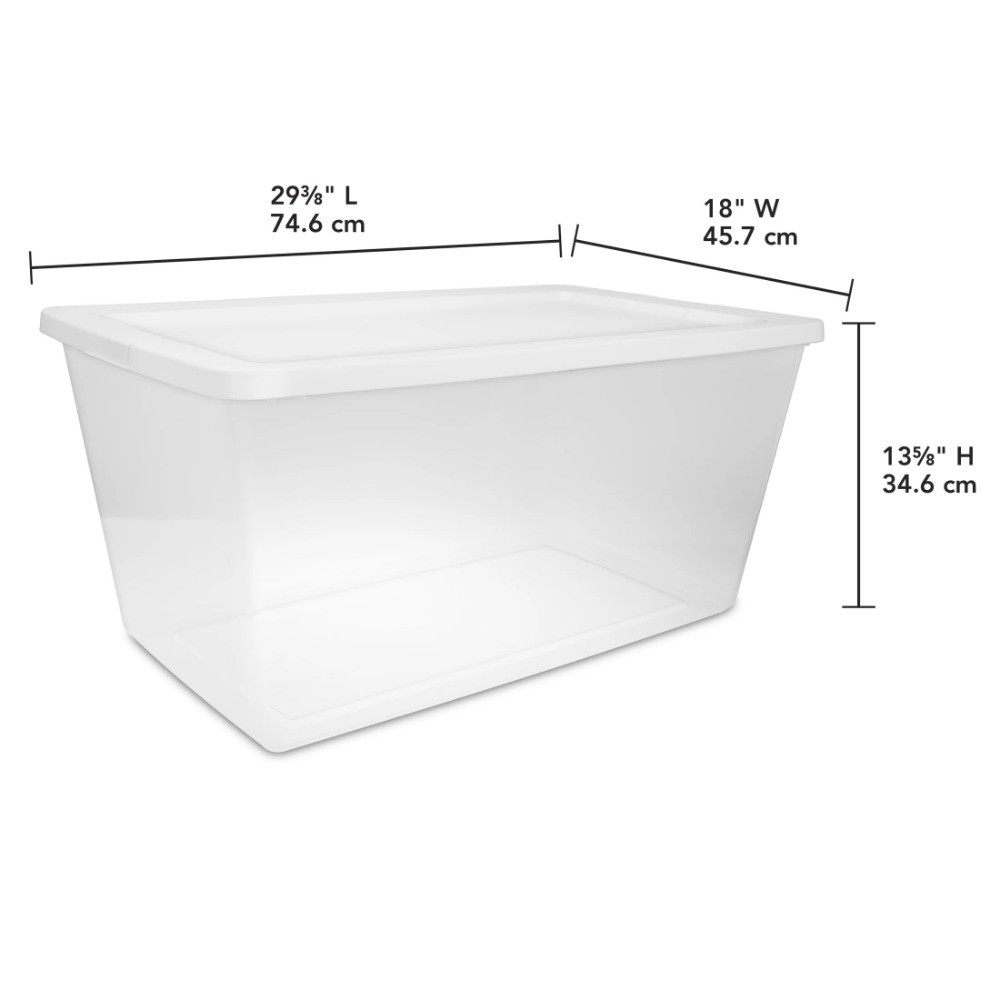 Organization is made easy with the 90 Quart Clear Storage Bin with lid! The clear base lets you see what's inside while the snap-on lid keeps everything contained. The space-efficient shape and deep recessed lids allow bins to stack securely, maximizing vertical storage space. Sort and store a variety of household items to bring order to closets, bedrooms, and more! Ideal for storing sporting gear, sleeping bags, seasonal clothing and other larger, bulkier items. Note: Use good judgment when storing items, don’t overload, keep heaviest bin at bottom, and don’t stack too high. The overall assembled dimensions of this item are 29 3/8" L x 18" W x 13 5/8" H. 90 Quart Storage Box, Clear Plastic Storage Bin with Snap-on Lid, White Outside Dimensions: 29 3/8" x 18" x 13 5/8" Interior Dimensions at bottom: 24 3/4" x 16 5/8" x 12 7/8" Clear base allows you to view contents at a glance Snap-on lids keep contents contained and are recessed to allow for stacking Large capacity is ideal for bigger, bulkier items and basic storage needs throughout the home Use good judgment when stacking items, keep heaviest bin at the bottom BPA-free and phthalate-free