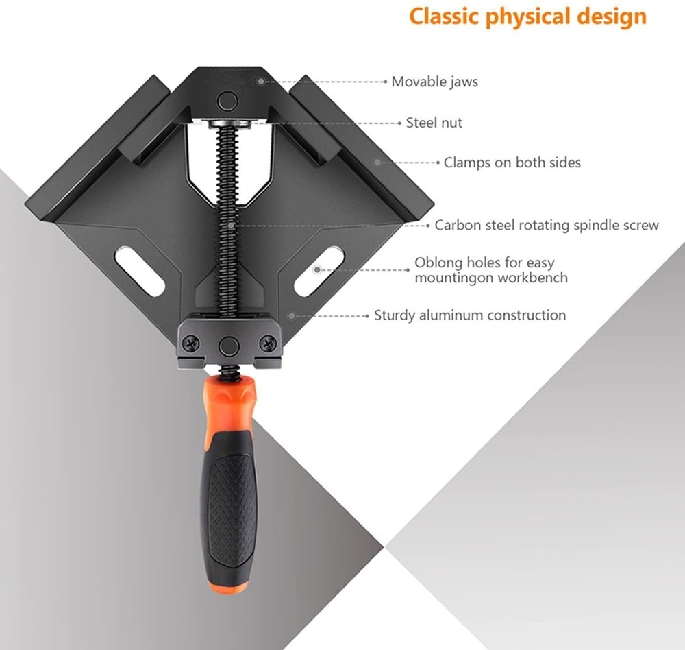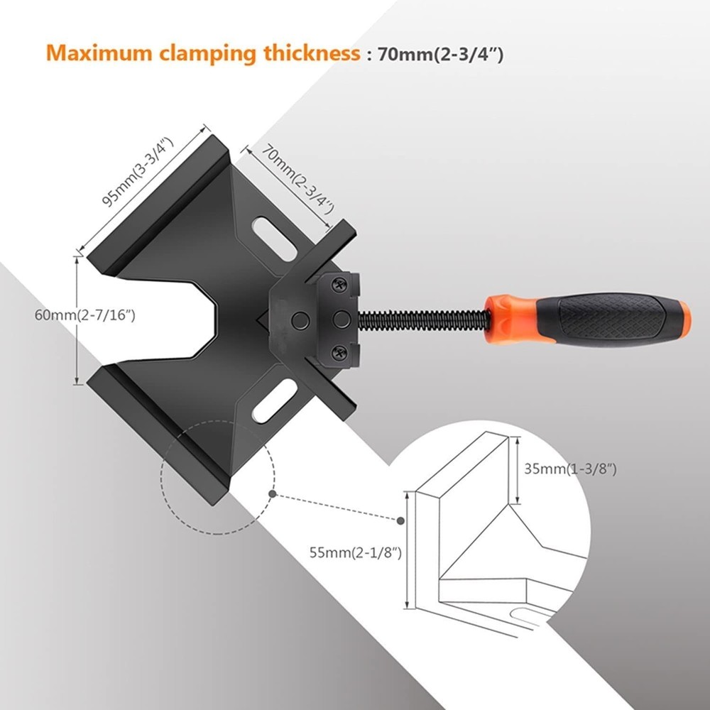 Tacklife Corner Clamp, TACKLIFE Right Angle Clamp, Aluminum Alloy Body, Swing Jaw, Carbon steel threaded rod for the connect of wood, Sufficient Clamping Pange: Maximum clamping range is 2.75in/70mm, jaw width: 3.75in/95mm, jaw depth: 1.4in/35mm, Allows two wood block with different thicknesses to be connected at right angle. It can accommodate most of the large things, such as metal tube, steel rod, wood, thick glass, for making cabinets, box-frames and picture frames, fish tanks, and more. Aluminum Alloy & Long-Lasting:The 90° right angle clamp is made of high-quality aluminum alloy material with the structural rib design, ensures the durability of the tool itself. Die-casting based construction and heat-treated carbon steel threaded rod guaranteed it a longer life. Convenient Use:Swing jaw design can be rotated in two-way, making clamping more convenient to clamp and holding work pieces precisely, the oblong holes allow you fix it on workbench. Ergonomic Design:Anti-skid handle is nicely covered with rubber to ensure users’ comfort for hands, minimizes your fatigue for a long time working.