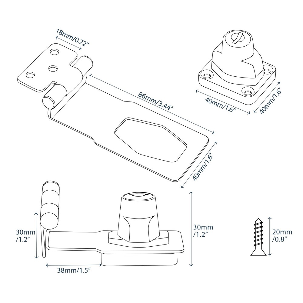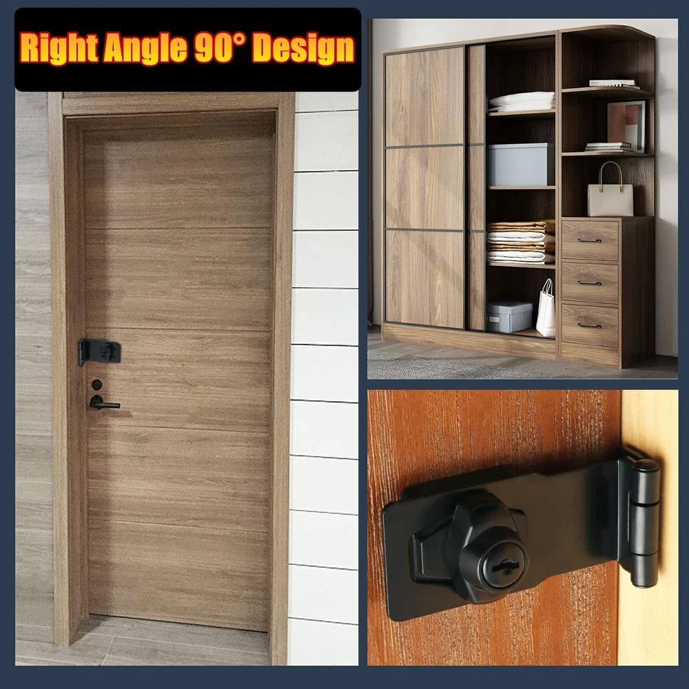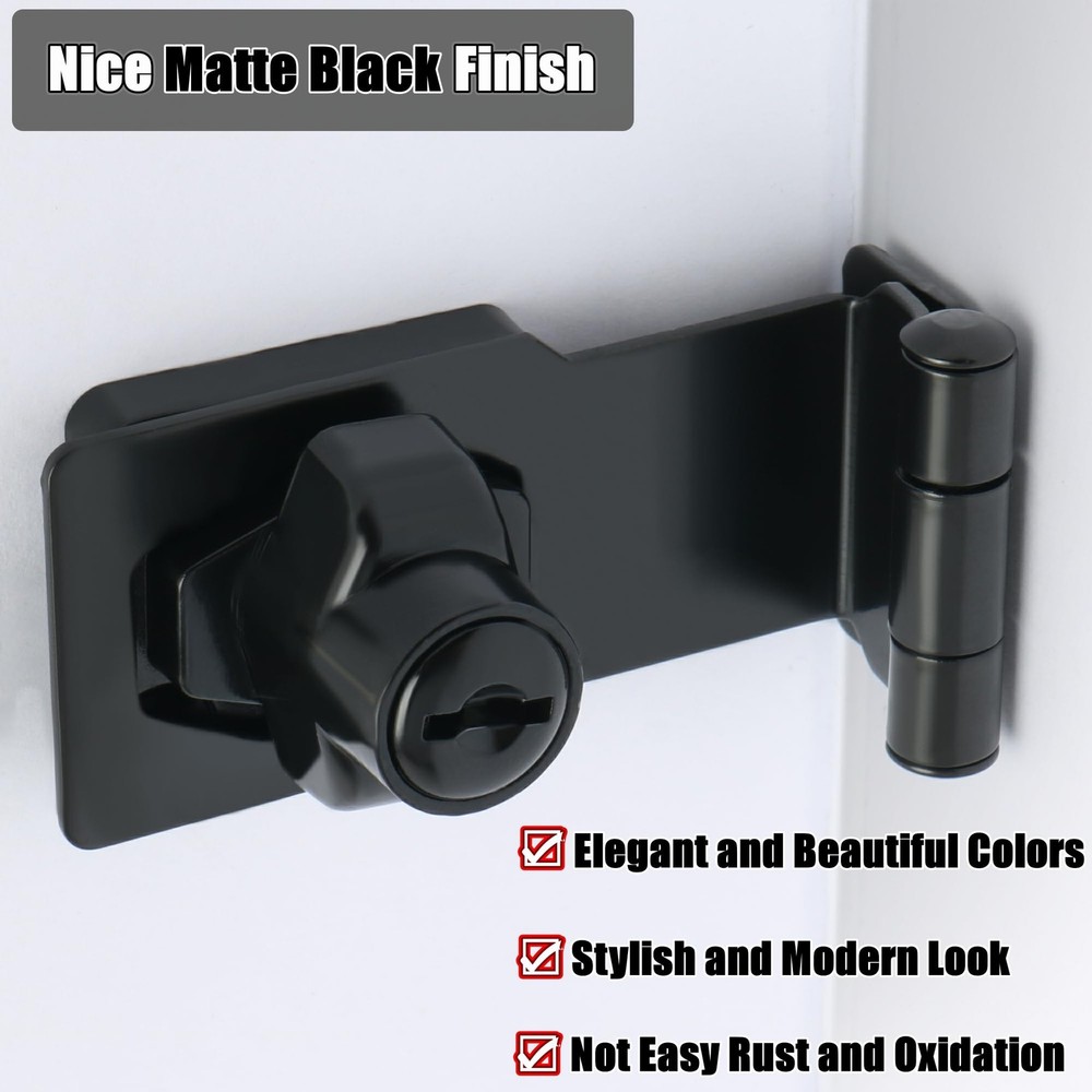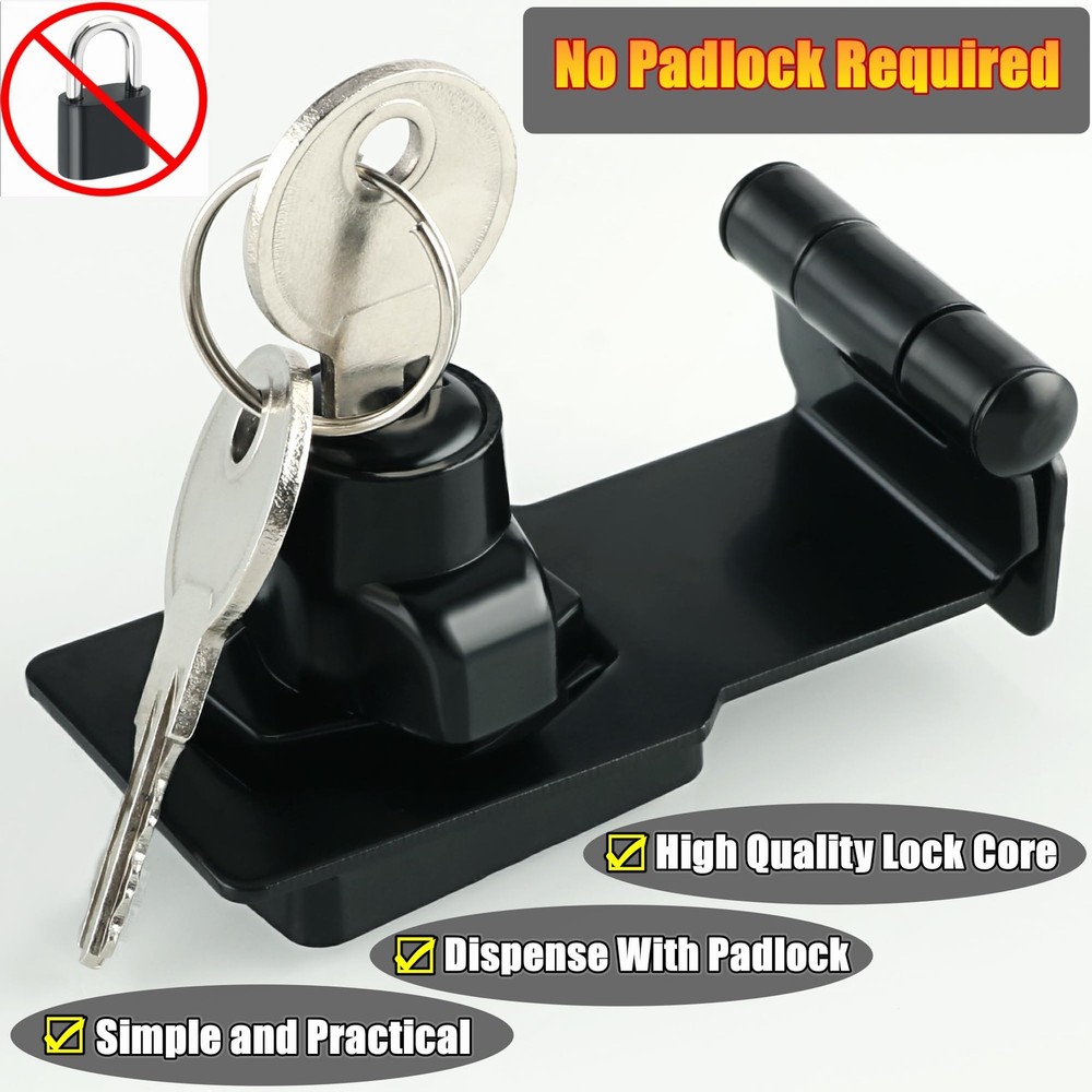 Specifications Material:alloy metal Finish:Black Package Includes: 1 x Hasp Screws and 2 keys Installation Method :Screws mounted The Hasp Lock uses high quality lock core and comes with keys, which is simple but secure and eliminates the need for padlocks, Offers Reliable Protection Against Intruders. The hasp Latch with a right angle 90° design, which can be used for a variety of right Angle door frames or irregular shape doors. Easy To Install Suitable for all kinds of cabinets, wardrobes, fence, drawers, boxes, outdoor, Windows, sliding doors and so on 【Premium Material】The hasp lock is made of thickened solid metal material( hi-q solid zinc alloy), ensuring quality and longevity, strong and durable, not easy to rust and oxidation.Brushed finish surface makes it a better looking ,more smooth and beautiful,not easy to oxidation, fading and paint off,which is a good match to modern home. 【Right Angle 90° Design】The hasp lock latch with lock with a right angle 90° design, which can be used for a variety of right angle door frames or irregular shape doors. 【Automatic Fast Security Lock】With automatic lock cylinder, lock hasp can be quickly locked by directly turning it 90°.The keyed hasp lock no padlock required,uses high quality lock core and comes with keys, which is simple but secure and eliminates the need for padlocks, offers reliable protection against intruders. 【Wide Applications】The locking hasp is suitable for installation in the place where you need to lock protect your house, property, and personal privacy. Such as all kinds of door, window, cabinet, drawer, furniture, pet cage, closets, cupboards, storage containers, sheds, storage bins, garage doors, tool boxes,sliding doors, wardrobes, fence,and etc. 【Easy To Install】Just install the lock hasp latch with the euqipped screws. Installation and maintenance are simple and practical. The bolt lock can also be mounted on the left or right.