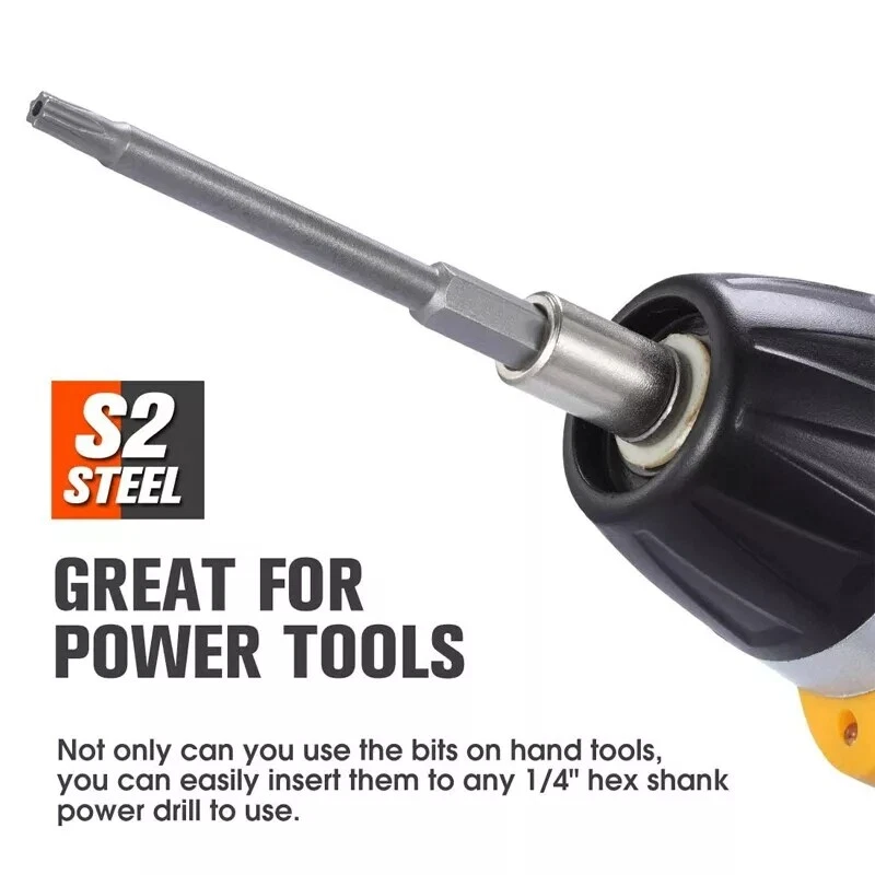 Product D escription 12PCS Torx Screwdriver Bit S et 50mm + 1PCS Torx S crewdriver R atchet Product Characteristics High Q uality I ndustrial G rade M aterials: The Torx screwdriver bit set is made of high-quality S2 alloy steel with a special heat treatment process to increase the torque and full hardness of the bit, and it has good wear resistance and is more durable than regular Torx screwdriver bits. High P recision M achining T echnology: The product adopts CNC precision machining technology to ensure the accuracy of the product, so that the drill can withstand the instantaneous impact of large torque pneumatic tools, which greatly improves the service life of the product itself. Magnetic: The magnetic Torx screwdriver drill set can quickly and easily adsorb screws, greatly improving your work efficiency. Repeated use does not diminish the magnetic force. Suitable F or A V ariety O f P ower T ools: The 1/4" hexagon handle allows it to accommodate a wide range of power tools, allowing you to quickly change chucks. Suitable for electric drill, air drill, electric screwdriver, manual screwdriver and so on. A W ide R ange O f U se S cenarios: It can be widely used in automobile, home, industrial and other maintenance, and can also be used in other screw drives. Mechanical P rinciple D esign: Strong torque, high torque, after contact with the screw head, the impact reaction force generated by the impact screwdriver is absorbed by the torque part, effectively preventing the damage of the tool head. Straight and concentric, tight bite. 36 F oot R atchet F orward A nd R everse S crewdriver: The screwdriver gear is made of high-quality carbon steel, and the handle is made of ABS material. It can be used in a small space, and can be connected to the screwdriver bit or the sleeve. The interface is 1/4" hexagonal head (6.35mm), which meets most of the screwdriver bits and sleeves on the market. Built-in strong magnetic, adsorption is easier. The screwdriver has a ratchet switch design, the switch can adjust the forward and reverse rotation, and the 36 foot ratchet makes the operation easier. Product Specification Screwdriver B it: Status: 100% Brand New Material: S2 A lloy S teel Quantity: 12PCS Shank T ype: 6.35mm/ 1/4" H ex S hank Length: 1.97"/50mm Tool H ead S pecifications: T5, T6, T7, T8, T9, T10, T15, T20, T25, T27, T30, T40 36 F oot R atchet F orward A nd R everse S crewdriver: Status: 100% Brand New Gear M aterial: C arbon S teel Handle M aterial: ABS Package Included 12 PCS × 50mm Torx Screwdriver B it 1 PCS × 36 Ratchet Handle Attention P lease 1. Please allow manual measurement error of 1-5mm. Make sure you don't mind before you buy. 2. Due to lighting effects, brightness contrast Settings of the display, etc., there may be some slight differences in the hue of the picture and the actual item, please make sure you don't mind.