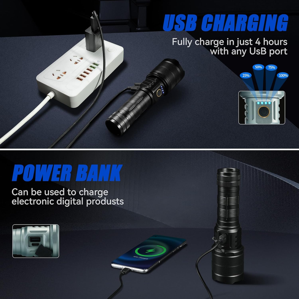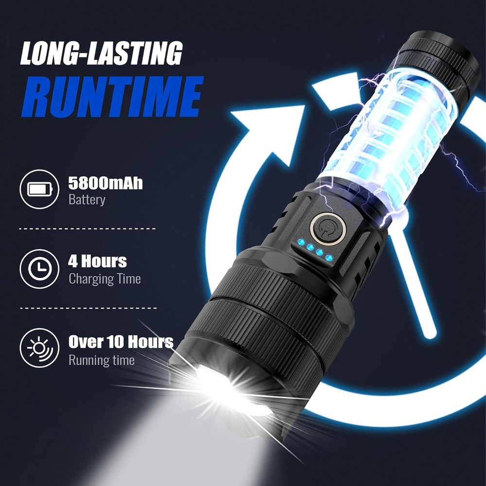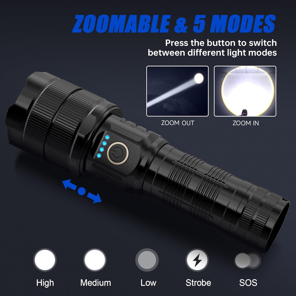 900,000 Lumens Rechargeable LED Flashlight – Super Bright, High-Power, Long-Lasting Portable Light for Camping, Hiking, Emergencies, and Outdoor Adventures