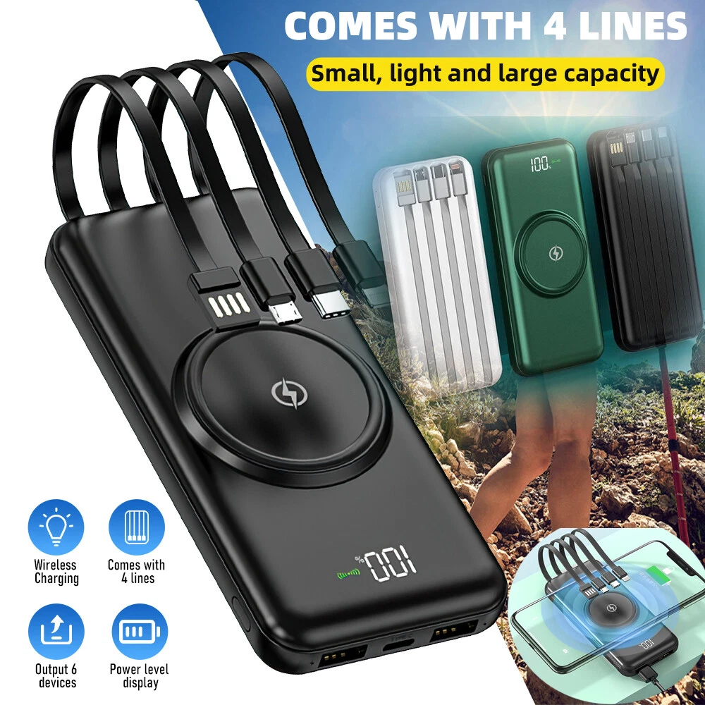 Features: 【Built-in 4 cables + 15W wireless charging】Wireless portable charger supports 5W/7.5W/10W and 15W MAX wireless fast charging; Built-in 3 5V2.1A output cables, for iPhone, Type-C, Micro, and1 USB input cable. 【The Safety Of The Power Bank】Built-in intelligent chip automatically identifies the charging device, Safety circuit design, multiple protection - overcharge, over-discharge, overcurrent, short circuit, overvoltage, overtemperature. 【Universal Compatibility】3 different built-in 3 output cables can be charged by almost kinds mobile phones, iPhone,Samsung,Nokia,Google Pixel,Nexus,Android phones,iPad and more,compatible with 90% electronic devices in the market. 【Small Slim Design & Light weight】extremely convenient for travel and daily use in charging electronic devices i.e. mobile phones,camera,headphones,player,smart watch and tablets. Compatibility: For iPhone 13 Mini/13/13 Pro/13 Pro Max For iPhone 12 Mini/12/12 Pro/12 Pro Max For iPhone 11/11 Pro /11 Pro Max For iPhone X/XS/XS MAX/XR For Apple AirPods For Samsung Phone For LG Phone For Motorola Phone For Other Phone(support wireless charging) Package included: 1x 900000 mAh power bank