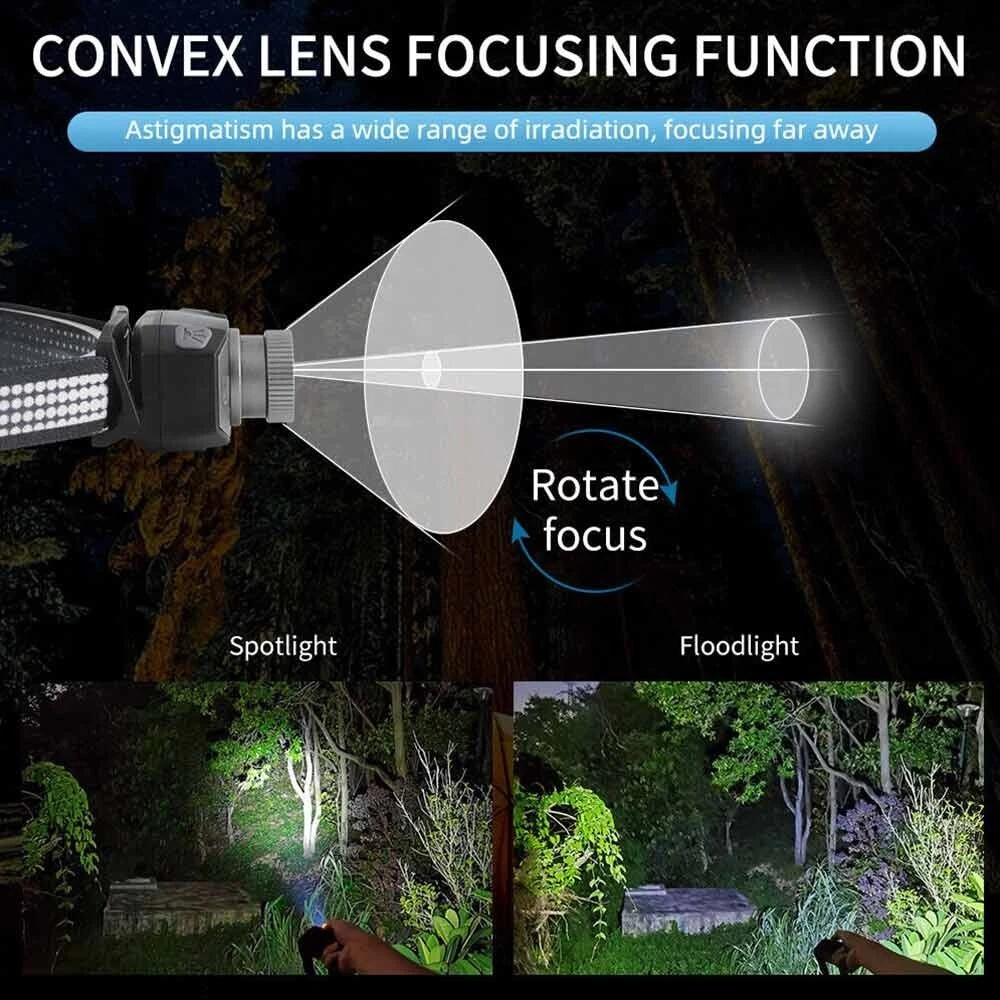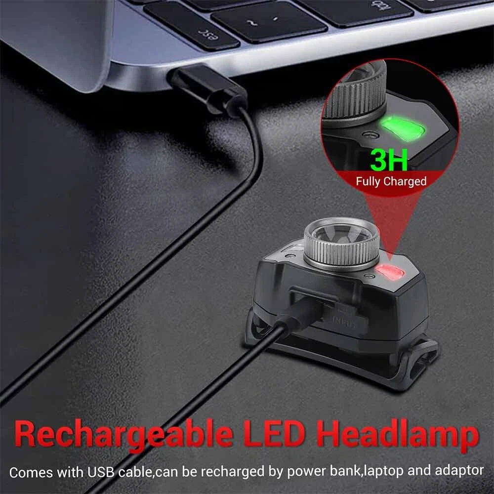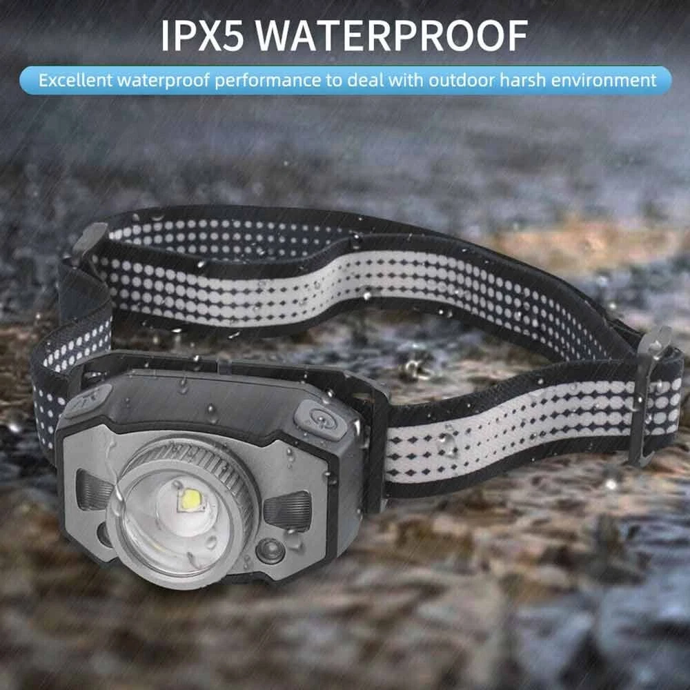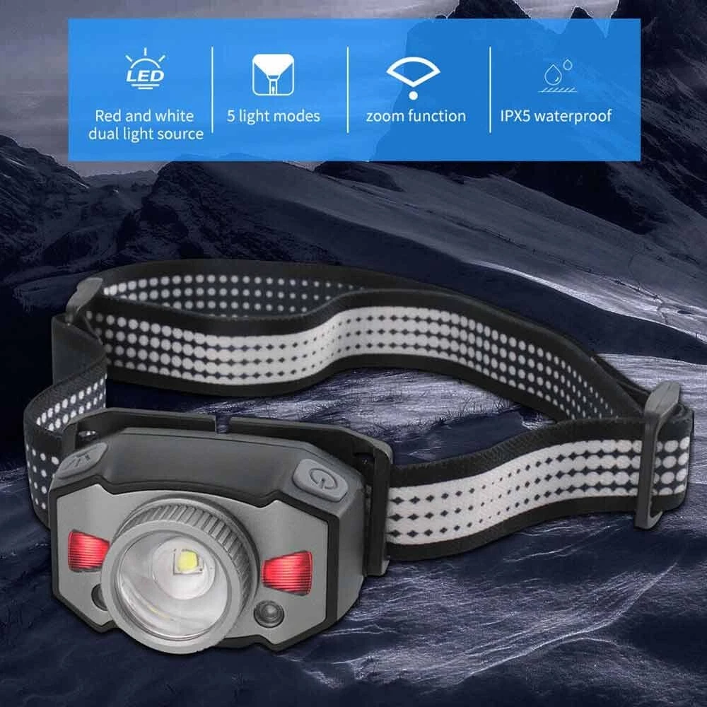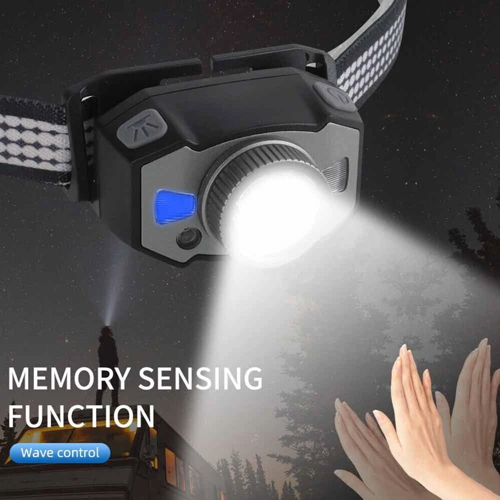 Feature: 1. 5 Light Modes: High Light--Mid Light--Low Light--Red Light--Strobe 2. Smart Wave Sensor: Just waving your hand in front of the headlamp to control it on or off ! 3. Built in 800mah battery, 4-400 hours long battery life 4. Telescopic zoom, micro usb rechargeable 5. Applicable scenes: hiking, cycling, camping, exploration, rock climbing, hunting, fishing, construction, maintenance, home, etc Specification: Product name: B33-1 focusing headlamp Material: PC+aluminum alloy Power specification: built-in polymer battery Battery capacity (MA): 800MAH Rated voltage (V): 3.7 V Static power consumption (UA): 2 Charging interface: MICRO USB Charging indicator: red when charging, green when fully charged Charging time: 3H Discharge time: strong light 4H medium light 5.5H weak light 15H red light normally bright 120H red light flickering 400H Intelligent wave sensing: wave the control switch 10CM from the lamp head Radiation distance: 72M Lens: frog eye convex lens (focus display dot) Focusing: 360 degree rotating focusing (astigmatism focus) Lamp body adjustment: adjust the irradiation direction up and down at 45 degrees Waterproof grade: IPX5 Anti falling height: 1m Applicable population: 15+ Product weight: 69g Package List: 1X Headlamp 1X USB Cable 1X Box