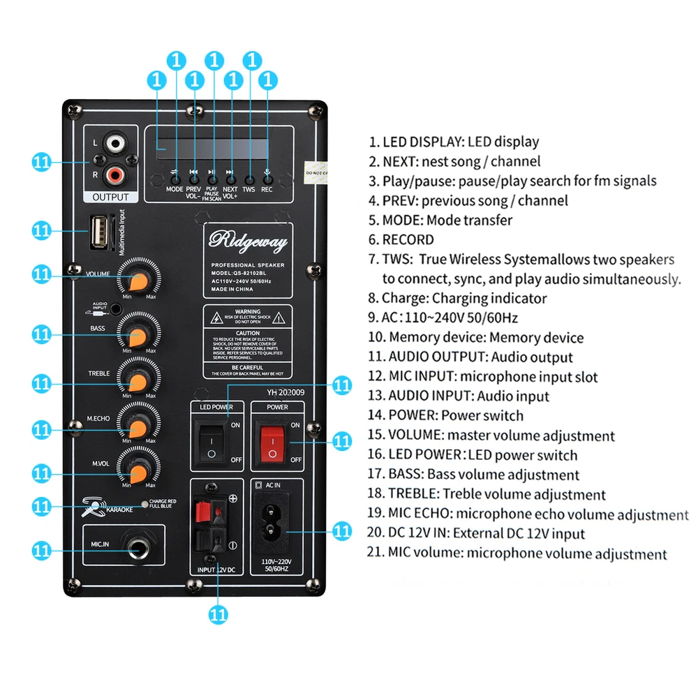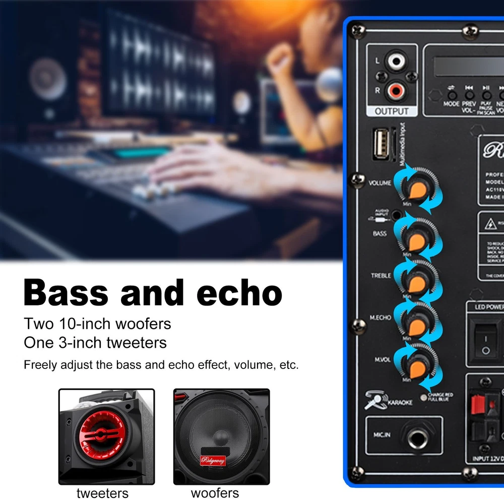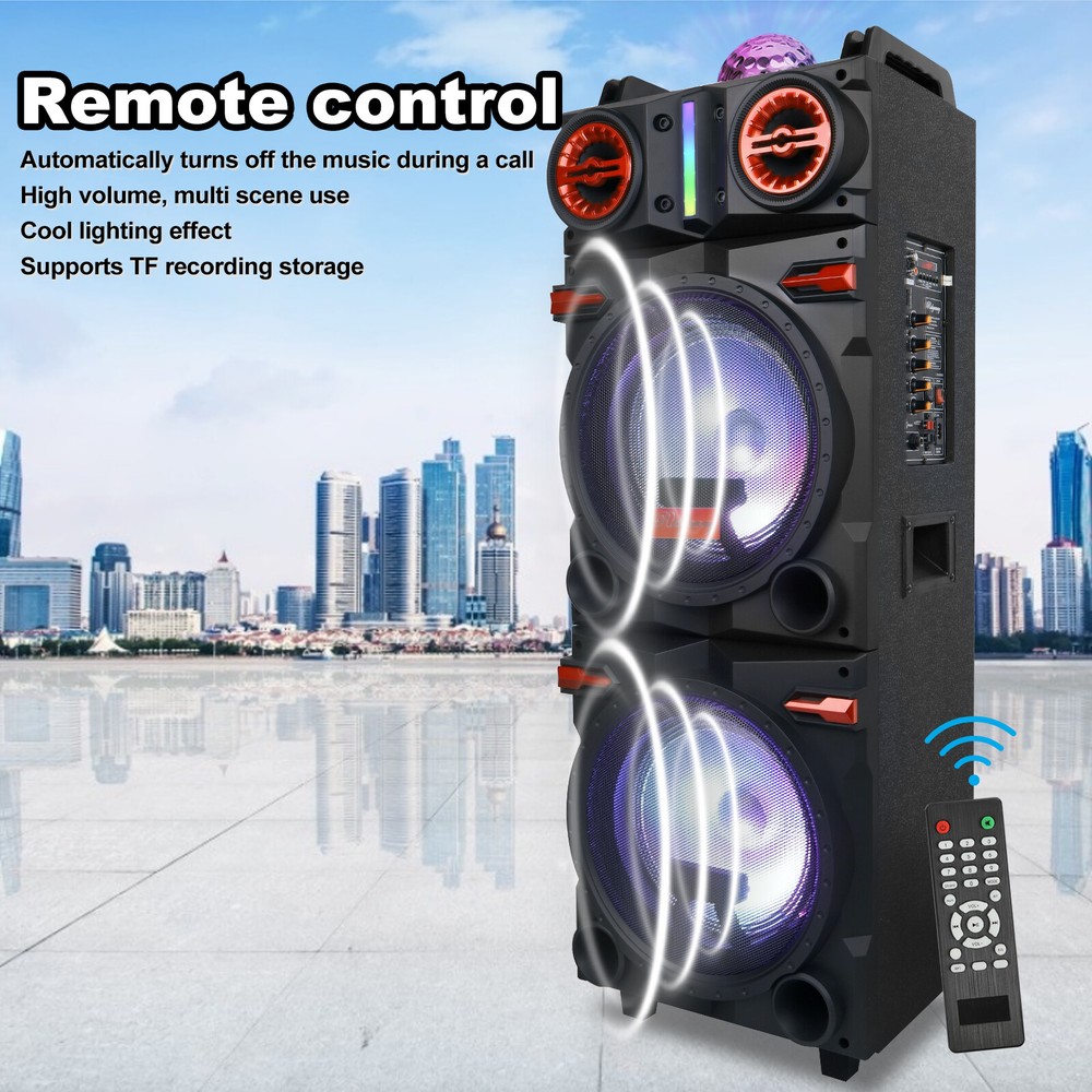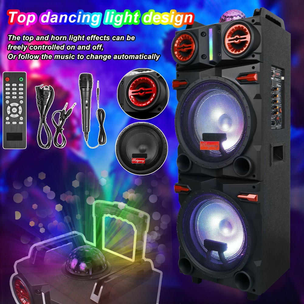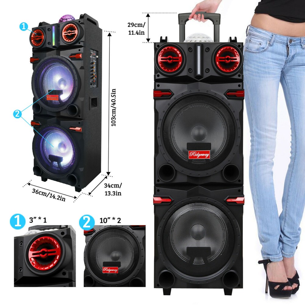 9000W Portable Bluetooth Speaker Rechargable Dual 10" Woofer Party FM Karaok Specification: Audio input: memory card/BT/FM/AUX Speaker Dimensions: 2 x 10" subwoofer and 1 x 1" tweeter Power supply: AC110-240V 50Hz/60Hz Output power: 80W Frequency Response: 45Hz-18KHz Sensitivity: 85±2dB Battery capacity: 12V/4.5A rechargeable battery Colour: Black Product unit net weight: 15.3kg/33.73LBs Product unit G.W.: 16.2kg/35.71LBs Packing size: 42*34*110cm/16.54*13.39*43.31inch Feature: Dual 10"9000W Speakers : Enjoy powerful sound with the speaker's 10" speakers, delivering rich and clear audio that fills the room. Whether it's your favorite tunes or energetic beats, the speaker ensures an immersive listening experience. Smooth Bluetooth Connection : Allows you to stream your favorite music straight from your smartphone, iPod, tablet or any other suitable BT device within 10M/32 feet. Just move about and keep the music going with no cable and no hassle. Multi-Inputs : Bluetooth Connectivity, USB, TF, FM, or AUX with Bass and Treble Controls. 6.5mm Microphone Jacks with Volume and Echo Controls. Portable & versatile : Take the party with you wherever you go! The speaker is designed for portability, making it easy to bring the music and lights to any location - be it backyard barbecues, beach parties, or camping adventures. Colorful RGB Lights : Our Bluetooth karaoke speaker comes with two large disc-like RGB lights that change color and shape as music plays. It will arouse kids' interest and distract their attention from videos & games. Dynamic lights also let you feel energized and relaxed. High Capacity Battery: The speaker comes equipped with a large battery, allowing you to enjoy music for an impressive 5 hours at 70% volume. Keep the party going without worrying about running out of power. TWS Function: Two speakers interconnect via Bluetooth and play together, offering enhanced bass and engaging atmosphere. Package Included: 1 X speaker 1 X Wired Microphone 1 remote 1 X Audio Cable 1 X Power Cord 1 X Manual Shipping Payment Return & Refund policy Customer Support - Contact Feedback Shipping FREE SAME BUSINESS DAY MONDAY- FRIDAY SHIPPING FROM USA. All orders and payments received before 4PM EST (1PM PST) will be shipped the same business day. No shipping on Weekends or US Public Holidays. No responsibility for any custom duty Shipping information will be updated when available. Payment 1. All payments must be prepaid before shipping. 2. We only accept payment via PayPal. Please kindly check if you can do the payment via PayPal before placing an order. Return & Refund policy (1) We stand behind our items and offer 30 days warranty. All items are in brand new condition unless specified otherwise elsewhere in the description. (2) All returns - defective or otherwise - have to be preauthorized. Please contact us to get an authorization and returning address before sending the item back. If an item is returned because of an undeliverable shipping address, buyer agrees to pay the cost for re-shipment. (3) Please note that If the return/replacement is not a result of our mistake (not defective or wrong item), the buyer is responsible for return shipping, as well as a 20 percent restocking fee. (4) Replacement or refund will be made upon receipt of the returned item. If you do not want to wait for the replacement, you can just reorder one and then send the first one back for a refund. Customer Support - Contact Please do not hesitate to CONTACT US. You can message 24/7 on eBay for all questions and inquiries. We will get back to you within 1-2 business days at the latest. Feedback We strive to provide the best service and reliable products for every customer, however, accident may happen sometimes, please contact us to resolve any issue before leaving a negative feedback.