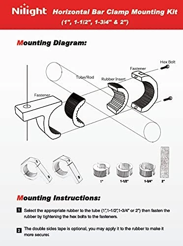 90020B 2 Pack Mounting Bracket Kit LED Off Road Light Horizontal Bar Tube Clamp Roof Roll Cage Holder, 2 Years ,Black Sturdy bracket: Strong aluminium alloy, fix the light on tube firmly, raise the light bar height to avoid scratches while driving Useful rubber: High quality rubber inserts dampen driving vibration and avoid scraping bull bar surface. Simplifies the installation of off road LED light bars onto the roof rack, roll cages bull bar or head rack of your ATV, UTV and trucks Wide application: can be used on tubes of 1 inch, 1-1/2 inch, 1-3/4 inch & 2 inch diameter and applied to LED light bar for almost all kinds of vehicle Easy installation: Pre-drilled hole, allows more lights to be added to vehicle without drilling, Allen hex key included for quick installation Package includes: 2Pcs LED light bar mounting bracket Shipping We offer FREE shipping on all orders! We ship within Three business days of payment, usually sooner. We use a selection of shipping services such as UPS, FedEx, USPS etc. We only ship to the lower 48 states, no APO/FPO addresses or PO Boxes allowed. Local pickups and combined shipping options are not provided at this time. Return You can return a product for up to 30 days from the date you purchased it. Any product you return must be in the same condition you received it and in the original packaging. Please keep the receipt. Payment We accept payment by any of the following methods: PayPal Please pay as soon as possible after winning an auction, as that will allow us to post your item to you sooner! Feedback Customer satisfaction is very important to us. If you have any problem with your order, please contact us and we will do our best to make you satisfied. Contact Us If you have any queries, please contact us via ebay. We usually respond within 24 hours on weekdays. Please visit our eBay store to check out other items for sale! Thank you for shopping at our store.