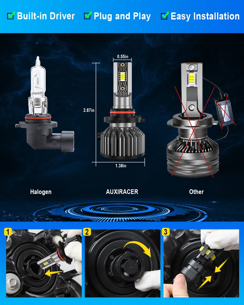 Specifications: Bulb Size : 9006/HB4 Usage : Low Beam or Fog Light Package includes : 2 Bulbs Voltage : DC 9-16V Light Power : 100W/set (50W/bulb) Luminous Flux : 36000LM/set (18000LM/bulb) Color Temperature : 6,000K Xenon White Lifespan : Over 30,000 hours Certification : IP67 Waterproof, CE, RoHS NOTICE: 1. This product is polarized, with positive (+) and negative (−) symbols on the plugs. If it doesn't work, try reversing the plug and inserting it again. 2. Our LEDs are designed to replace halogen bulbs only and will not fit vehicles with factory LEDs or HIDs. Features SUPER BRIGHT : 100W, 36000LM per pair with stronger, more concentrated light output, 600% brighter than the original halogen bulbs, allowing you to see more clearly when driving at night. OPTIMAL BEAM PATTERN : Our LEDs have the same beam pattern as the halogen bulbs with a clear cut off line, without any dark spots or shadow areas and no glare to oncoming traffic. 5 - M INUTE INSTALLATION : All-in-one design, bulid-in driver for taking up less space in housing, no bulky external driver, no extended bulb base, no more modification on housing or cover. Real plug and play, smoothly fits into vehicle's housing and factory sockets even with limited space in original housing. LONG LIFESPAN : The efficient cooling system with integral aerospace aluminum body, unique hollow engraved heat sink design and smart IC ensures a longer life for the LED conversion kit. NOTE: 1. Our LEDs replace halogen only, they don’t fit your vehicle with factory LEDs and HIDs. 2. Fitment Compatibility may not be 100% accurate, if you are not sure which bulb size you need, please check your vehicle manual or stock bulb model. 3. LED bulb is low power device, the following issues may occur if you want to use LED bulb on some European vehicles: Hyper Flashing, No Flashing, or Error Code. Those are NOT problems of LED bulb and NOT covered by warranty. You may simply add a set of load resistor (NOT included) to avoid those issues. It can be solved with a decoder (decoder must be purchased separately). Payment Shipping Return Contact us FAQ Payment 1. We gladly accepts payment via PayPal, We will ship your item(s) within 24 hours. 2. Before payment, please keep the consistency of Paypal address and ebay address. 3. Quantity orders are welcome. Shipping 1. All items will be shipped in 24 hours after receiving your payment. 2. We ship this item to US only via USPS or UPS. It usually takes 3-6 working days for delivery. Return 1. We offer a 30 days return policy. Please contact us within 30 days of receiving your order if you have any issues about the product or would like to return it. Refunds will be sent after we receive your returned package. 2. All returned items should be in the original packaging, return tracking information should be provided. 3. Buyer is responsible for return shipping cost due to the problem not caused by item quality itself . Contact us 1. We maintain high standards of excellenceand strive for 100% customer satisfaction. If you have any questions, please feel free to contact us. 2. Negative feedback won't help solve any issues, please contact us via eBay messages before leaving negative feedback. The customer service will make every effort to help you solve your issues. 3. Feedback is very important to us. We request that you contact us immediately before giving us neutral or negative feedback so that we can address your concern satisfactorily. FAQ Q1: Will this bulb fit my vehicle? A: We can match almost any vehicle to one of our bulb sizes. eBay only lets us include some vehicle fitments per listing, but if your vehicle does not show up on the compatibility table at the top of our listings, welcome you to contact us for free consulation before purchasing a product. Q2: My item has not arrived, what's taking so long? A: Sometimes items take longer than expected, especially if it’s going far or to rural area. Check with your post office to see if your item has been held up. Sometimes USPS will not update a tracking number until it has arrived at its destination. If your item still has not arrived after a few days, let us know so we can double check for you and help solve it asap. Q3: Do I need to mention the Year, Make and Model in the notes when place order? A: YES. Please include the Year, Make, and Model in the notes section during checkout to ensure you receive everything needed for your kit! Q4: My bulbs won't fit, help! A: Special bulb holder may be required. See if you can take the holder from the stock bulb. If not, let us know. The bulb size may be wrong, double check the item you received with the item you ordered. Do you have an aftermarket lighting housing? These may not be perfectly fitted for aftermarket bulbs and will require some manual modifications. Q5: Neither side lighting up? Both sides flicker, flash, or work inconsistantly. A:Check the headlight fuses, and then check the ballast plugs to insure correct installation. If this doesn't work, there may be a voltage problem with the vehicle. You probably just need a relay or capacitor (decoder must be purchased separately). Q6: WARNING ABOUT POLARITY Unlike halogen bulbs, LED are polarity sensitive. BEFORE you start your LED kit installation, verify the polarity on your vehicle by simply plugging the LED bulb into your vehicle socket. - if your light turns on, please proceed to install both bulbs onto your vehicle. - if your light DOES NOT turn on, disconnect the bulb and flip the socket in order to reverse the polarity (this will not damage your vehicle electrical system in any way). Once you made sure the LED bulb turns on, please proceed to install both bulbs onto your vehicle. Note: There is no convention when it comes to polarity. Different car manufactures have different polarity setup, even within the car model the polarity setup on your low beams and high beams might be different. On Nov 20, 2024 at 08:07:12 PST, seller added the following informati