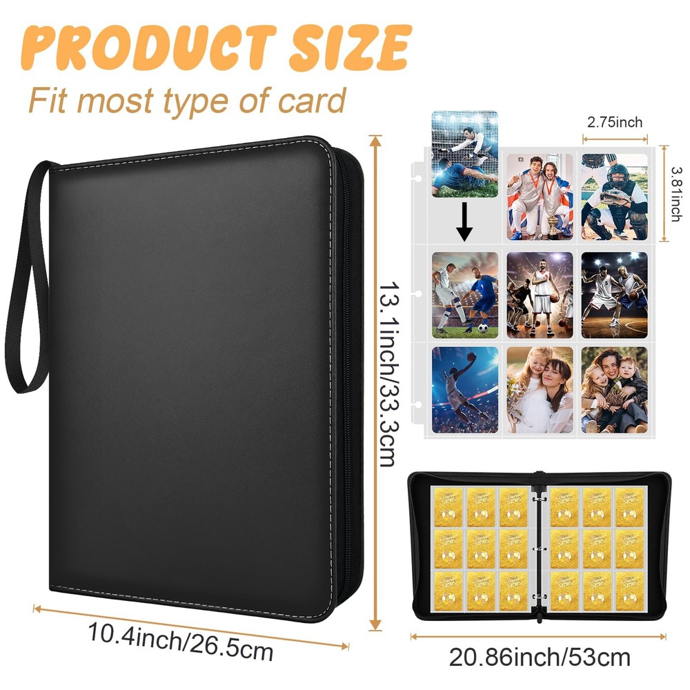 This 9-pocket card binder is a must-have for any trading card enthusiast. With ample storage capacity, durable construction, and a sleek design, it's the perfect companion to help you keep your collection safe, organized, and ready for display. 【900 Pocket Design】- The exquisite card collect binder has 50 pages of double-sided transparent pockets, with each side holding 9 cards, allowing you to collect up to 900 cards! The extra-large capacity can hold all your cards! The card binder’s card page pockets measure 2.8*3.9 inches, perfect for storing the cards you wish to collect. This trading card binder is not only designed to protect your cards but also serves as an excellent way to showcase your collection! 【Unique Design】- The sport card binder comes equipped with removable metal clips, allowing you to easily add, remove, and move card pages. The transparent pocket design makes it easy to perfectly display your cards! The sport card binder also features a wrist strap, making it convenient for both children and adults to carry, whether at home or on the go. Take your cards with you and show them to your friends! 【Multiple Protection】- playing card binder’s surface is made of PU leather material, making it waterproof and stain-resistant. The top loader binder’s exterior has been reinforced to protect your cards from being squeezed! Additionally, the trading card binder is equipped with a zipper design, ensuring your cards are safely stored. This is a must-have for card collectors! 【Compatible with Multiple Cards】- The card binder is compatible with standard-sized cards, such as baseball cards, basketball cards, star trading cards, TCG cards, 3 inches photos, playing cards, and more. If you have a collection of cards, you’ll definitely need this card holder binder! 【Perfect Gift】- This is a perfect gift designed for card enthusiasts. The beautiful card binder offers multiple protections for your cards and can be given as a birthday, Christmas, New Year, or holiday gift. It’s the ideal present for card collectors, kids, and friends!