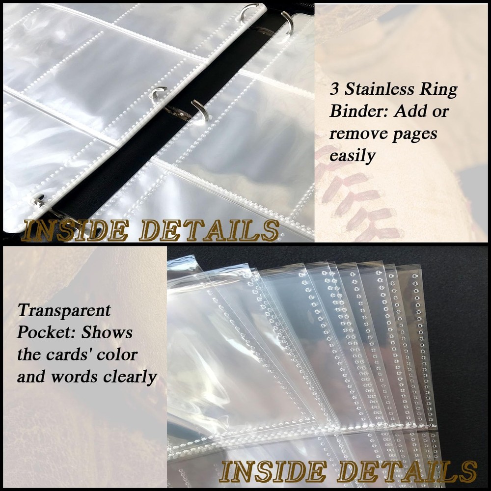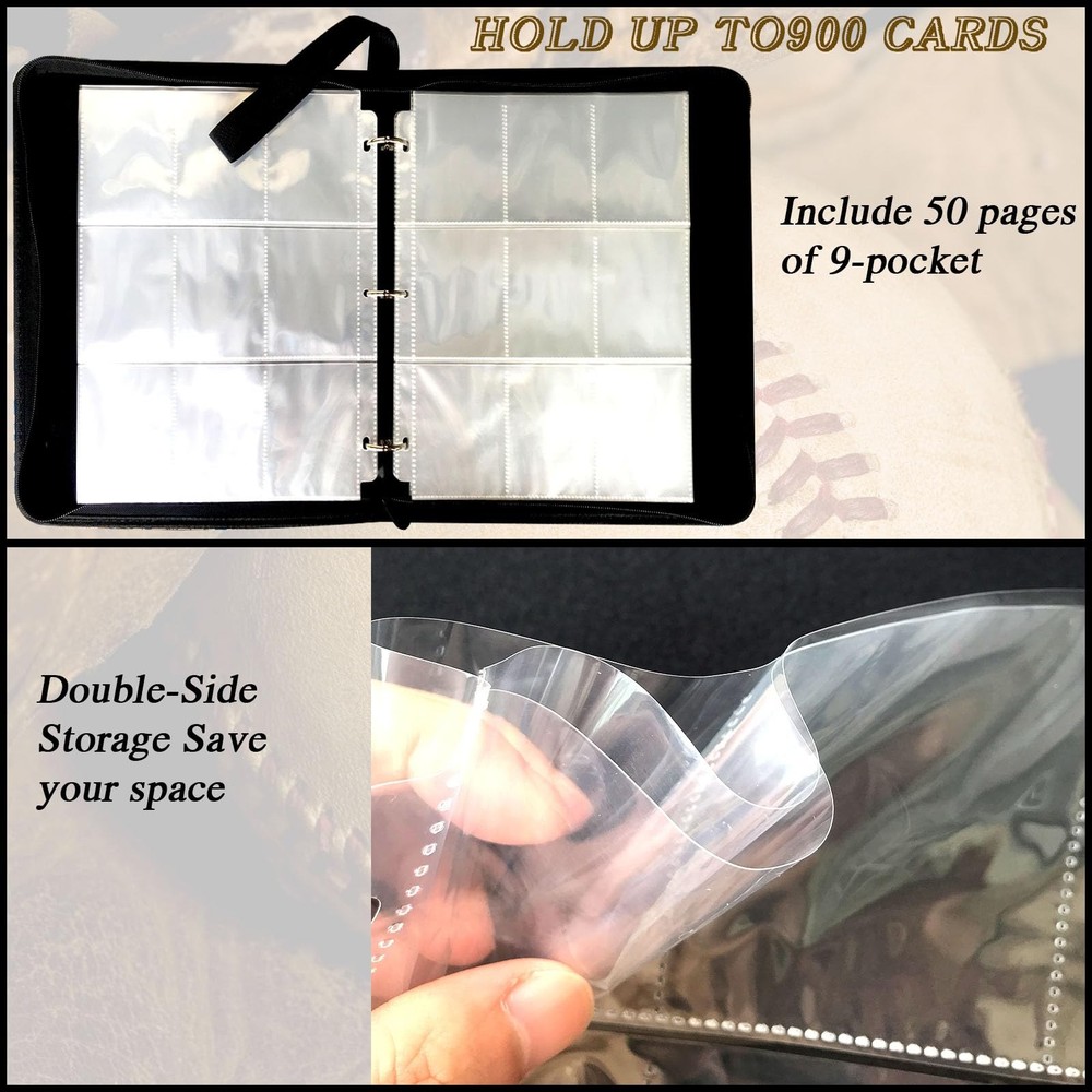 Baseball card binder is made of high quality PU leather, durable and waterproof. Highly transparent card sleeve for easy display and browsing. The zipper design ensures that the cards cannot be lost. All-round protection for your cards. The 9-pocket card binder with 50-page sleeve can hold 900 cards. Store and display your cards in this trading card binder to keep them organized. Compatible for Different Card, Trading card binder fits all standard size cards like soccer card football cards, baseball cards, top aces, game cards, attack cards and more. 【Baseball Card Binder 9 Pocket】Each baseball card binder has 50 pages, each page has a double-sided card slot,holds up to 900 cards. hobby. Fits any standard, 3-hole pages or paper. It is refillable/expandable, It means that you can arbitrarily increase or reduce the number of internal Pages. 【Waterproof PU Fabric】Sport card binder is made of premium PU leather, they can be easily wiped even if they are accidentally covered with a little stain. The middle layer is protection material-Velvet, which has good shock and moisture resistance and provides a series of protection. 【 Unique design】Baseball card binder with sleeves have a unique design, bright and colorful cover design, and baseball fans like this design to make them look different. The extra wristband design makes the card binder easy to carry to your friend's house or travel. 【Applicable to Various Cards】Trading card binder applicable to various cards,It is compatible with other standard cards such as YuGiOh, Magic Cards, Football Cards, Baseball Cards, Game Cards etc. 【Ideal Gift】 Help kids develop good storage habits. or as an album for school supplies! This is an ideal gift for card collectors, Sports fan, children and friends
