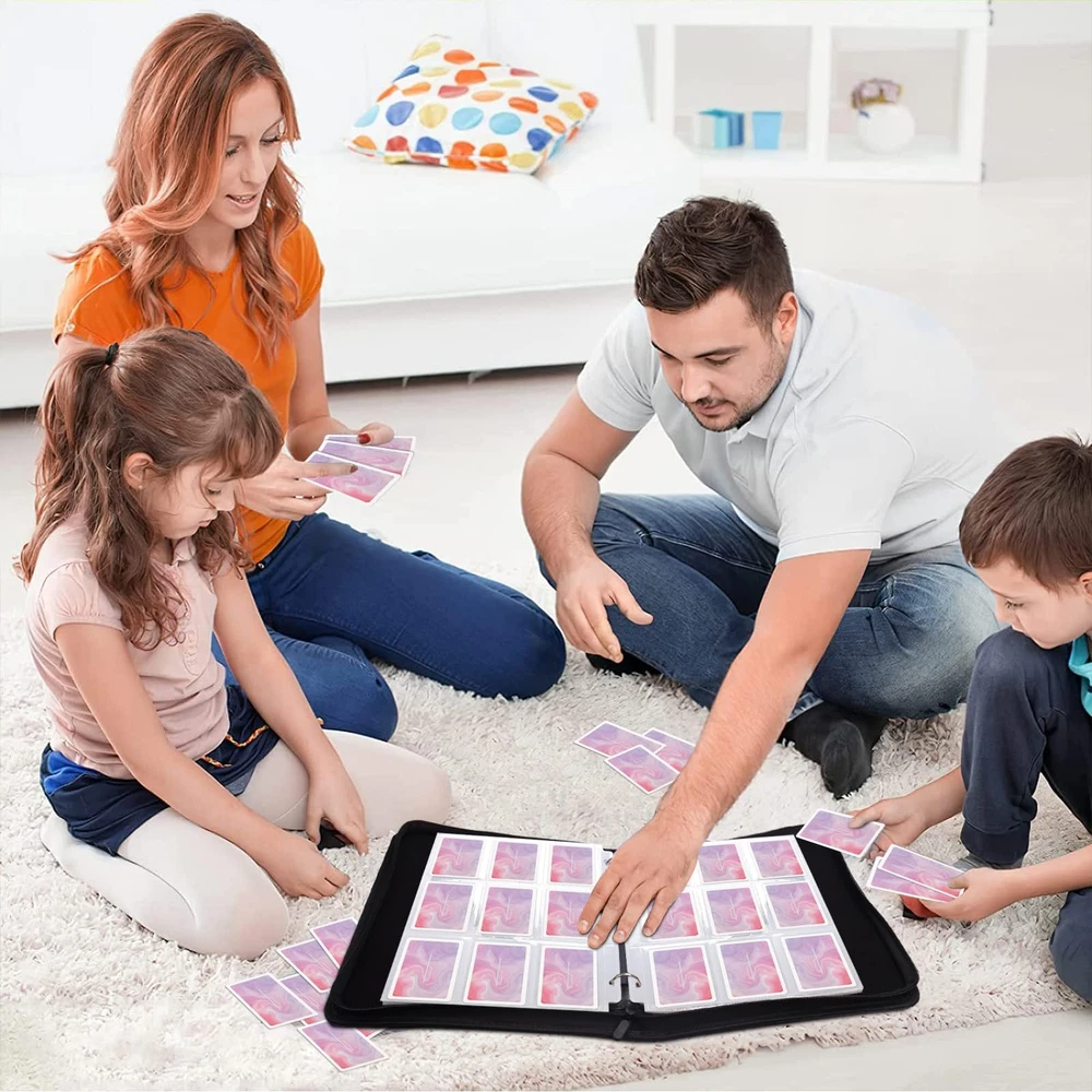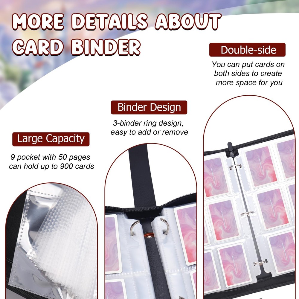 The protective sheets are made of thick waterproof material, dust-proof and moisture-proof, which effectively protects the card from fading and staining. The light transmittance is up to 99%, making the collection content clearer, thicker material, wear-resistant, scratch-resistant, and protect the card better. It adopts a humanized wristband design, which is easy to carry and you can show your collection to friends anytime, anywhere Exquisite Craftsmanship and Waterproof PU Material - The surface of this card binder is made of premium-quality PU leather, which is waterproof, scratch-resistant, easy to clean. The 3-ring buckle is made of high-quality stainless steel, which can be easily opened and is not easy to scratch your hands, and it is convenient to increase or decrease the card sleeve Multi-protection - This baseball card binder adopts a closed zipper design to prevent the card from falling. The protective sheets are made of thick waterproof material, dust-proof and moisture-proof, which effectively protects the card from fading and staining Humanized Wristband Design - Card binder 900 pockets for baseball adopts a humanized wristband design, and you can hang it on your wrist when you go out, easy to carry 900 Pokects Card Binder - The card binder 9 pocket has 50 double-sided protective sheets to hold up to 900 cards. Sports card binder can store and display all the trading cards you have, the cards can be stored in an orderly manner, instead of throwing them everywhere, which cultivates children's storage integration ability and help children develop good storage and organization habits Great for Various Cards - The card holder binder not only can store game cards, business cards, photos, and other standard-size cards but also can as present for Thanksgiving, Christmas, birthdays, and other holidays for children, adding different fun to them