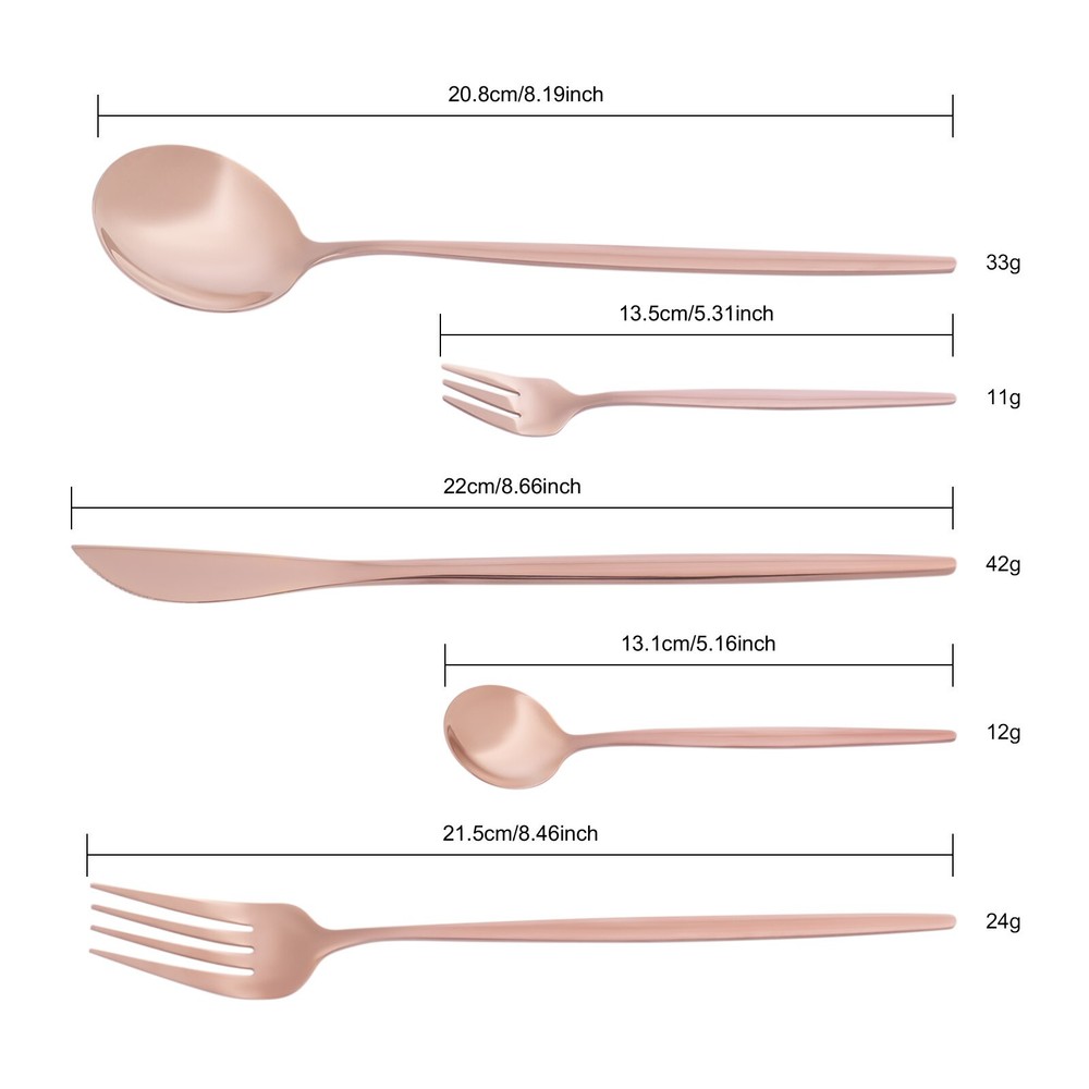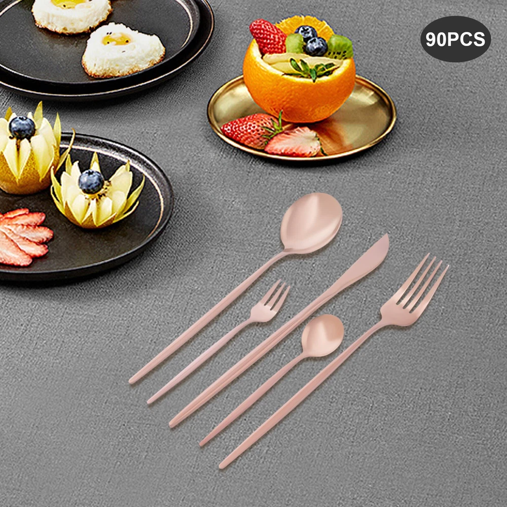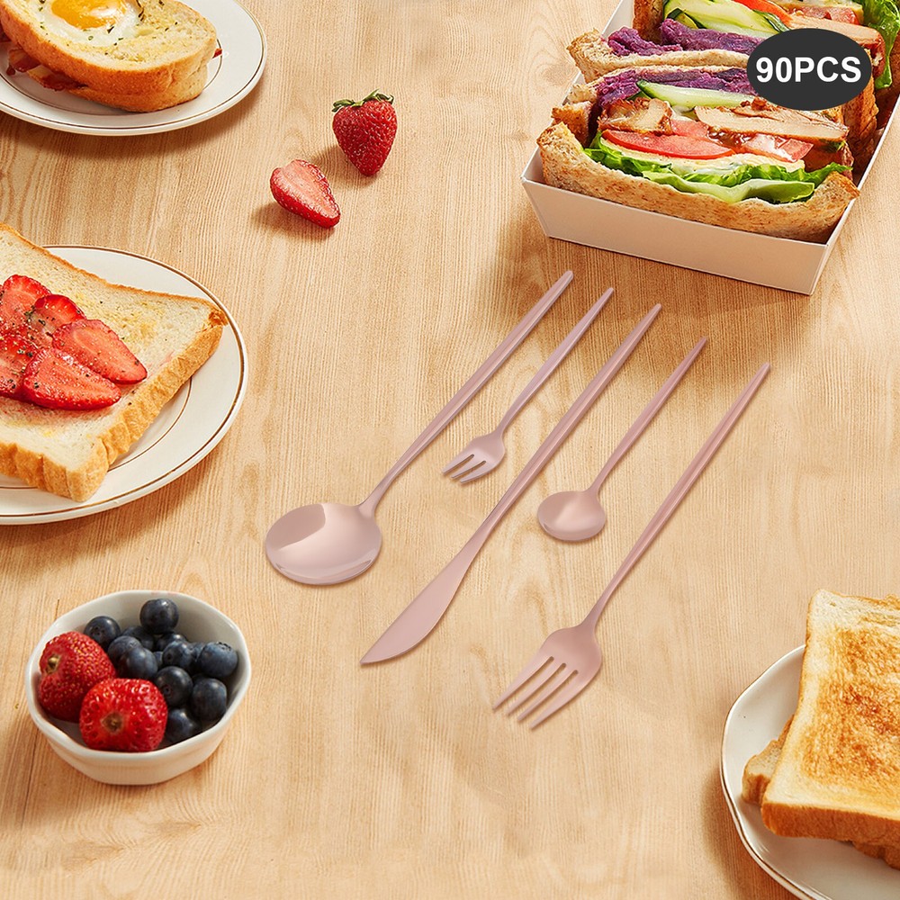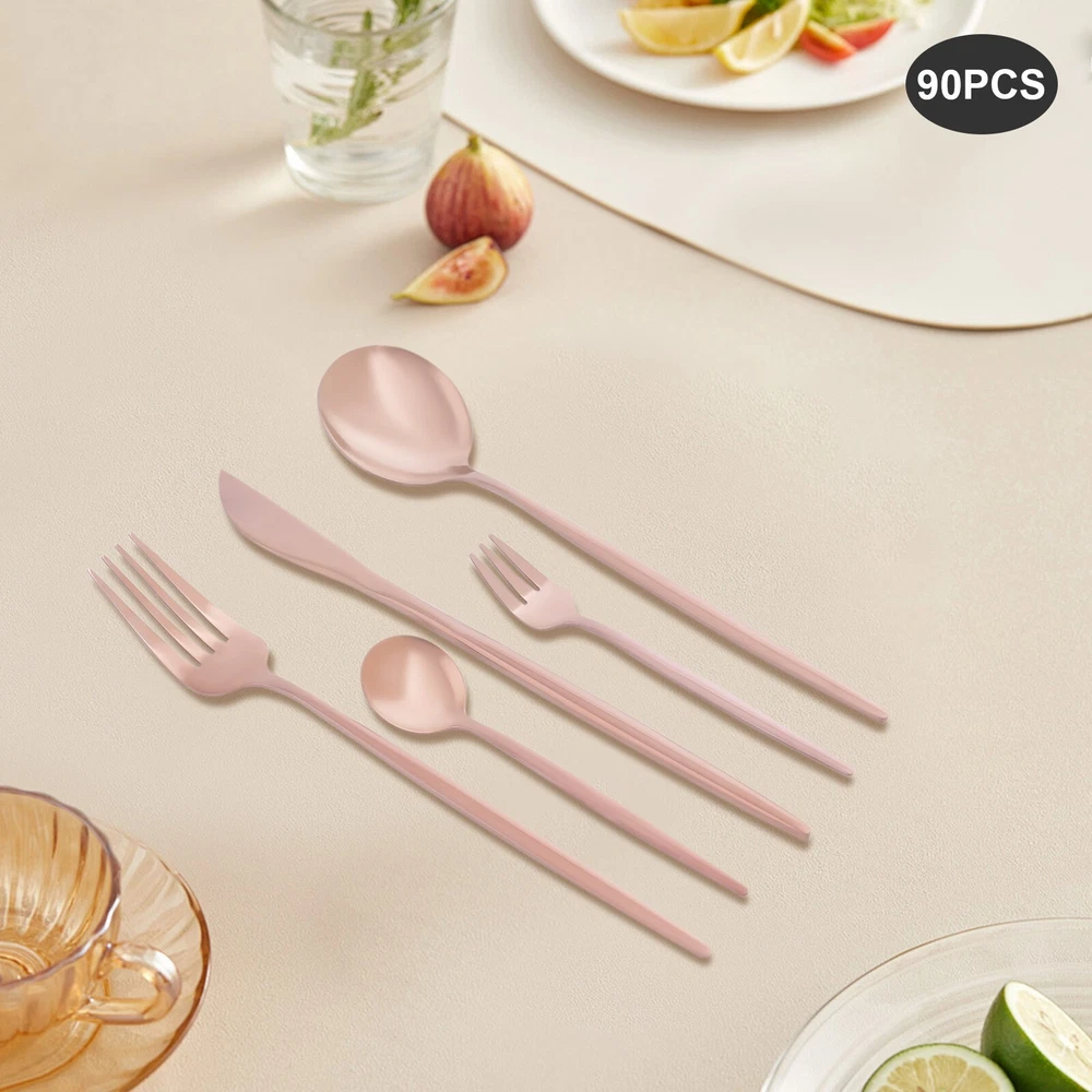 90Pcs Tableware Set for 18 Stainless Steel Flatware set Cutlery Utensil Kitchen Description Description Our cutlery set is not only designed for ultimate aesthetics but also carefully considered in terms of practicality. Each individual piece undergoes stringent quality control to ensure its durability and comfort, making it ideal for both everyday family meals and special occasion banquets. The selected materials not only ensure the safety and hygiene of the tableware but also give them a unique texture and luster, making every use a pleasure. Key Features Sturdy and Durable: It is made of high-class 410 stainless steel with a polishing treatment, which is eco-friendly, odorless, anti-corrosion, and rust-resistant , ensuring its beauty and long-time use. 90 Pieces: This set includes dinner forks, salad forks, dinner spoons, teaspoons, and knives, so you can enjoy your meal with a wide variety of cutlery. Economical and Practical: With it, you can enjoy a variety of food on the table, and the 90-piece package can also be well suited for parties or business meals, very cost-effective. Exquisite Appearance: The rose gold color with a smooth exterior makes it look generous and elegant. It will shine under the dining room lights and become the most exquisite setting on the table. Effortless Clean: Thanks to its smooth surface, simple construction, and machine-washable features, you can clean it with ease. Ready to Go : The one-piece construction allows you to use it directly after receiving it, which is very time-saving and convenient. Ideal Gift: Thanks to its practicality, it will make a fine gift for family, friends, and loved ones on Christmas, Father's Day, Mother's Day, birthdays, anniversaries, and holidays. Customer Service : We aim to provide quality products and services. If you have any problems, please feel free to contact us. We will reply and solve the problem for you as soon as possible. Details Rounded Corners: The rounded edges are burr-free , which is comfortable to touch a nd enhances the safety of use. Comfortable Handle: The curved design of the ergonomic long handle is properly weighted and balanced to ensure a comfortable grip and no fatigue from prolonged use. Sharp Dinner Knives: The table knife has a toothed edge for easy cutting of food, while the compact tip facilitates precise cutting. Rounded Spoon Head: It is widened and deepened to make it easier for you to scoop soups, cakes, creams, etc. Application It is suitable for any family gathering, party, restaurant, hotel, cafeteria, camping or wedding reception, both residential, and commercial. Specification Material: 410 Stainless Steel Color: Rose Gold Style: Modern Process: Polishing Number of Pieces: 90 Is Machine Wash Safe: Yes Dinner Knife Length: 22cm/8.66in Dinner Fork Length: 21.5cm/8.46in Dinner Spoon Length: 20.8cm/8.19in Teaspoon Length: 13.1cm/5.16in Salad Fork Length: 13.5cm/5.31in Single Dinner Knife Weight: 42g/0.0926lbs Single Dinner Fork Weight: 24g/0.053lbs Single Dinner Spoon Weight: 33g/0.0728lbs Single Teaspoon Weight: 12g/0.0265lbs Single Salad Fork Weight: 11g/0.0243lbs Packing Size: 26*15*5cm/10.24*5.9*1.97in Net Weight: 2.19kg/4.83lbs Gross Weight: 2.3kg/5.07lbs Package Included 18* Dinner Knives 18* Dinner Forks 18* Dinner Spoons 18* Teaspoons 18* Salad Forks Notes Please be careful not to scrape and wash with hard objects such as wire balls to avoid scratches on the tableware. Please note that it should not be placed in high temperature, strong acid, strong alkali, or solution soaking. After washing the utensils with water, dry them with a cloth and do not place them in a humid and corrosive environment. Please allow the slight color difference caused by the shooting light and 1-3 cm error due to manual measurement, and make sure you do not mind before ordering. Payment Delivery details Terms of sales About us Contact us Payment We accept ebay payment 。 Fees such as import duties, taxes are not included in the item price or shipping costs. These charges are the buyer's responsibility. Delivery details Shipping: 2-9 working days to: USA Terms of sales We maintain high standards of excellence and strive for hundred percent customer satisfaction. Feedback is very important to us. We hope that you contact us immediately before you give neutral or negative feedback, so that we can address your concerns. It is impossible to address issues if we do not know about them! About us Your satis faction is our ultimate goal. We work hard to earn your trust and future business. Our certified technicians have tested each item before shipping. The unit comes with 1 year limited warranty on all manufacturing defects. a) If you receive a defective item, you may return it or ask for a discount. Please contact us within 14 days after you receive the package. b) What you returned must be intact and in its original packaging as re? u. Customer is responsible for shipping costs of the returned item. c) We will cover the cost of shipping back t with the shipping rate indicated in the registration page. We will send you a new unit or refund the full payment you paid. Thank you. Contact us Business Hour Business Hour: Monday To Friday: 8:30 AM to 5:00 PM (Beijing China time) Due to time zones, our reply to your questions may not be immediately. But within above working time, we will reply your email within 24 hours. If it's non-workdays, please kindly be patient and wait till Monday. Please contact us with ebay message. Please feel free to contact us if you have any questions. Monday To Friday: 8:30 AM to 5:00 PM (Beijing China time) Due to time zones, our reply to your questions may not be immediately. But within above working time, we will reply your email within 24 hours. If it's non-workdays, please kindly be patient and wait till Monday. Please contact us with ebay message. Please feel free to contact us if you have any questions.