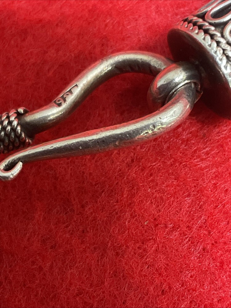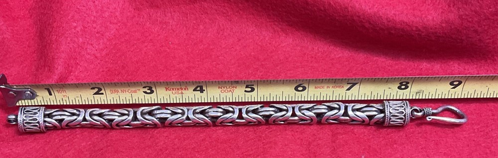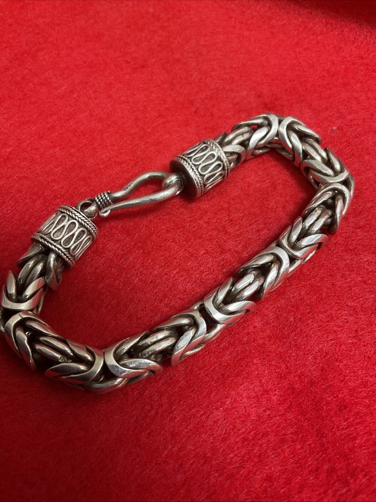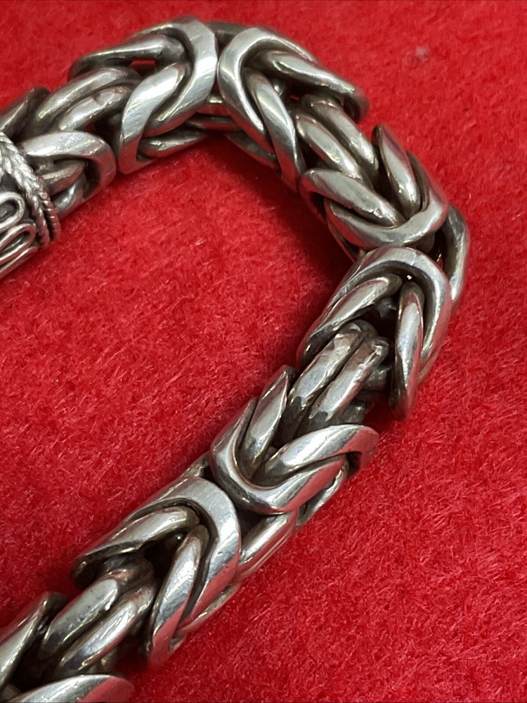 This handmade sterling silver bracelet features an oxidized silver Bali chain design, weighing 90 grams. The closure is a hook, and the metal purity is .925 sterling silver. This vintage piece from Indonesia is a men's bracelet with a Byzantine chain type, making it a unique and stylish accessory for any outfit.