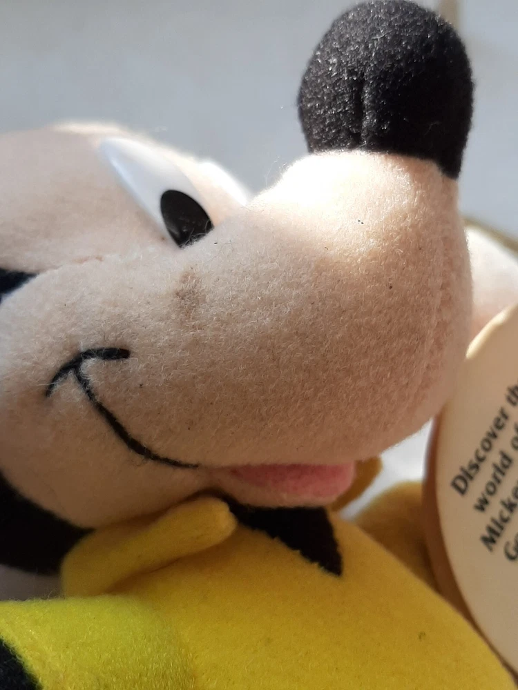 This adorable 90s Mickey plush is a nostalgic gem with vintage charm! While it shows some wear like loose threads and light discoloration, it’s still super soft and full of character. Perfect for collectors or Disney fans who love a well-loved piece with history. The tag adds authenticity—just check the photos for details. A sweet find for any Mickey enthusiast!
