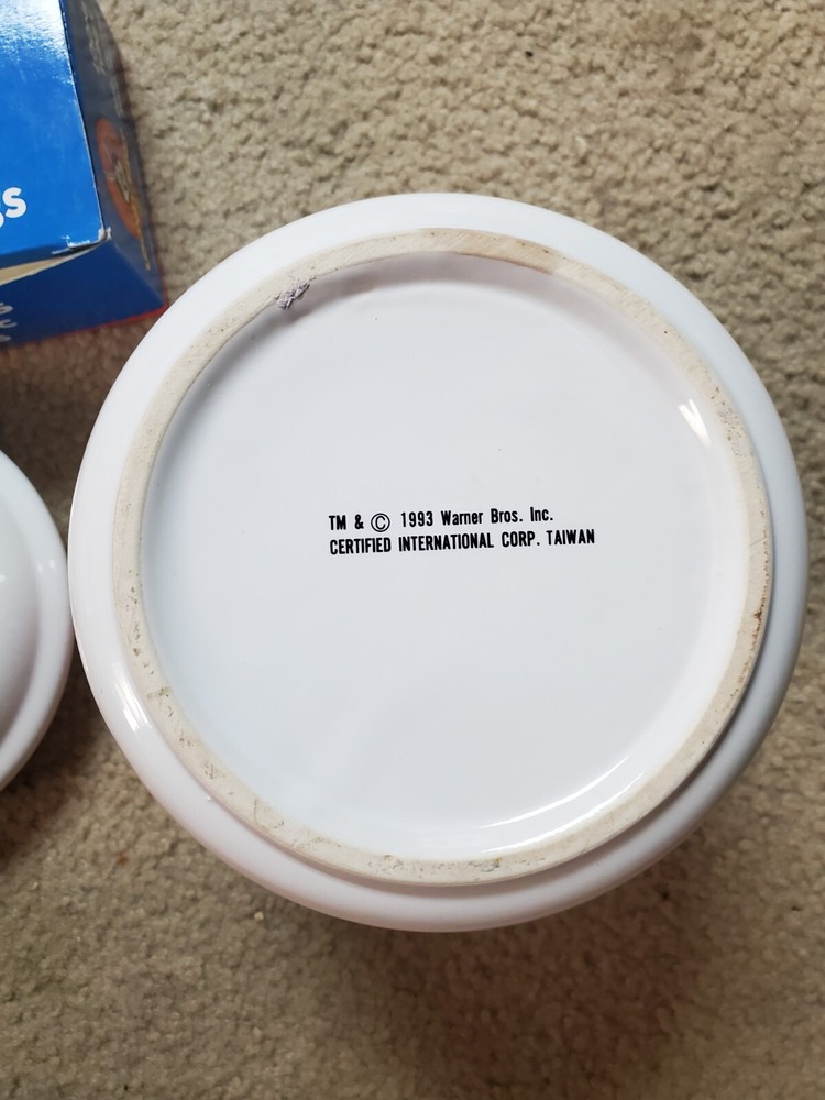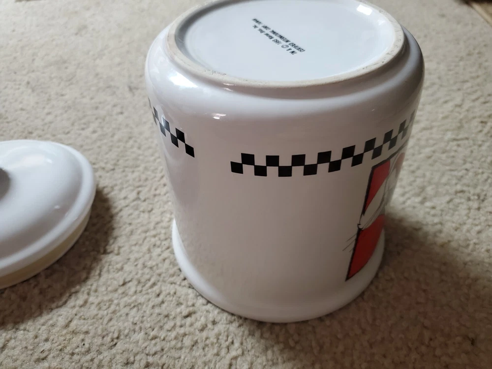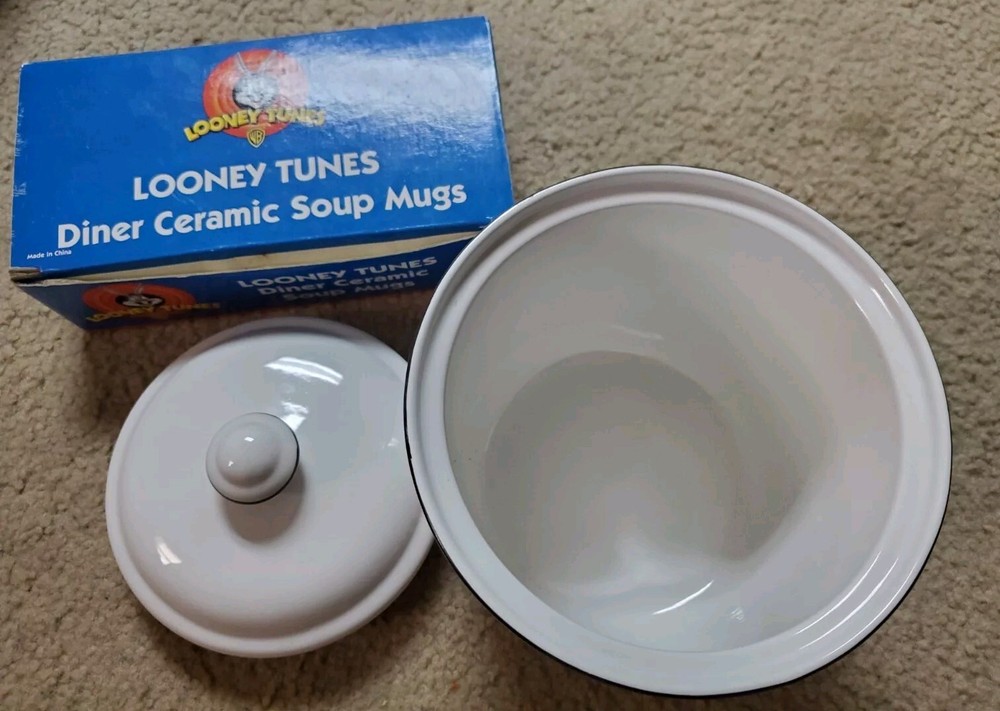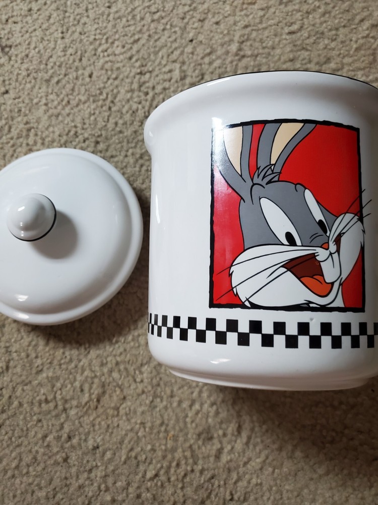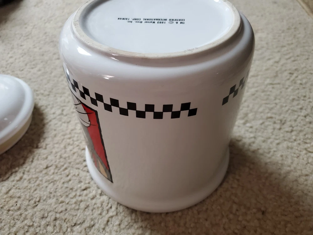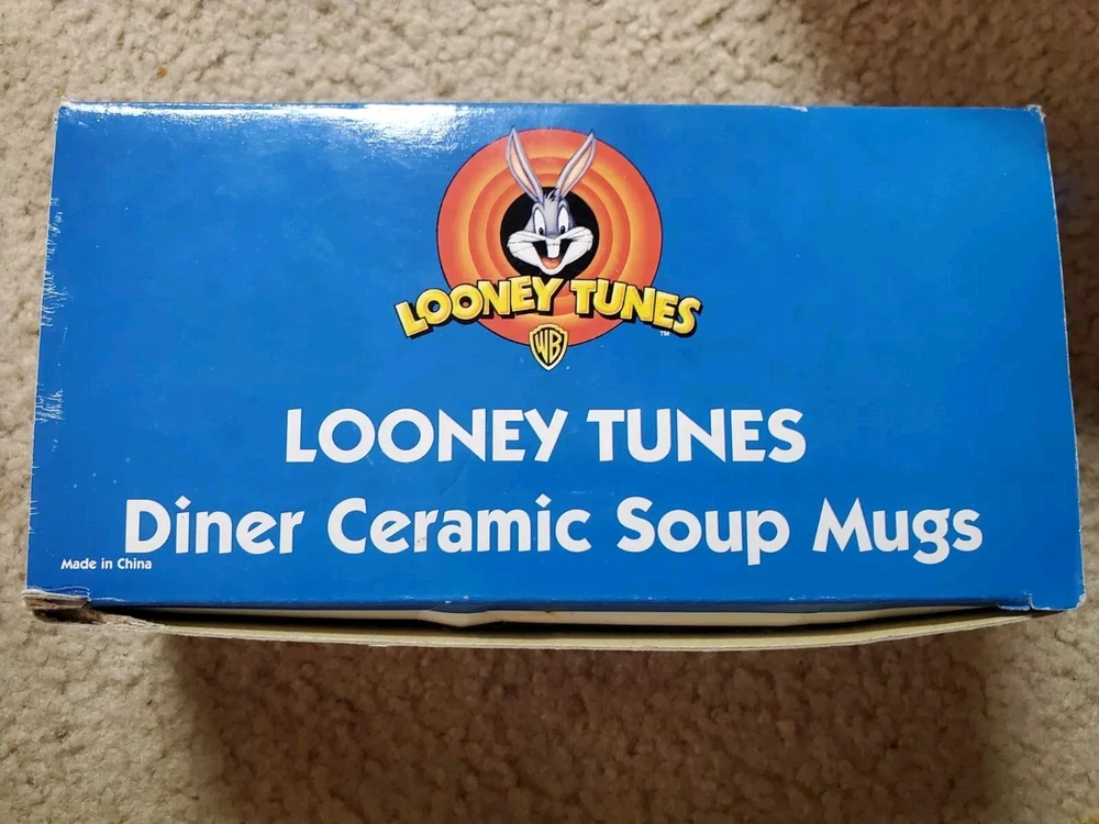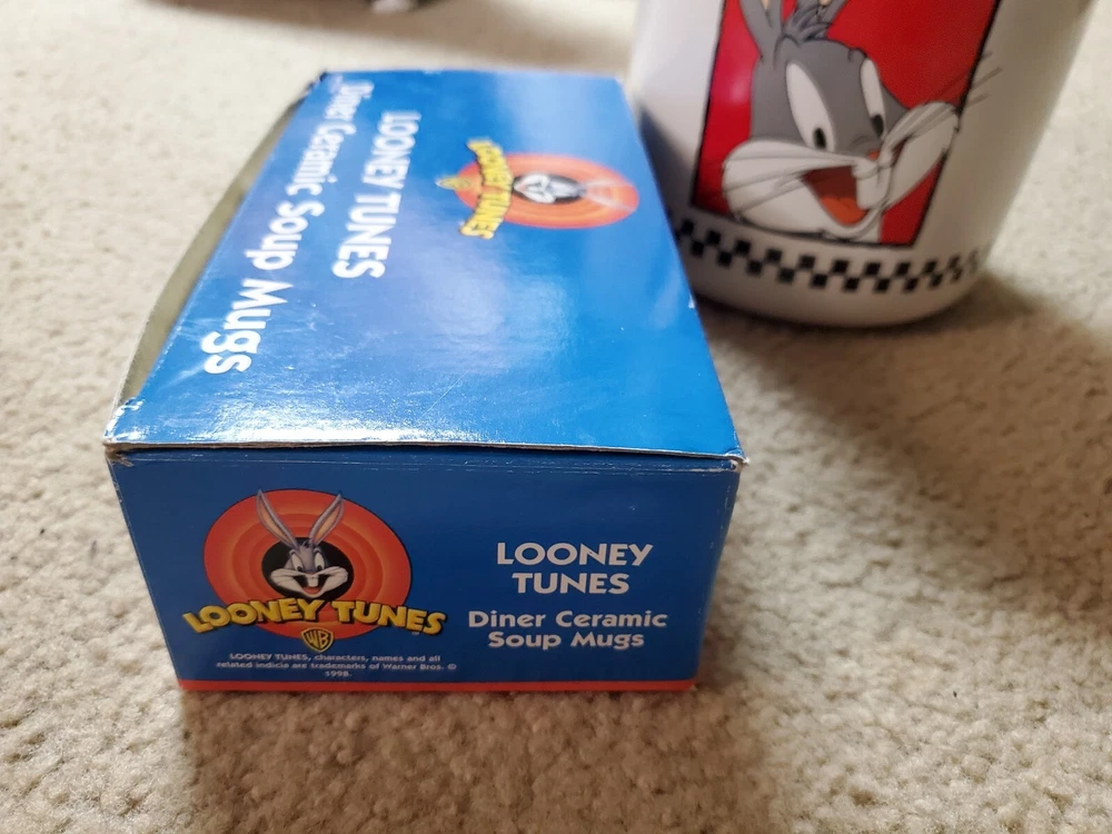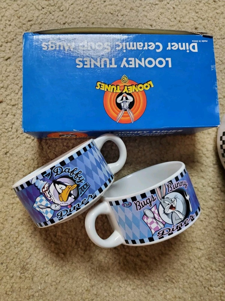 90s Bugs Bunny Vintage Cookie Jar And Looney Tunes Diner Mugs Boxed No chips or cracks. Excellent Condition on cups amd cookie jar. Good size cookie jar as well. Still very vibrant red colors on it. Diner soup mugs never used.
