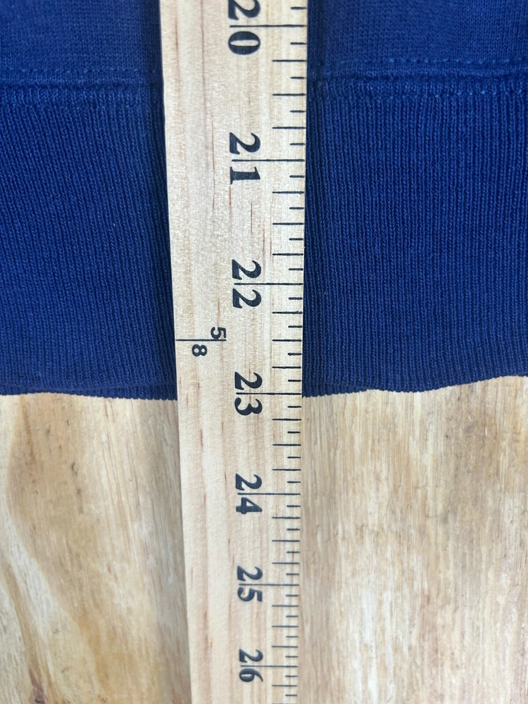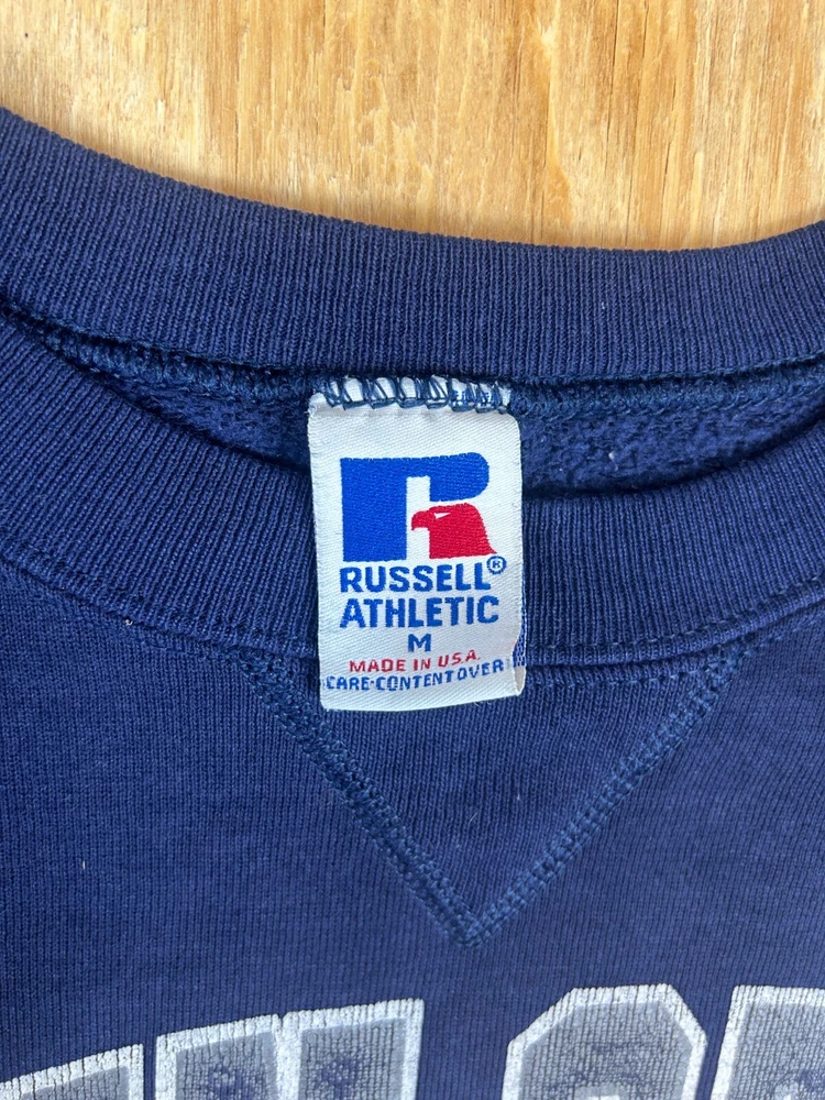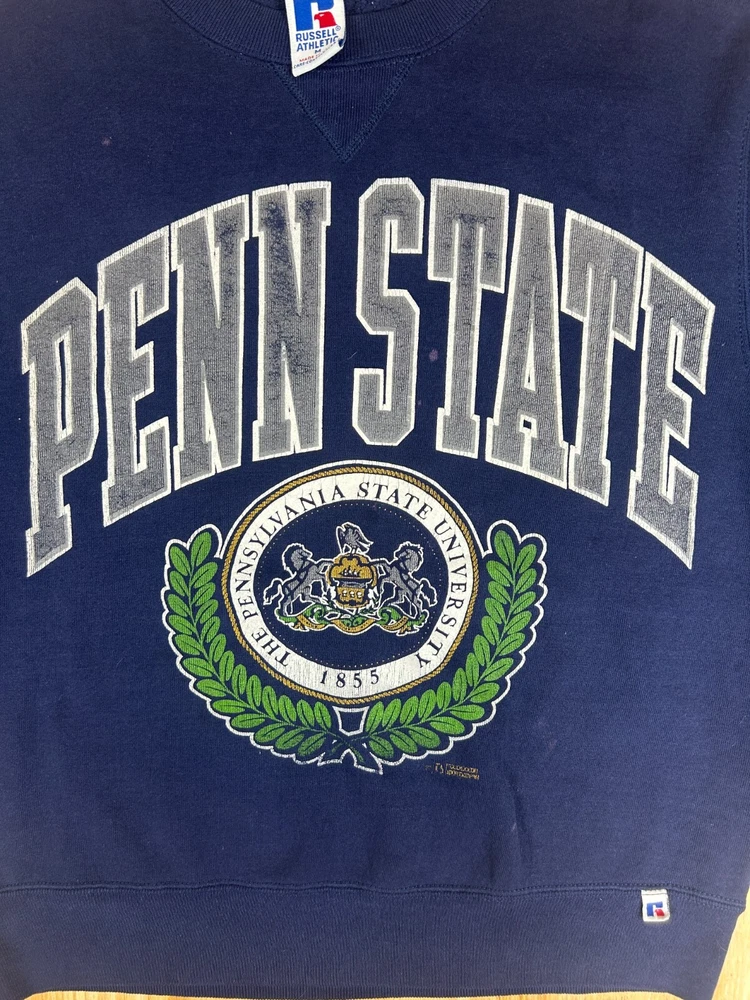This vintage Russell Athletic sweatshirt is a must-have for any Penn State fan. The blue cotton blend material is comfortable and machine washable, making it perfect for any season. The pullover style features a crew neck and long sleeves, with a solid pattern and graphic print of the Penn State logo. This sweatshirt is a size medium and has a regular fit, with no personalization. It's suitable for various activities, including gym training, walking, and football. The sweatshirt is a 90s vintage item, perfect for those who love University and College themes. It's made in the United States and is a great addition to any wardrobe. SKU: 15003