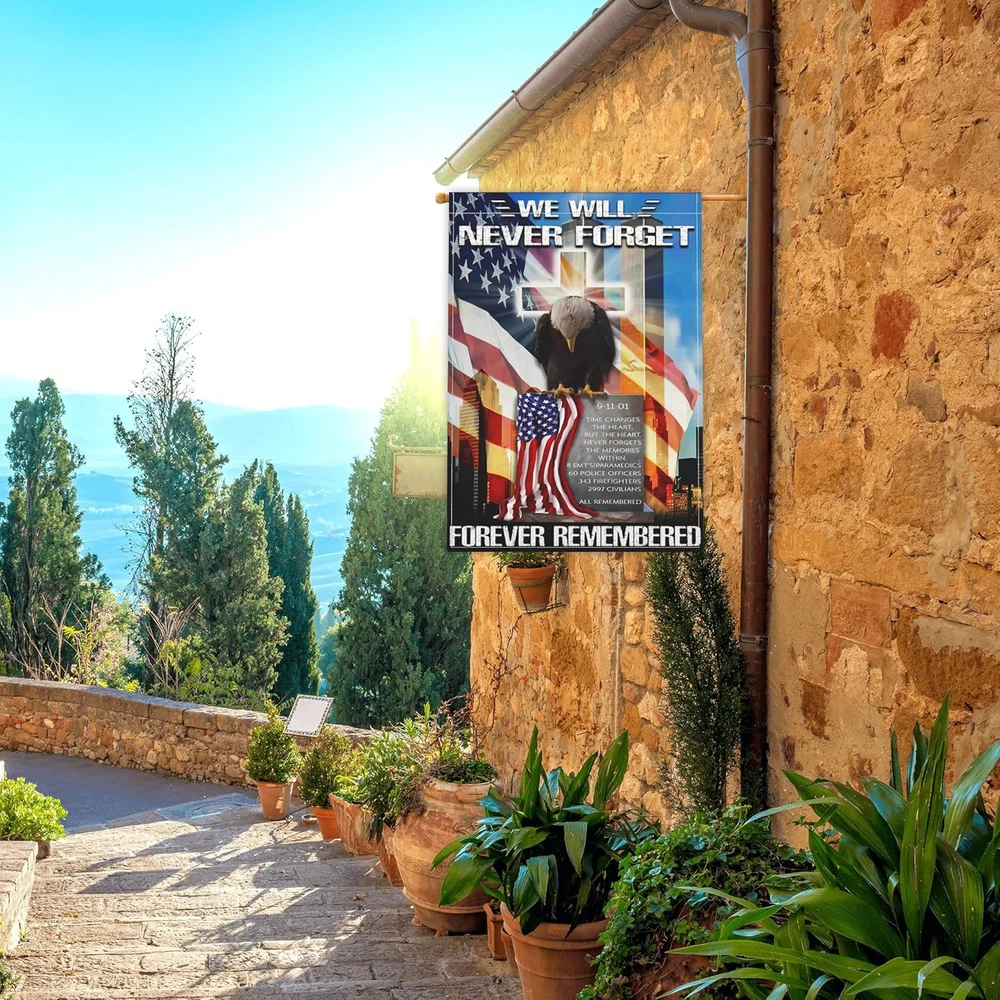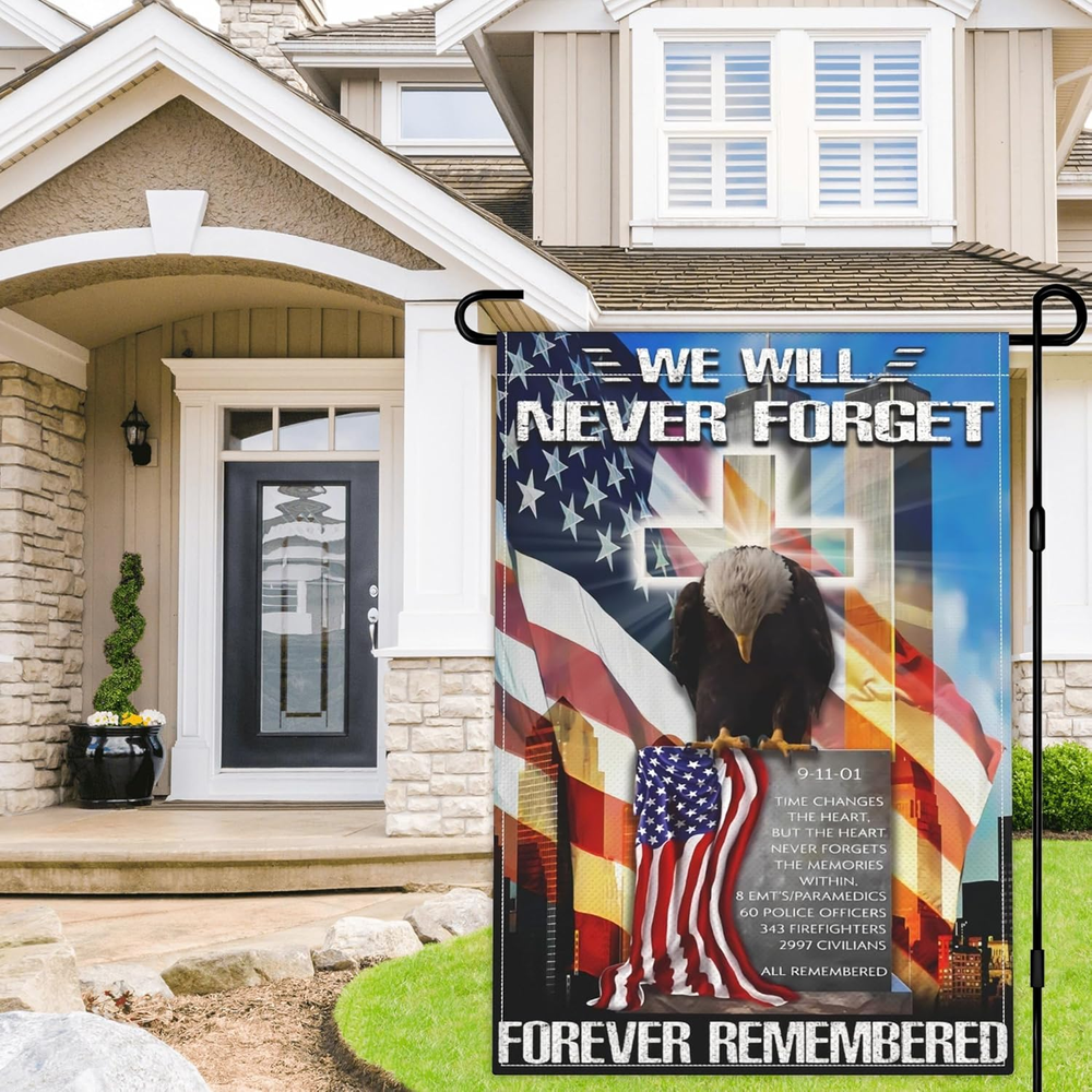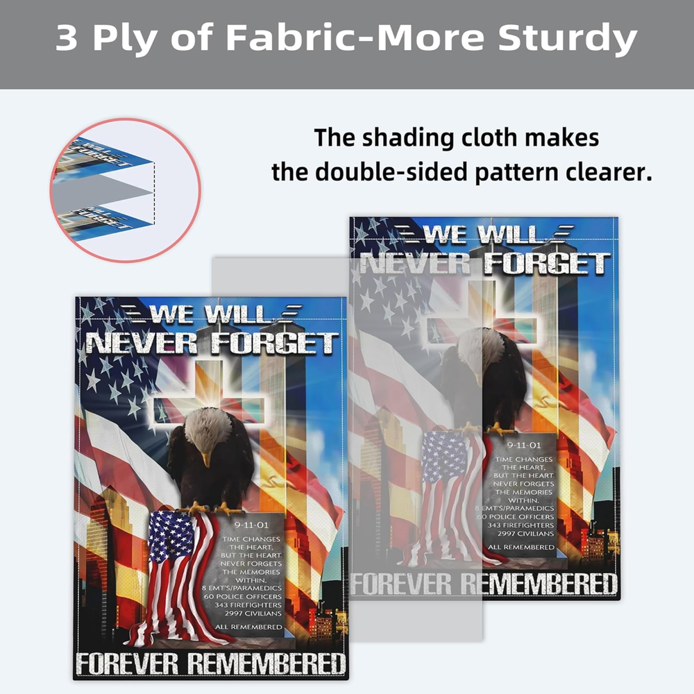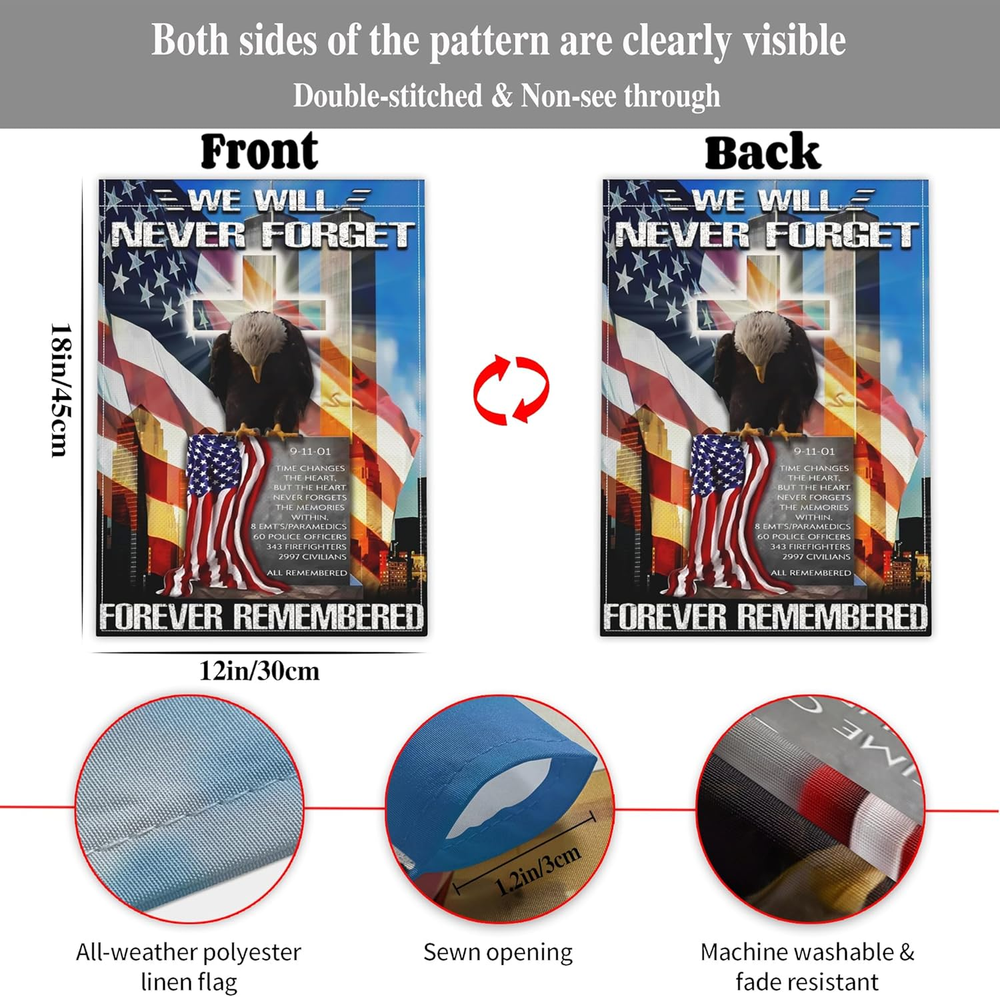 Premium Material: The 9/11 never forget garden flag is made of durable polyester, double-sided printed, 3-layer fabric, fine workmanship, double-stitched for durability. Standard Size: Our we remember 911 flag for outdoor size is 12x18 Inch, easy to install and hang, you can hang the freedom flag on the outdoor pole, or hang it on the wall of the dormitory .(Please note: Excluding the pole) We Will Never Forget Flag Design: 911 American Patriotic flag is double sided design with the image printed and visible from both sides and text also read correctly from both sides. Both front and back side is using silk screen printing technology, high temperature fixation vivid color and clear word, anti-uv fade, Keeps your 9/11 flag banner's vibrant colors long-lasting. Holiday Gift: This brightly colored never forget garden flag with american flag salute to firemen a symbol of patriotic and unity. This would make a great gift to express your best wishes! It will fly proudly to show your patriotism in 4th of july independence day, veterans, patriot day 911 22th anniversary memorial flag, christmas, thanksgiving day, etc. Never Forget 911 Garden Flag Sales Service: We are committed to providing customers with high-quality flags and services, when you buy we remember 911 Garden flags in our store, if you have any comments or suggestions, please feel free to , we will solve it for you within 24 hours. 911 Garden Flag for Patriotic If you are looking for flags for parades, festivals or parties, especially during holidays like 911 22th anniversary memorial flag, 4th of July or Memorial Day or any other day you want to celebrate America. 911 Never Forget Flag 12x18 is the choice of many people, the unique design and bright colors will attract attention, ideal way to fully display your patriotism!