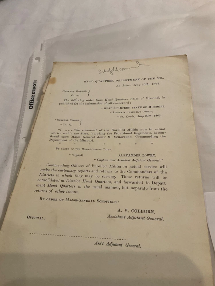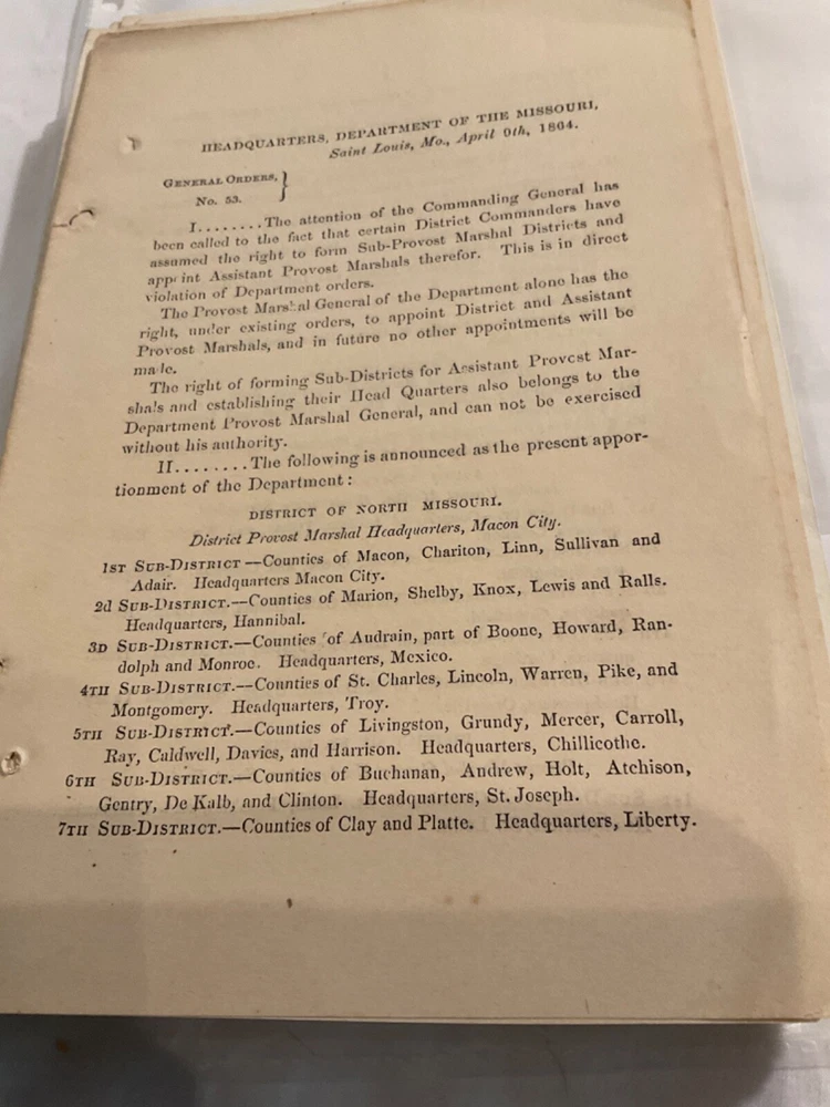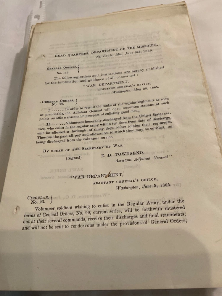 Please do not ask me to change any part of the auction, this includes shipping. Also, once an item is brought I will no alter any information on any form. Happy to combine shipping. Buyer pays postage to send item back. All items will have a confirmation number. I have had complaints before about not having a tracking number. WE SHIP WORLDWIDE. Feedback will not be sent until I receive feedback. Please feel free to read my feedback. I'm very proud of my feedback. I sell military collectables. If you choose to wear or actually use items, it is at you own risk. Contact me to make prior arrangements on payment, I am happy to work with you. I DO COMBINE POSTAGE FOR MULTIPLE ORDERS. General & Special Orders were issued to communicate commands and information to the Army. Each order, issued in writing by a command, was then printed for distribution to each unit, either at an army department headquarter or by commanders at local headquarters, sometimes in the field on portable printing presses. The orders were then issued to regiments, often to be read aloud to the troops. General Orders were printed as issued with date & location; at the end of a year the regimental adjutant might retain them loose or simply string bind them by punching holes or cut slits in the left margin and stringing on ¼? red cloth string tape (the source of the old expression "government red tape"). Sometimes an officer or HQ clerk might take a group of orders to a local print shop or bookbinder and have an accumulation bound with leather or cloth covers. Usually, American Military Orders of the 19 th century including Civil War era were printed on an 8 x 5? sheet of quality rag paper. General & Special Orders were issued to communicate commands and information to the Army. Each order, issued in writing by a command, was then printed for distribution to each unit, either at an army department headquarter or by commanders at local headquarters, sometimes in the field on portable printing presses. The orders were then issued to regiments, often to be read aloud to the troops. General Orders were printed as issued with date & location; at the end of a year the regimental adjutant might retain them loose or simply string bind them by punching holes or cut slits in the left margin and stringing on ¼? red cloth string tape (the source of the old expression "government red tape"). Sometimes an officer or HQ clerk might take a group of orders to a local print shop or bookbinder and have an accumulation bound with leather or cloth covers. Usually, American Military Orders of the 19 th century including Civil War era were printed on an 8 x 5? sheet of quality rag paper.