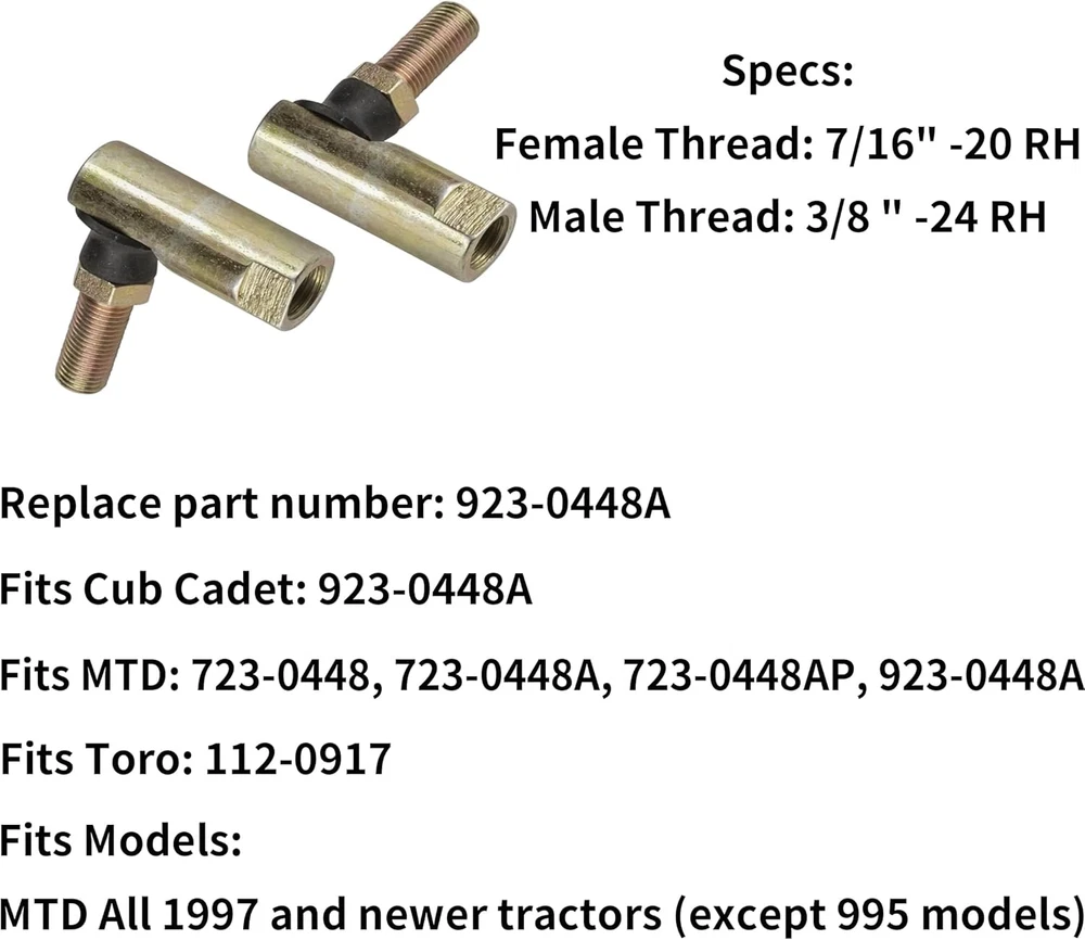 Store New Arrivals Add to Favorite View Feedback Contact 923-0448A 923-0448 723-0448A 723-0448 Ball Joint Tie Rod Ends for MTD Cub Troy Bilt Huskee,Toro 112-0917 Description Item Weight 4.2 ounces Country of Origin China Package Dimensions 3.11 x 3.11 x 0.71 inches Ball Joint for MTD Cub Cadet Toro Troy Bilt Huskee. Replace part # 723-0448 723-0448A 923-0448 923-0448A Female Thread: 7/16" -20 RH, Male Thread: 3/8" -24 RH. Compatible with Toro 112-0917 Fits all MTD lawn and garden tractors from 1997 to present(except 995 models). Product Description Specifications: Female thread: 7/16" -20 RH Male thread: 3/8" -24 RH Fits Models: MURRAY: 13BC76LF058, 13BC761F058, 21R807-0023-G1 TROY BILT: KT735-3012, SV530-3222, SV601-3212, 13AM77KS011, 13WM77KS011, 13WQ93KP011, 13WV78KS011, 13YX79KT011, 31R707-0001-G1 YARDMAN: SV600-3225, 13AX935T001, 13A2785S001, 4P90JUB HUSKEE: 4P90JUB ABOUT US We offer the best prices around on high quality products. Our E-store includes media such as books, movies, music and games while offering electronics, toys, sporting apparel, clothing, tools, general home, garden items and more. SHIPPING We are always working hard to ensure your package arrives as soon as possible. Please understand that some factors like weather, high postal traffic, and the performance of shipping companies are outside of our control. We offer free shipping to the lower 48 states and ship within 2 business days of payment, usually sooner. We do not accept P.O. Boxes. Please provide a physical address. For shipping outside of the continental USA, we only use eBay's Global Shipping Program.The item is shipped to KY and then sent to the rest of the world. International customers are responsible for all duties and taxes. Continue to check out in order to calculate costs for shipping the item to your country. Messages regarding eBay's Global Shipping Program MUST be directed at eBay EXCLUSIVELY. RETURNS We offer a 30-Day Return Policy on items which you are not completely satisfied with. You have the option for a full-refund or an exchange of the item. No returns are available on items shipped outside of the USA. PAYMENT We accept PayPal. CONTACT US This page content is yet to come Please ad us to your favorite seller and visit again later Thank You CUSTOMER SATISFACTION We try our very best to make sure every customer is completely satisfied. If there's a problem, message us! We're happy to help. WE ACCEPT Copyright © 2021 AutoDS. | All Rights Reserved