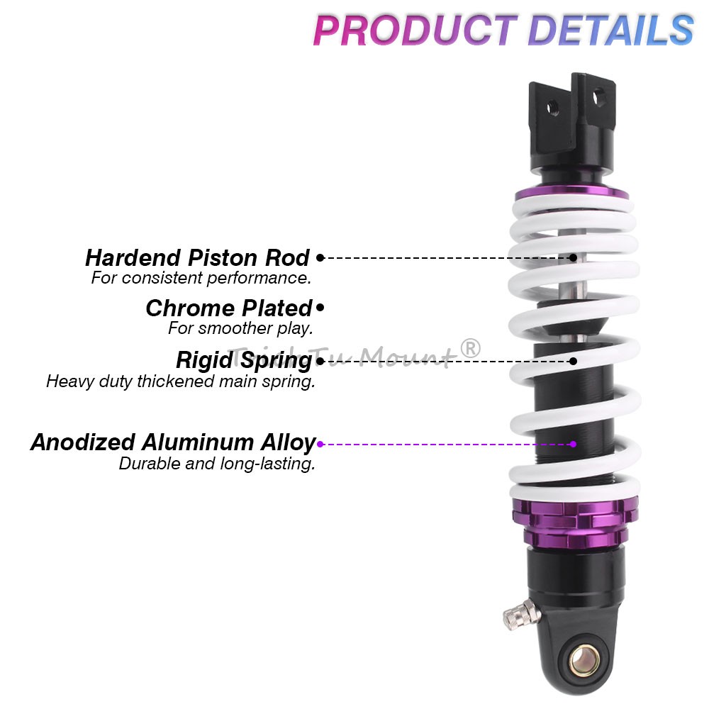 You may also like Chrome Adjustable Handlebar Risers Adapter For Honda Goldwing 1800 GL1800 01-17 19.95 USD 21.0 USD Free shipping 5% off Black Handlebar Adjustable Clamp Risers Adapter For Honda Goldwing GL1800 01-15 22.8 USD 24.0 USD Free shipping 5% off Universal 17"x16" Smoke Windshield For Harley Honda 7/8" 1" Handlebar Motorcycle 59.13 USD 62.24 USD Free shipping 5% off Motorcycle Rider Backrest Organizer Bag for Harley 09+ Honda GL1800 Spyder RT 22.5 USD 23.68 USD Free shipping 5% off For Honda XL100 XL125 XL185 TL125 Rear Air Shock Absorber Suspension 2PCS 400mm 74.98 USD 78.93 USD Free shipping 5% off For Honda VTX 1300 1800 GL1800 For Yamaha XVS650 XV1900 Chrome Front Fender Trim 15.57 USD 16.39 USD Free shipping 5% off Universal 17"x16" Clear Windshield For Harley Honda 7/8" 1" Handlebar Motorcycle 59.89 USD 63.04 USD Free shipping 5% off For Honda Goldwing GL1800 2001-11 Chrome Turn Signal Light Decoration Trim Cover 17.25 USD 18.16 USD Free shipping 5% off Chrome Front Fender Decoration Fairing Tip Accent Trim For Honda Goldwing GL1800 14.33 USD 15.08 USD Free shipping 5% off Adjustable Rear Shock Absorbers Suspension 14" 330mm Universal For Honda Suzuki 128.99 USD 135.78 USD Free shipping 5% off Universal Motorcycle Headlight Fairing Windshield Windscreen 5-7'' Fit For Honda 21.98 USD 23.14 USD Free shipping 5% off 3 Holes Windshield Windscreen Clear For Honda Gold Wing Audio / Comfort GL1800HP 139.98 USD 147.35 USD Free shipping 5% off Product Description Description: Material: high quality Solid Steel+Aluminium Alloy Color: Black + purple + White Total Length: 265mm (10.43 inch) Length of Eye to Eye Core: 235mm(9.25 inch) Eye Diameter Top: available 10mm, 12mm Eye Diameter Bottom: M8 threaded hole and 8.5mm hole Eye Width : 21mm Clevis-Width: 21mm Spring thickness: 7mm Spring Width: 58mm Nitrogen Pre-filled Working stroke: 40mm Max loading: 150kgs(330LBS)/1pcs Feature: High-performance air shock absorber: The suspension provides smoother driving and better overall damping management, provides excellent rearg performance even when fully loaded with luggage,improving driving comfort, motorcycle handling and driving safety. Adjustable spring preload. wrench tool is included for easy adjustment. Highpressure nitrogen shock absorbers are safer, more comfortable and have stable performance. The difference between nitrogen shock absorbers and ordinary shock absorbers is that nitrogen shock absorbers are more stable in driving because nitrogen is more thermally stable than air. The heat-dissipating aluminum tube reduces heat avalanche (cavitation) from the sliding motion of the damping force, resulting in continuous and stable performance. Fitment: Universal fit for the MODELS that length of eye center to eye center 235mm,Eye Diameter 10mm,12mm,and Bottom is U-style,Eye Width 21mm Such as compatible with HONDA YAMAHA ,JOG 3KJ dio50 60 90 100: Fit For HONDA DIO Fit For HONDA DIO CESTA Fit For HONDA Byte Fit For HONDA SMART DIO Fit For HONDA SMART DIODX Fit For HONDA SMART DIOZ Fit For HONDA TACT Fit For HONDA TACTS Fit For HONDA DJ1-RR Fit For HONDA ZOOMER Fit For HONDA TODAY Fit For HONDA DIO Fit For YAMAHA CHAMP Fit For YAMAHA JOG-Z Fit For YAMAHA JOG Fit For YAMAHA JOG Sports Fit For YAMAHA Vino Fit For YAMAHA VOX Fit For YAMAHA AXIS50 Fit For YAMAHA SUPER JOG ZR Fit For YAMAHA APRIO Type 2 Fit For YAMAHA APRIO Fit For YAMAHA APRIOEX Fit For YAMAHA JOG Z II Fit For YAMAHA JOG [3YJ] Fit For YAMAHA SUPER JOG Z Fit For YAMAHA JOG-Z EX Fit For YAMAHA AXIS90 Fit For YAMAHA JOG90 Fit For YAMAHA JOG C Fit For YAMAHA JOG-Z II Fit For YAMAHA BJ Fit For YAMAHA GRAND AXIS Fit For SUZUKI LETS Fit For SUZUKI VERDE please make sure it suits your model before purchase Package Included:A set of shock absorbers About Us Stagparts888 is a professional Motorcycle parts retailer committed to becoming the most loved and trusted seller on eBay. We focus on eBay Motor with various products in motorcycle parts. We are pursuing the goals by offering a best shopping experience and excellent customer service. We've dedicated ourselves to making sure that everyone enjoys shopping from us, and are so proud of working passionately to exceed your expectations when you shop with us. Wholesale purchase & large amount, you can leave me message to get the best price. We have our own factory, offer the modification, customized product service and factory price to you. if you have any problems or questions, please feel free to contact us. It's our great pleasure to serve you. Payment We only accept PayPal payments, and we only ship to the PayPal address. Please make sure your detail address and full name in PayPal is absolutely correct. If you participate in the auction, please complete the payment within 7 days after the auction ends. If you don't have a PayPal account, we recommend registering for one or asking a friend to assist with the payment. Shipping We will ship your order within 1-3 business day after receiving your verified payment (Excluding Weekends and Public Holidays).To ensure orders can be delivered to you without any problem, your complete and correct physical shipping address should be provided when you place an order. We ship to USA Lower 48 States Only. The estimated delivery time is within 3-7 working days (not including the weekend).We do not ship to FPO, APO or PO Box , Alaska, Hawaii, Puerto Rico addresses. International Buyers – Please Note: Import duties, taxes, and charges are not included in the item price or shipping cost. These charges are the buyer's responsibility. Please check with your country's customs office to determine what these additional costs will be prior to bidding or buying. Since this is an international shipment, the shipping time will depend on the logistics company and local customers or tariffs. Thank you for your understanding. International Shipping Time: USA, UK, Canada and Australia need around 8-15 business days(Excluding weekend and Holidays).Other countri