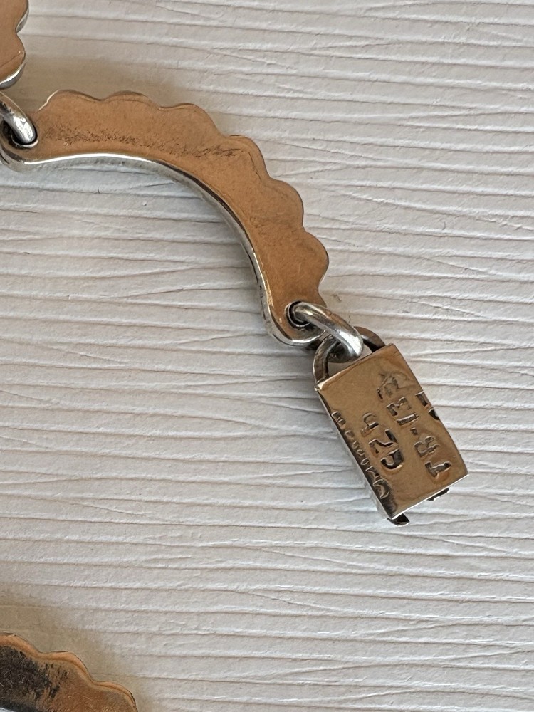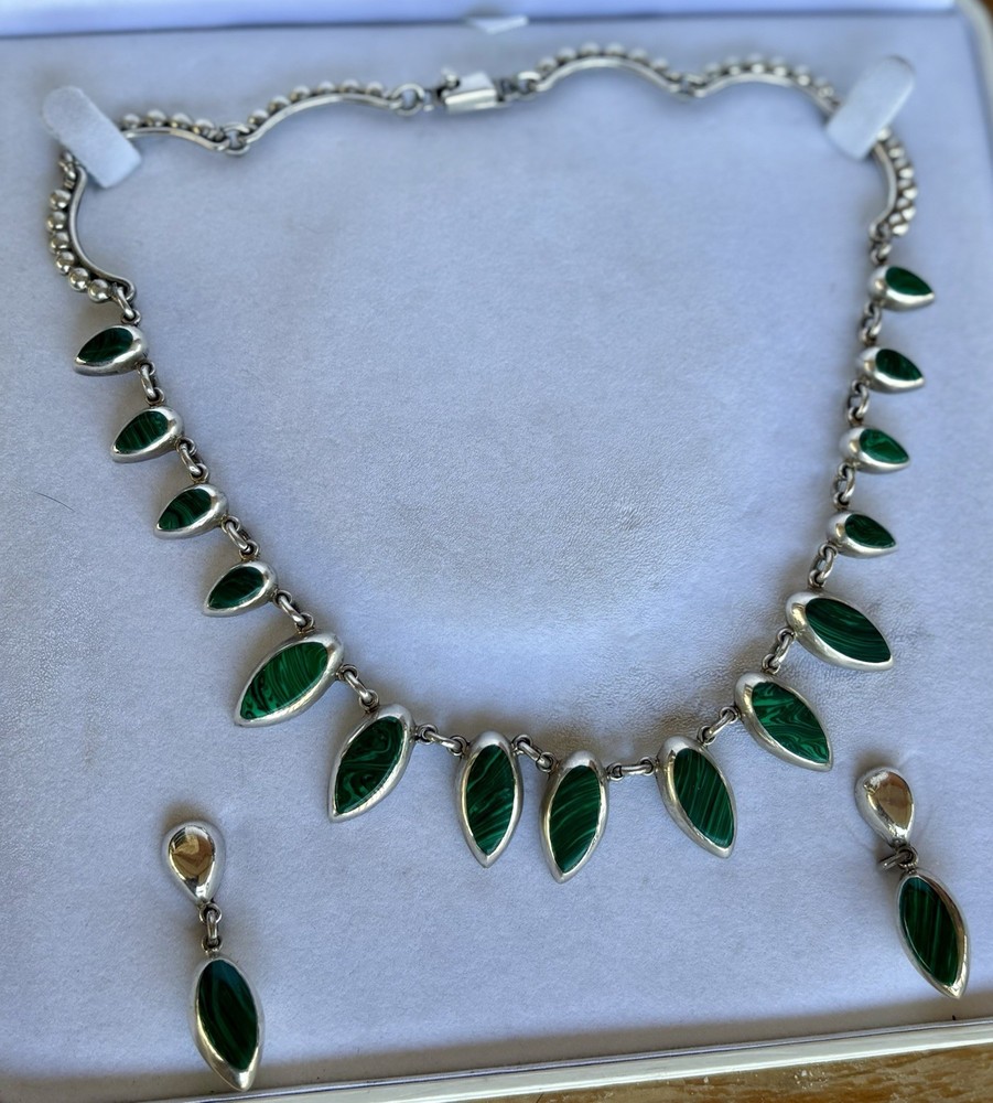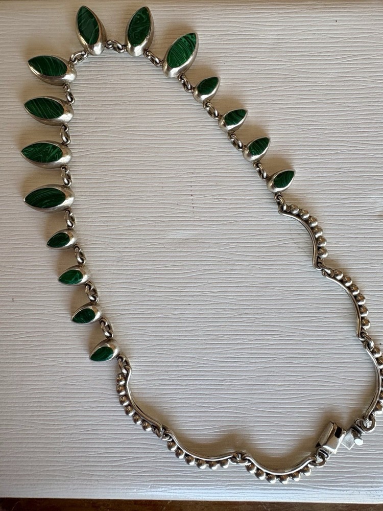 925 Mexican Sterling Silver necklace With matching earrings malachite gemstones.The necklace is an articulated collar design with individual, marquise-shaped. Beaded Like Beads accents and a secure clasp closure.