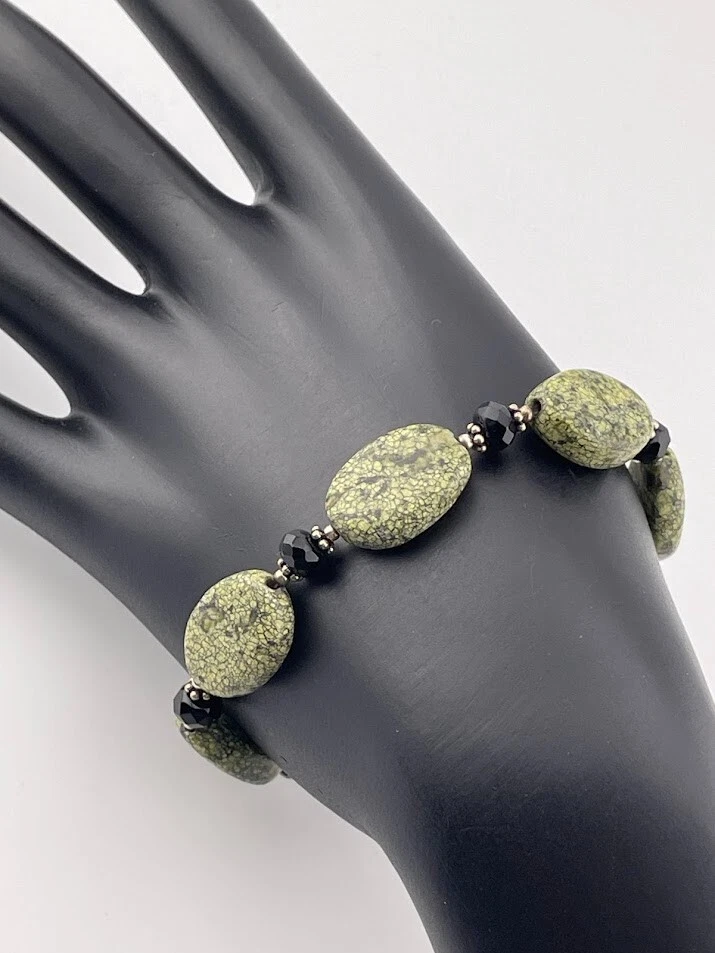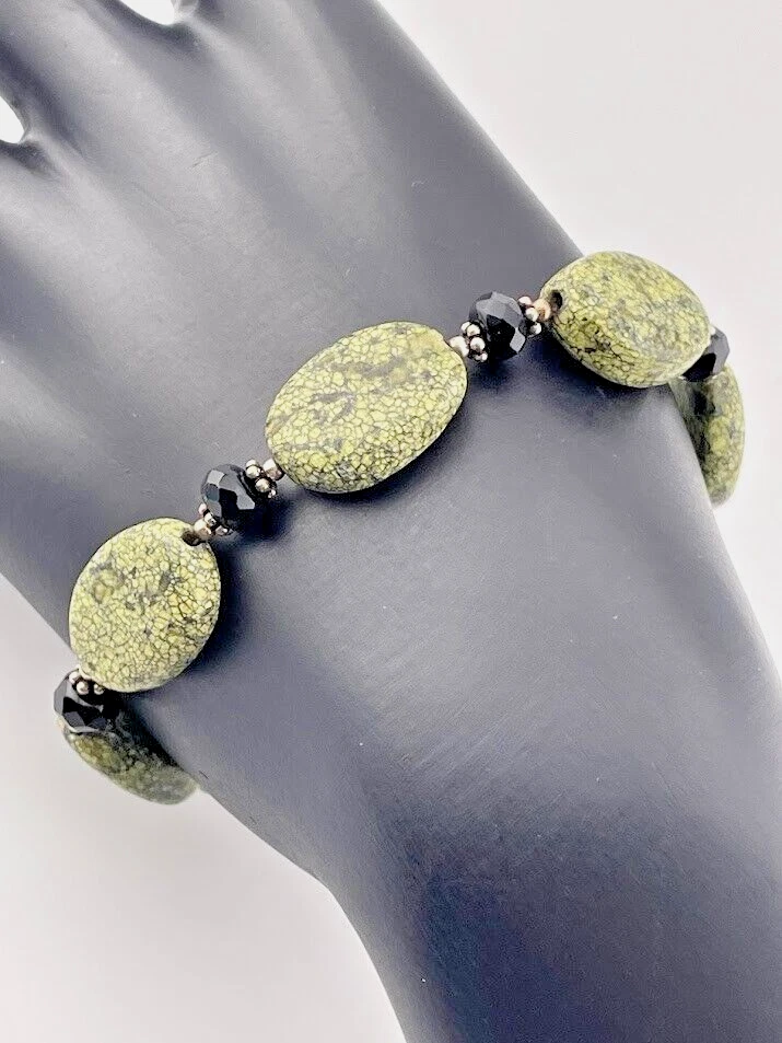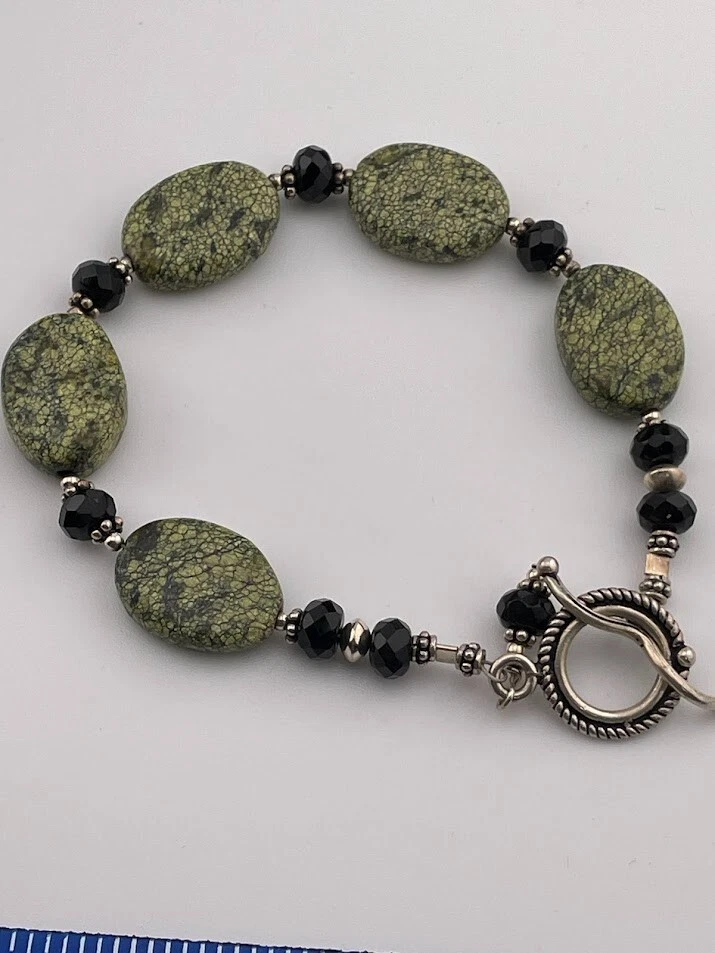 925 STERLING SILVER GREEN SERPENTINE ONYX BRACELET 7.5" BALI STYLE SOUTHWEST 544 UNMARKED BUT TESTED ****************************** Thank you for your interest in our jewelry. We?d like to introduce ourselves. We are just a retired couple who love matching our customers with great jewelry. We?re not professional jewelers. To have the best shopping experience we like to recommend the following: Please measure your hand, wrist, finger or neck to ensure the best fit. We can use your measurements to help with sizing. Please ask all the questions you want. We know some stuff and, if we don?t, we?ll do the research. We like to learn too. More Stuff: If an item is described as ?gold over 925 sterling silver? this means it is gold vermeil. Vermeil is the process by which a layer of gold (usually 14k or 18k) is bonded to sterling silver. We only clean with gentle soap and warm water to avoid damage. The items we sell may be new or pre-owned and may have normal wear, slight damage, and/or tarnish. We make every effort to ensure the items we sell are as described. This includes testing to confirm metal purity if the item isn?t marked, and testing for gemstone identity. We try to put measurements in the jewelry description and include a photo of each piece with a U.S. quarter (25mm).
