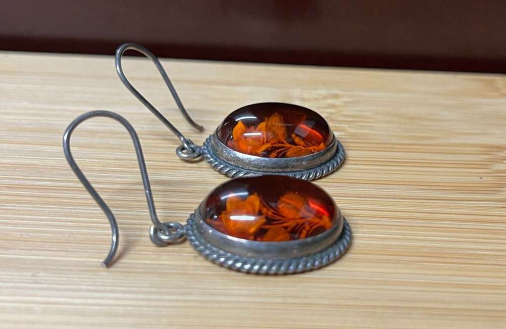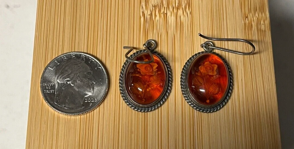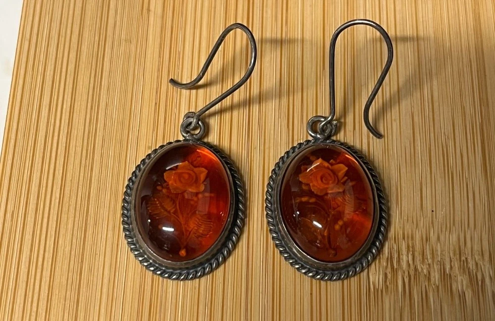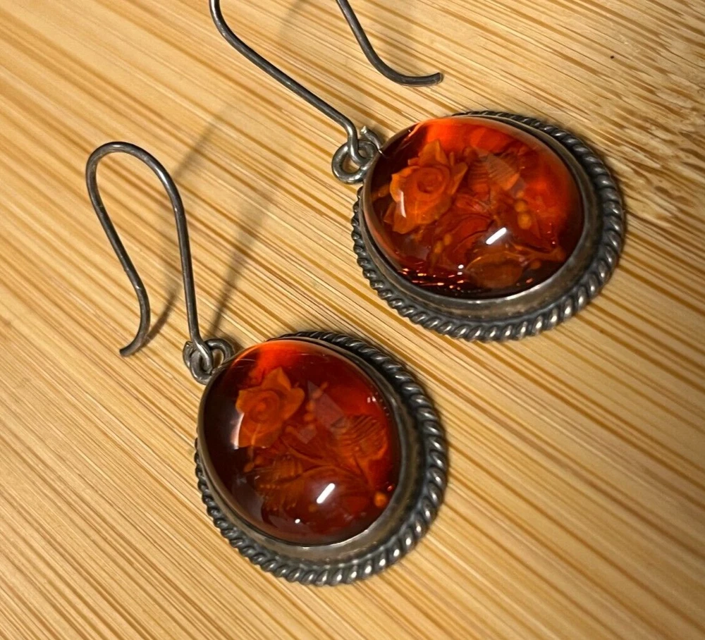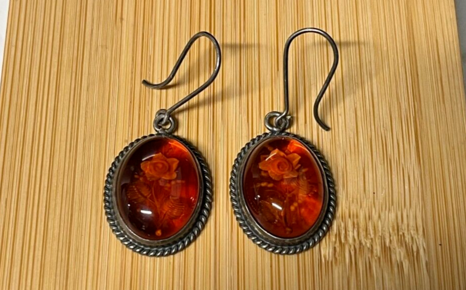 Vtg 925 Sterling Silver Intaglio Carved Rose Oval Baltic Amber Dangle Drop Earrings Weight: 10 grams Length: 1.75 inches Vintage 925 Sterling Silver Intaglio Carved Rose Oval Baltic Amber Dangle Drop Earrings are in lovely pre-owned condition. Stamped 925- can be seen in photos. Please see photos, as they are part of the description. Please reach out with any questions, I will get back to you at my earliest convenience.